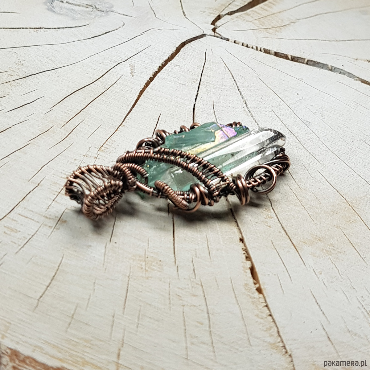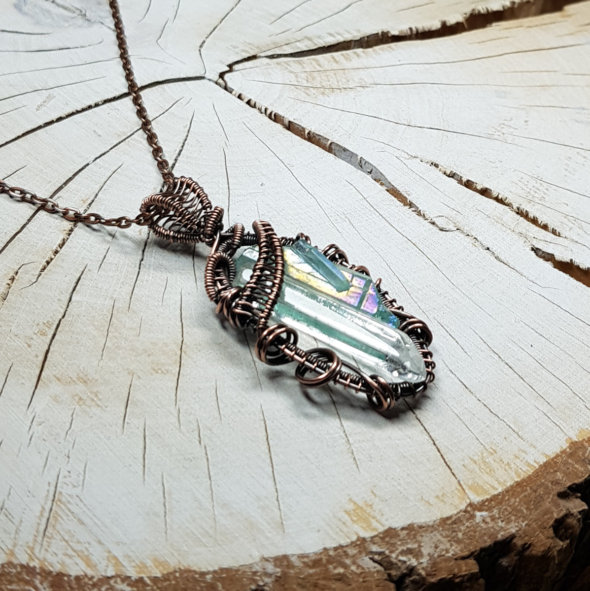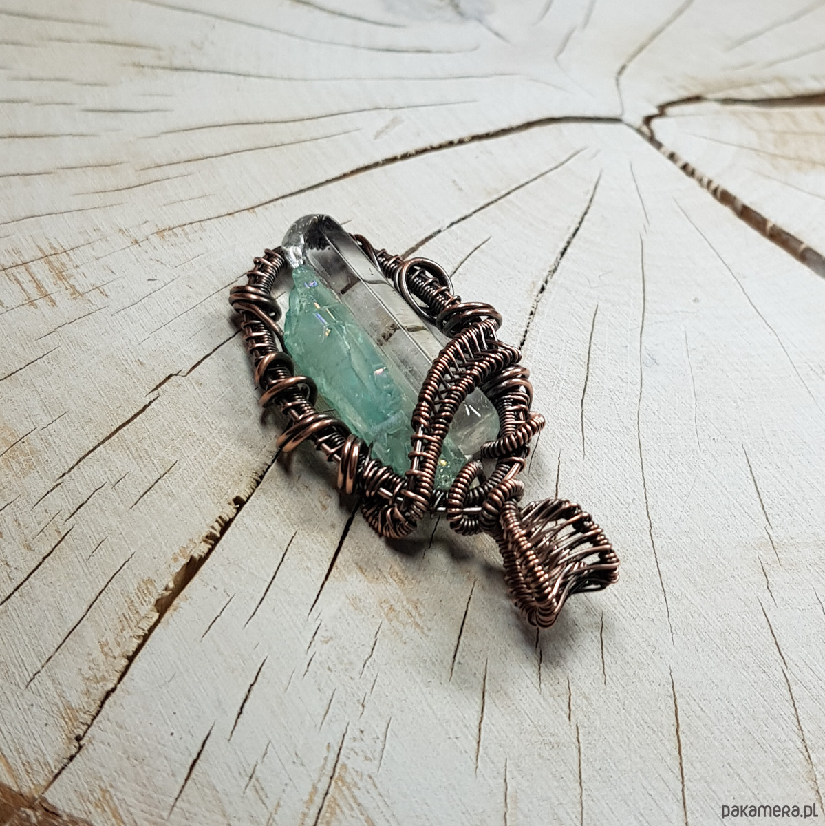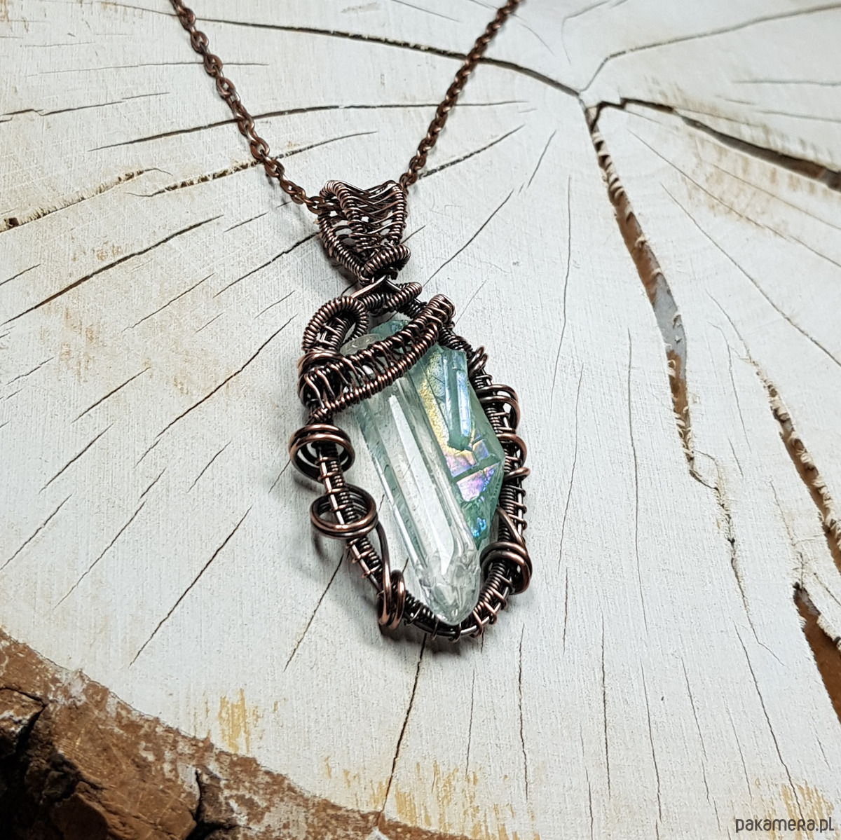 Zawieszka wykonana ręcznie metodą wire-wrappingu z dwóch sopli kryształu górskiego. Jeden kryształ naturalny, drugi to jasno błękitny kryształ aura zwany anielskim dzięki delikatnej poświacie mieniącej się cudownym blaskiem we wszystkich kolorach tęczy, przywodzącym na myśl anielskie skrzydła . Do wykonania wisiorka użyłam miedzianego drutu który następnie przyciemniłam oksydą i wypolerowałam w celu uzyskania efektu szlachetnego postarzenia . Zawieszka ma wymiary 54x25mm. Na życzenie bezpłatnie mogę dołączyć łańcuszek długości około 48-50 cm lub innej .