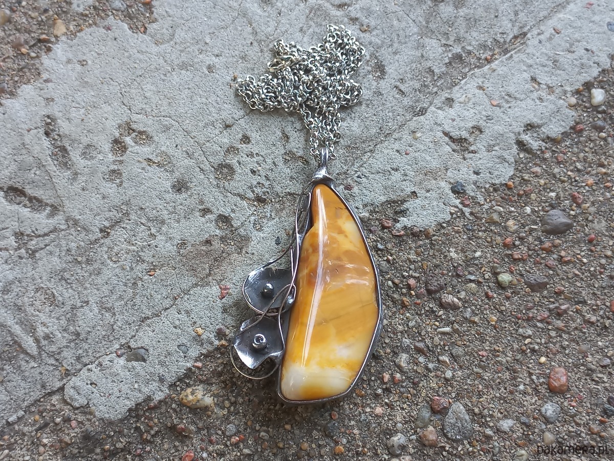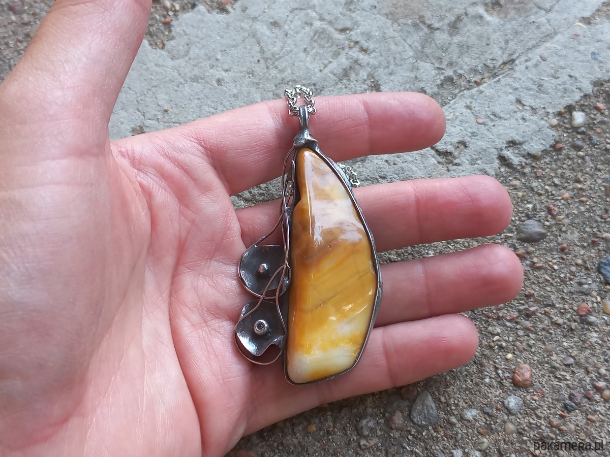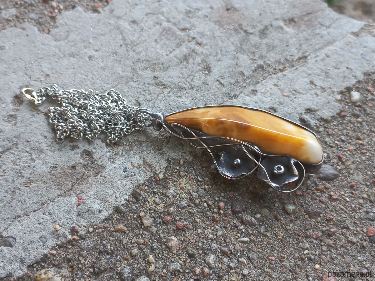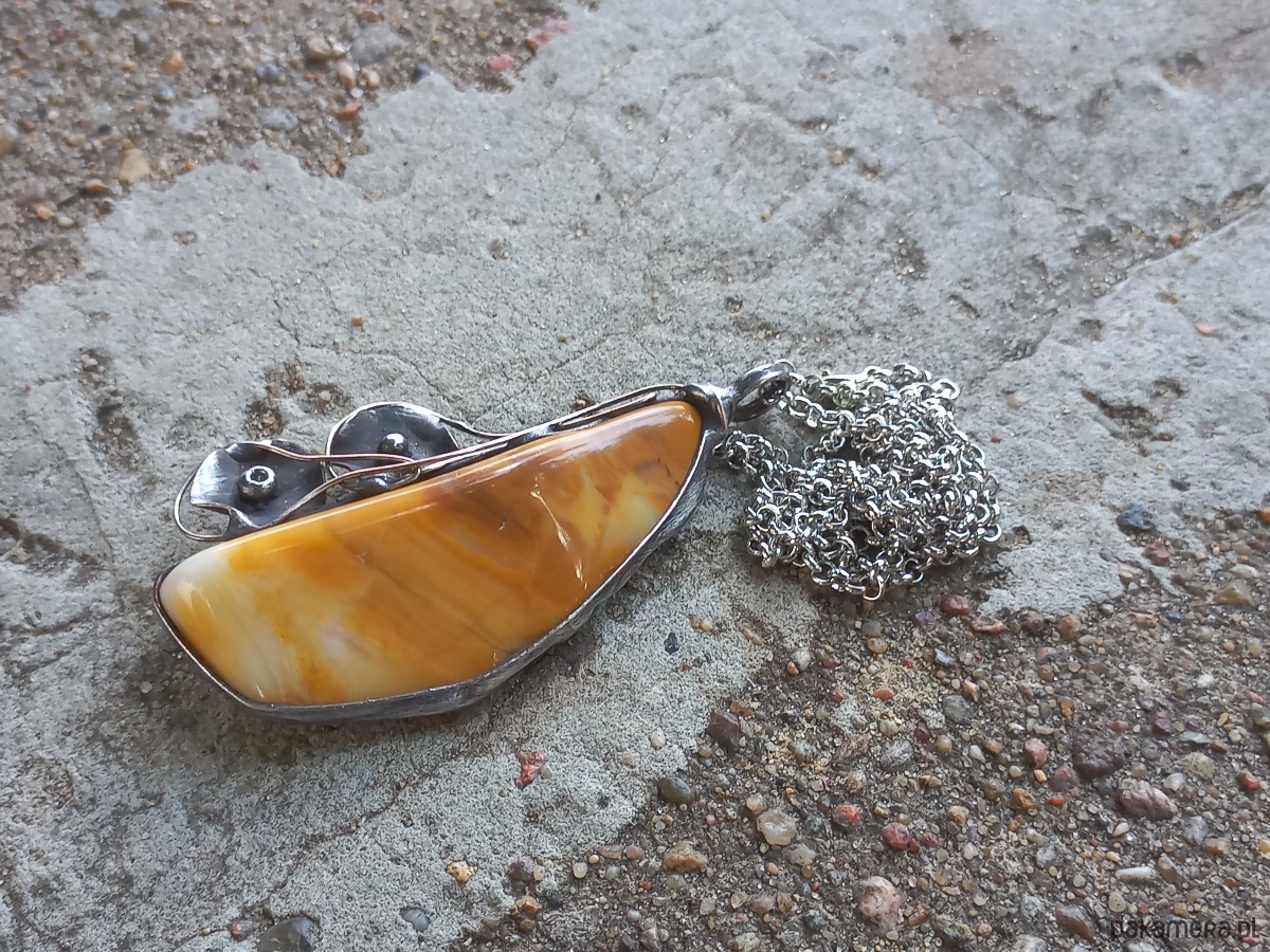 Wisiorek wykonany z miedzi, cyny i jaspisu. Wymiary ok. 6 na 3,5 cm. Zawieszony na łańcuszku o długości ok. 50 cm.