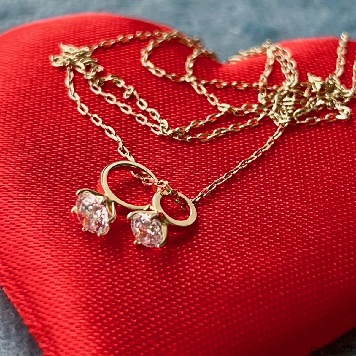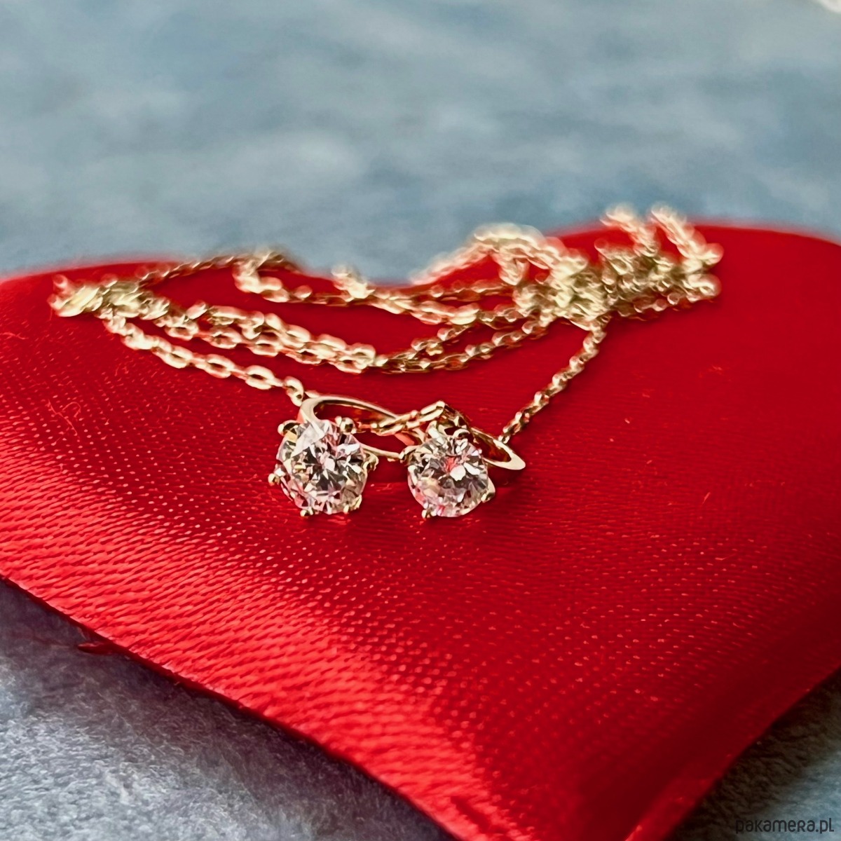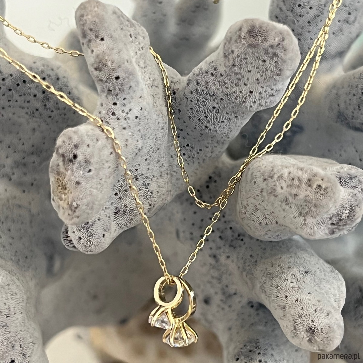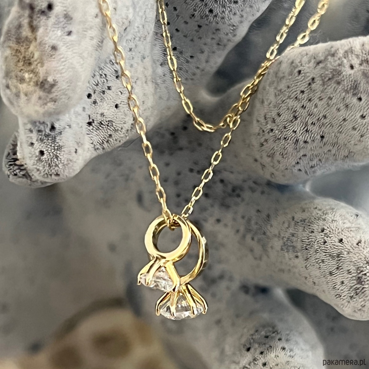 Dwa drobne pierścionki, splecione ze sobą na delikatnym łańcuszku, jak dwie historie, które spotkały się w idealnym momencie. Każdy z nich zdobi lśniąca cyrkonia, przyciągająca światło i spojrzenia subtelnym blaskiem.