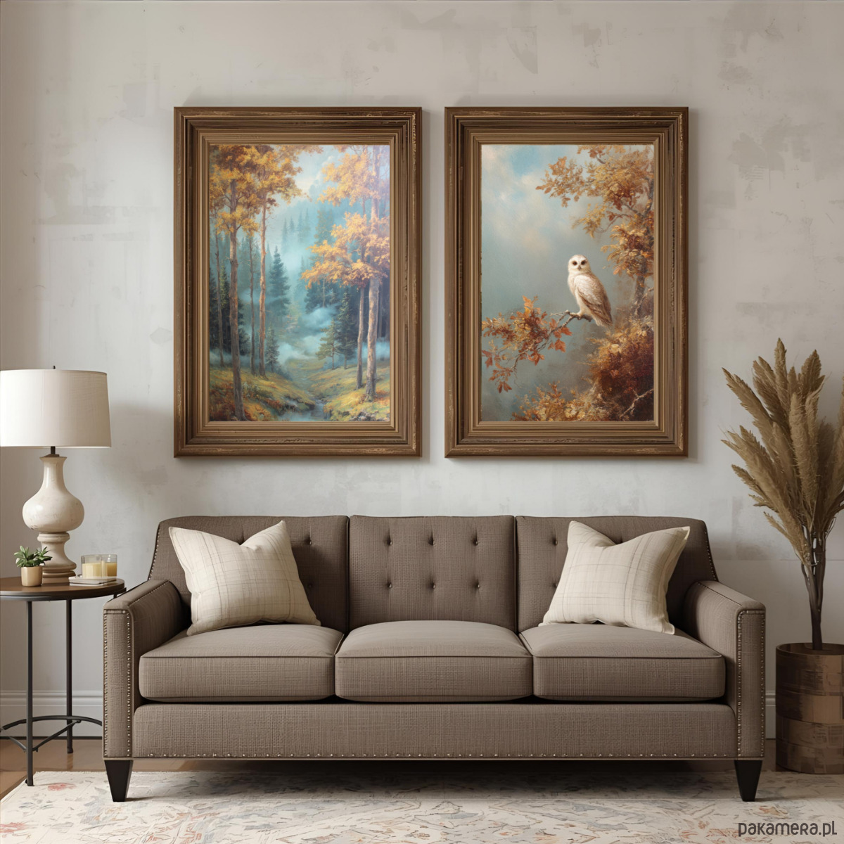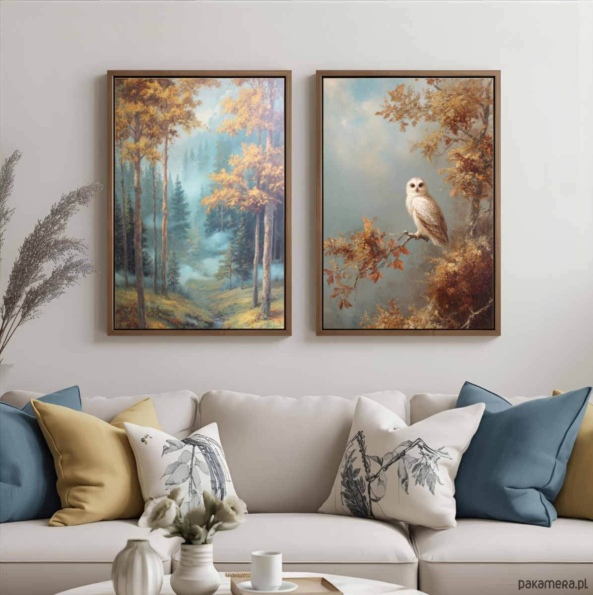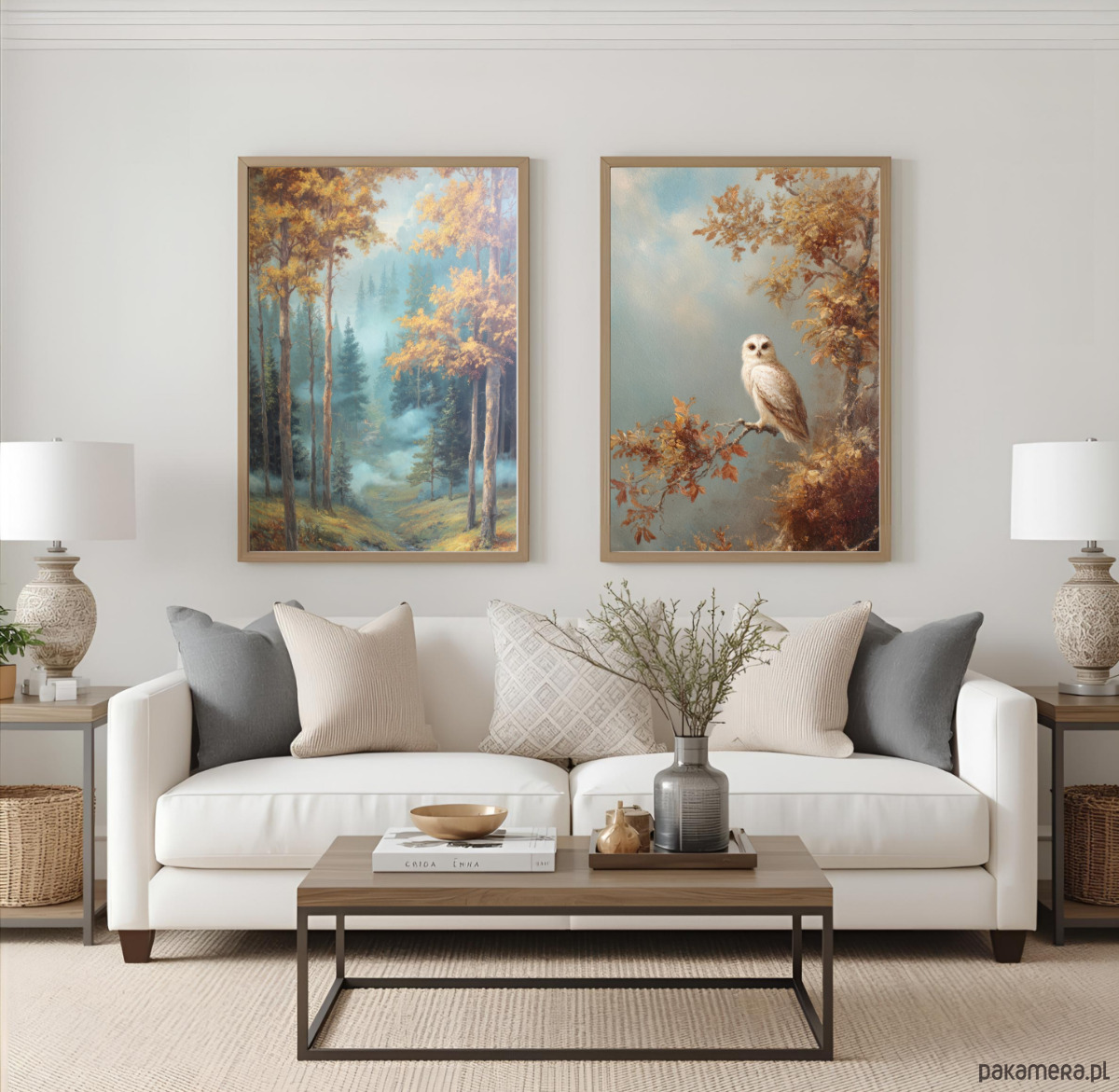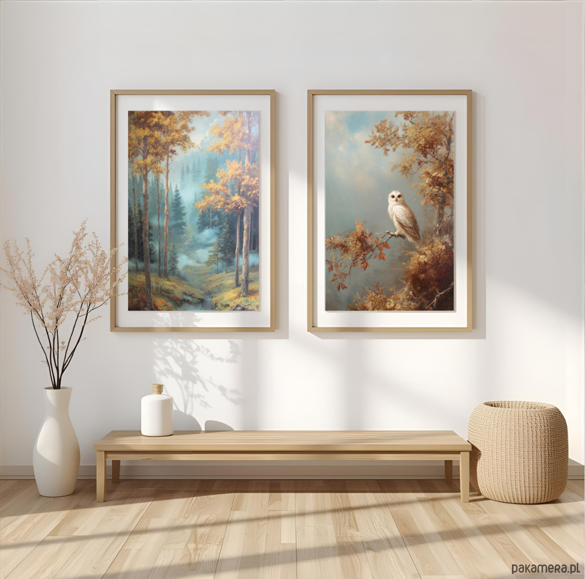 DWA PLAKATY las jesienny, drzewa, sowa, leśna dekoracja