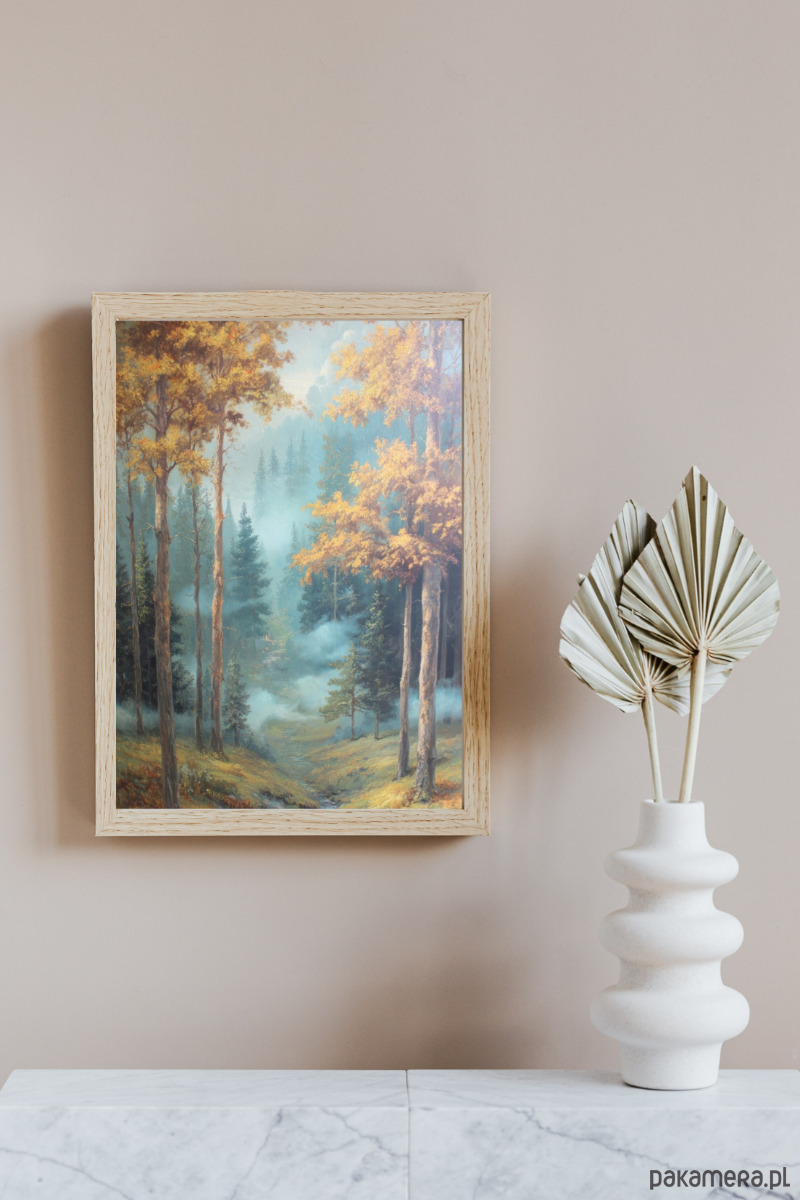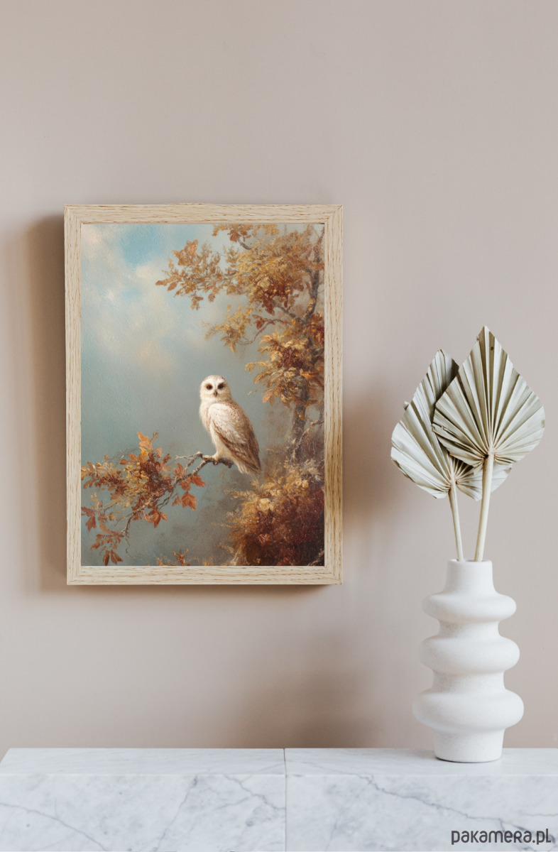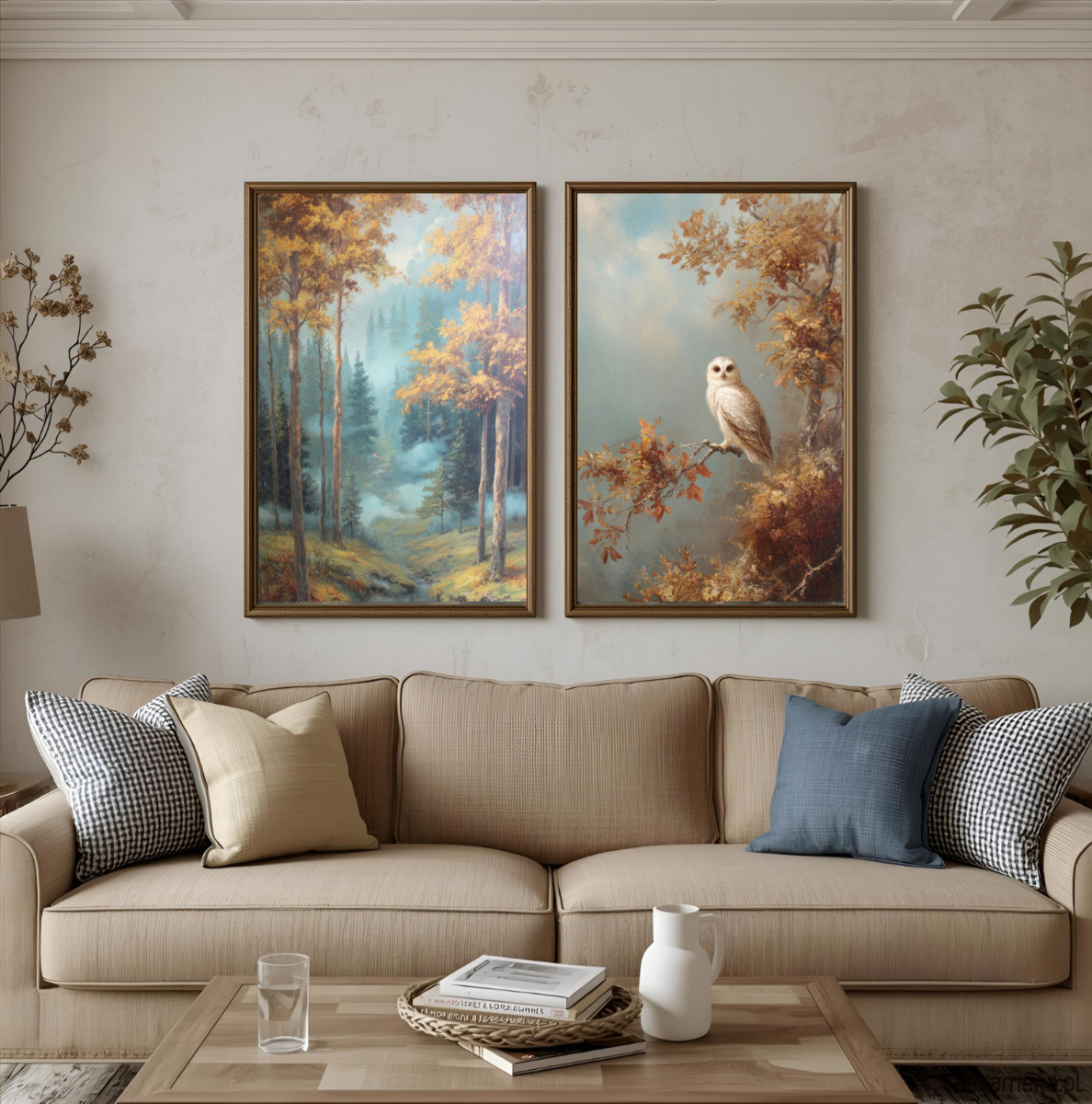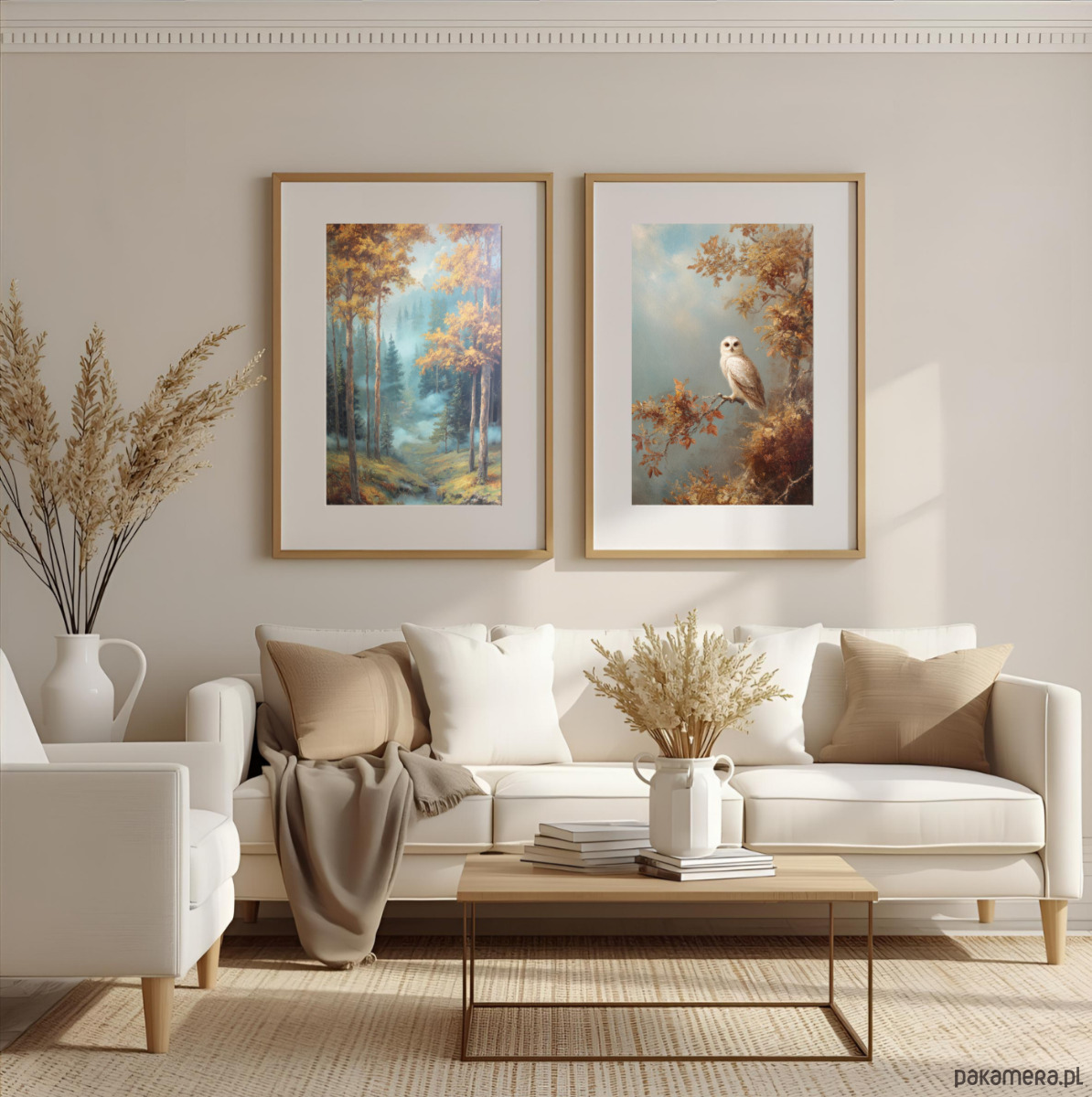 DWA PLAKATY las jesienny, drzewa, sowa, leśna dekoracja