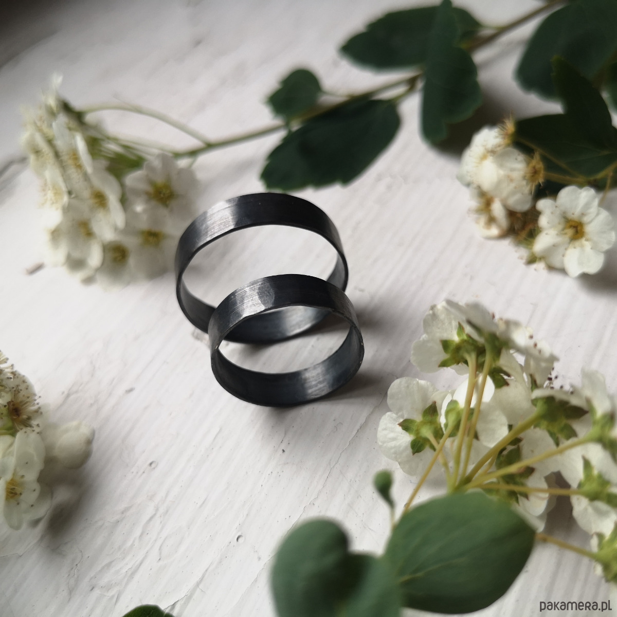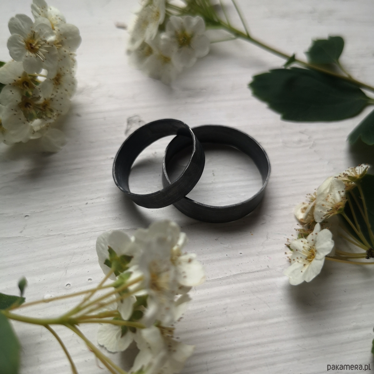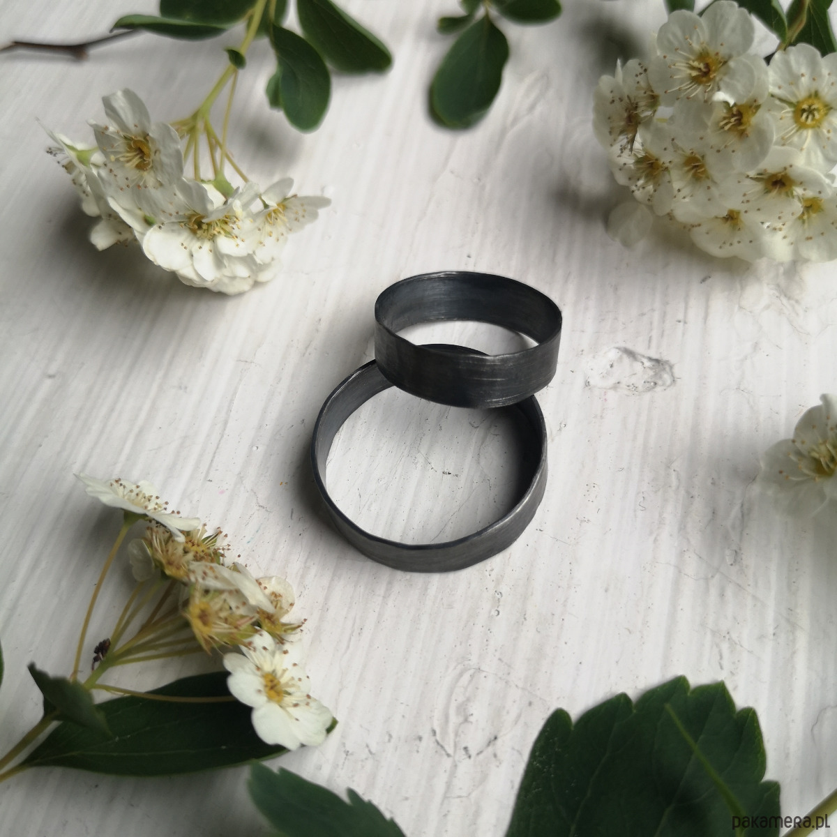 Dwie obrączki wykonane ze srebra, młotkowane (nieco nieregularna faktura), oksydowane,