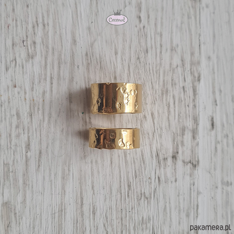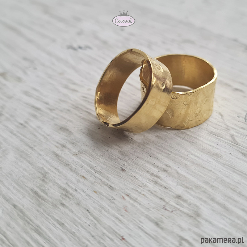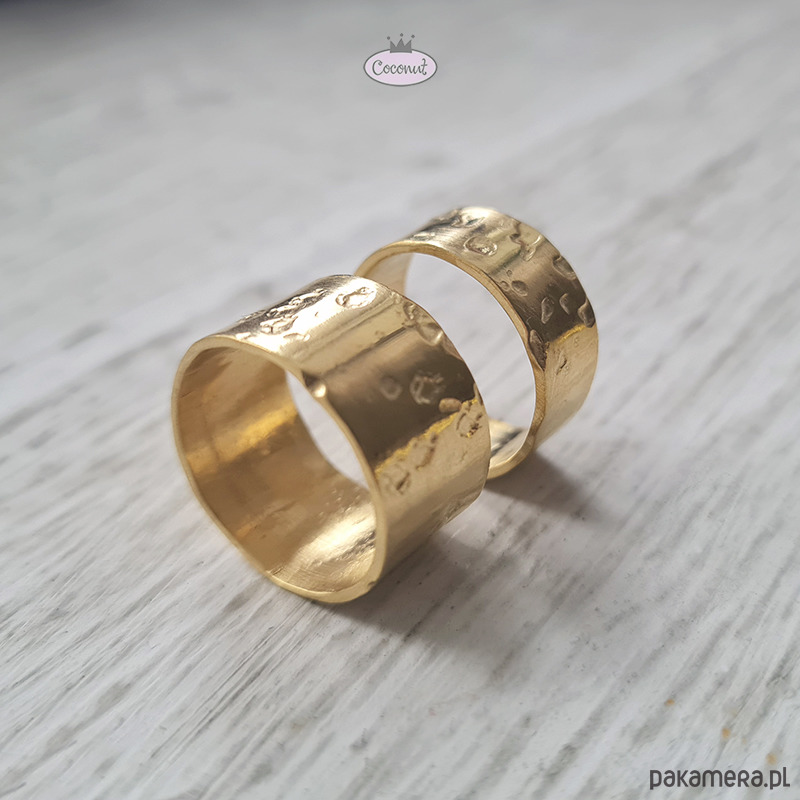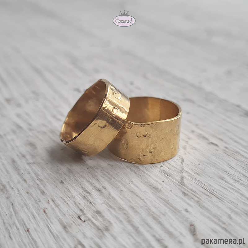Dwie obrączki wykonane ręcznie i młotkowane (nieregularna powierzchnia), satynowane, o szerokości ok. 5 oraz 10 mm.