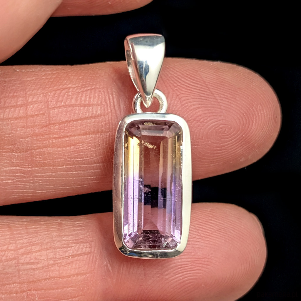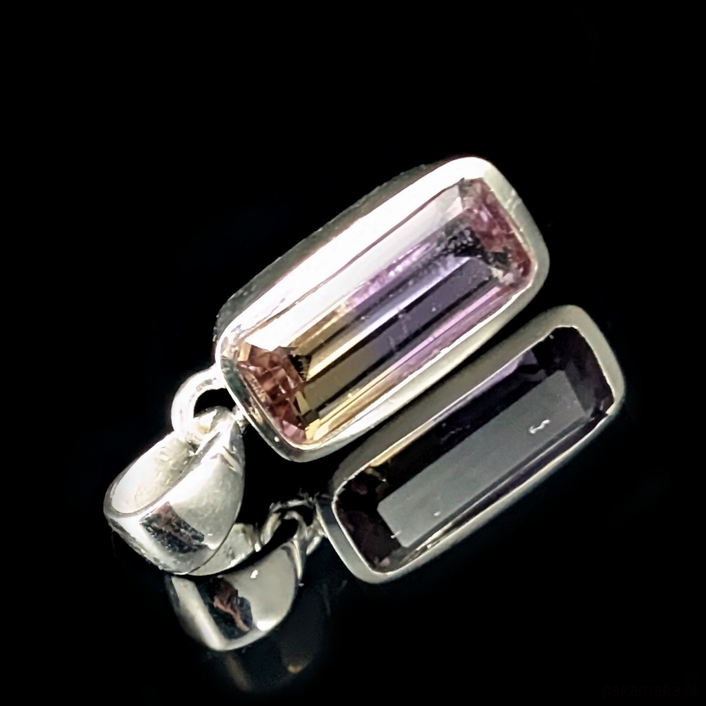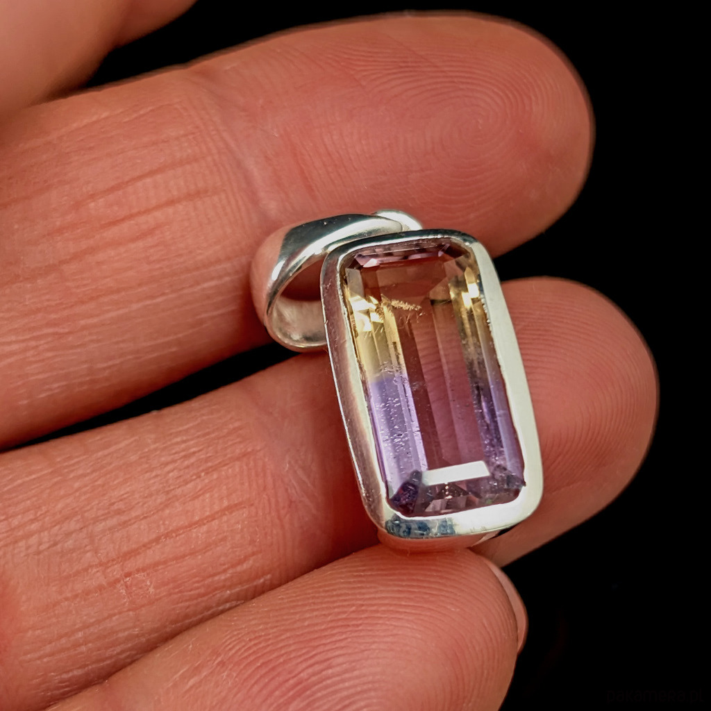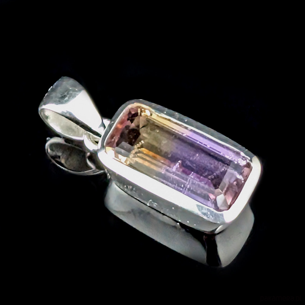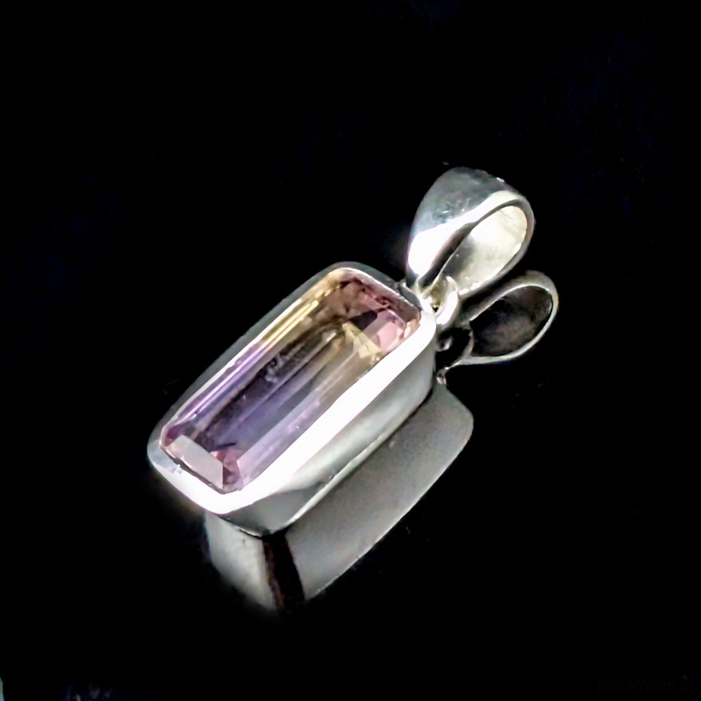 Szlachetny wisiorek wykonany ze srebra próby 925 oraz pięknego ametrynu o pasteloeych barwach. Ten piękny minerał to odmiana kwarcu, będąca połączeniem ametystu i cytrynu, okaz bardzo przejrzysty, szlifowany. Wymiary oprawy 18 x 8 mm. Długosc max 27 mm, waga 4,8 grama. Wykonany przez dostawcę kamieni.