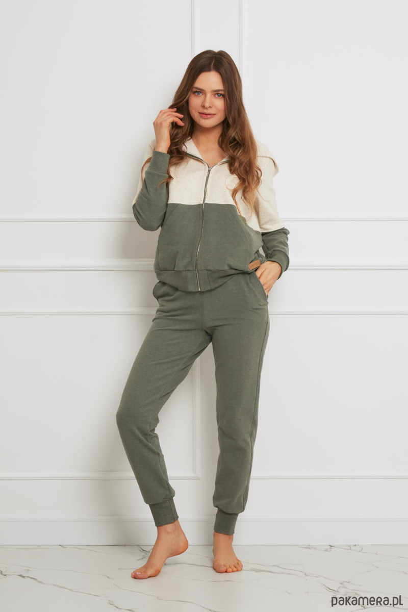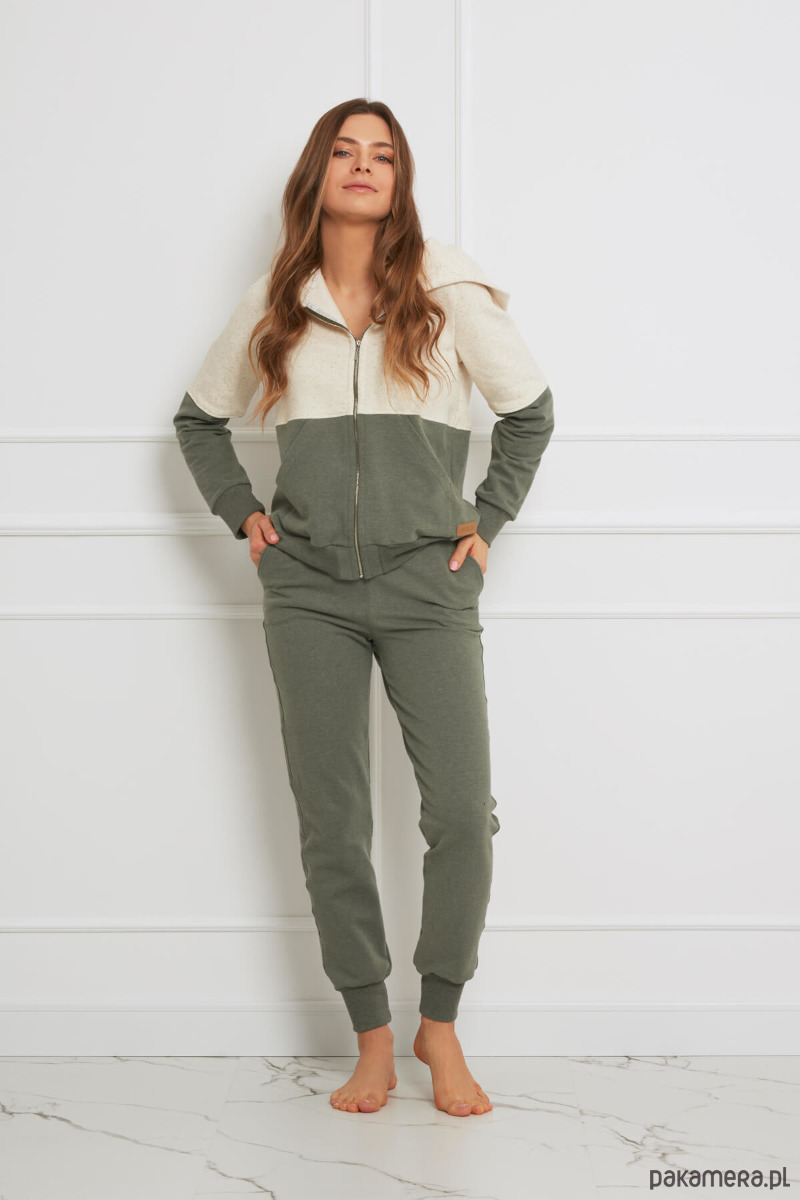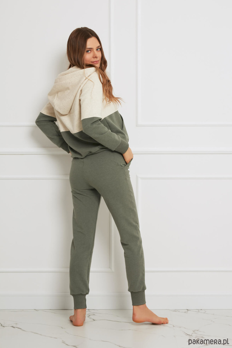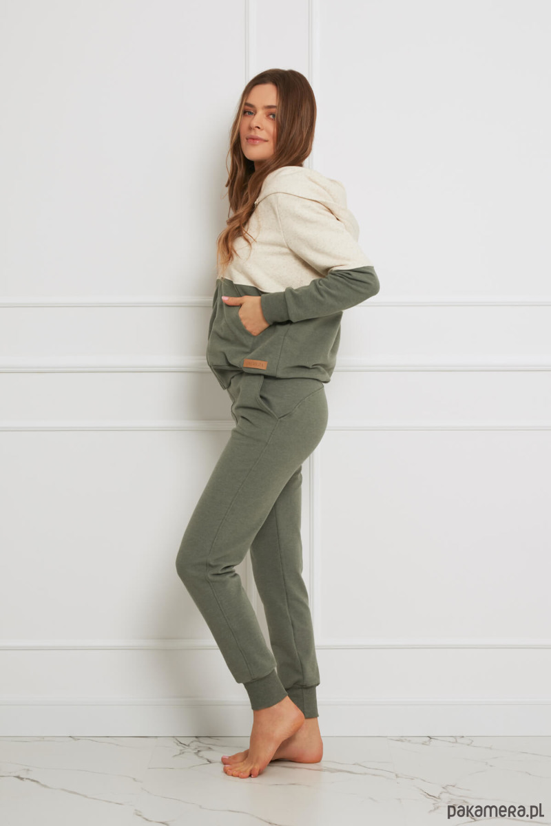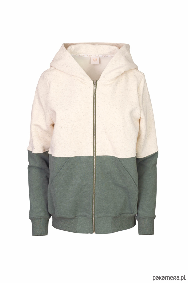 Uszyta z połączenia dzianin w odcieniach beżowego i zielonego melanżu. Góra z grubszej dzianiny z dodatkiem włókien konopnych. Dzianina drapana od środka sprawia, że przy ciele jest bardzo miła i ciepła, ale zarazem daje skórze oddychać. Dzięki mieszance organicznej bawełny i konopi miękka i przyjazna dla skóry także wrażliwej, oddychająca. Dodatek poliestru nadaje elastyczności.