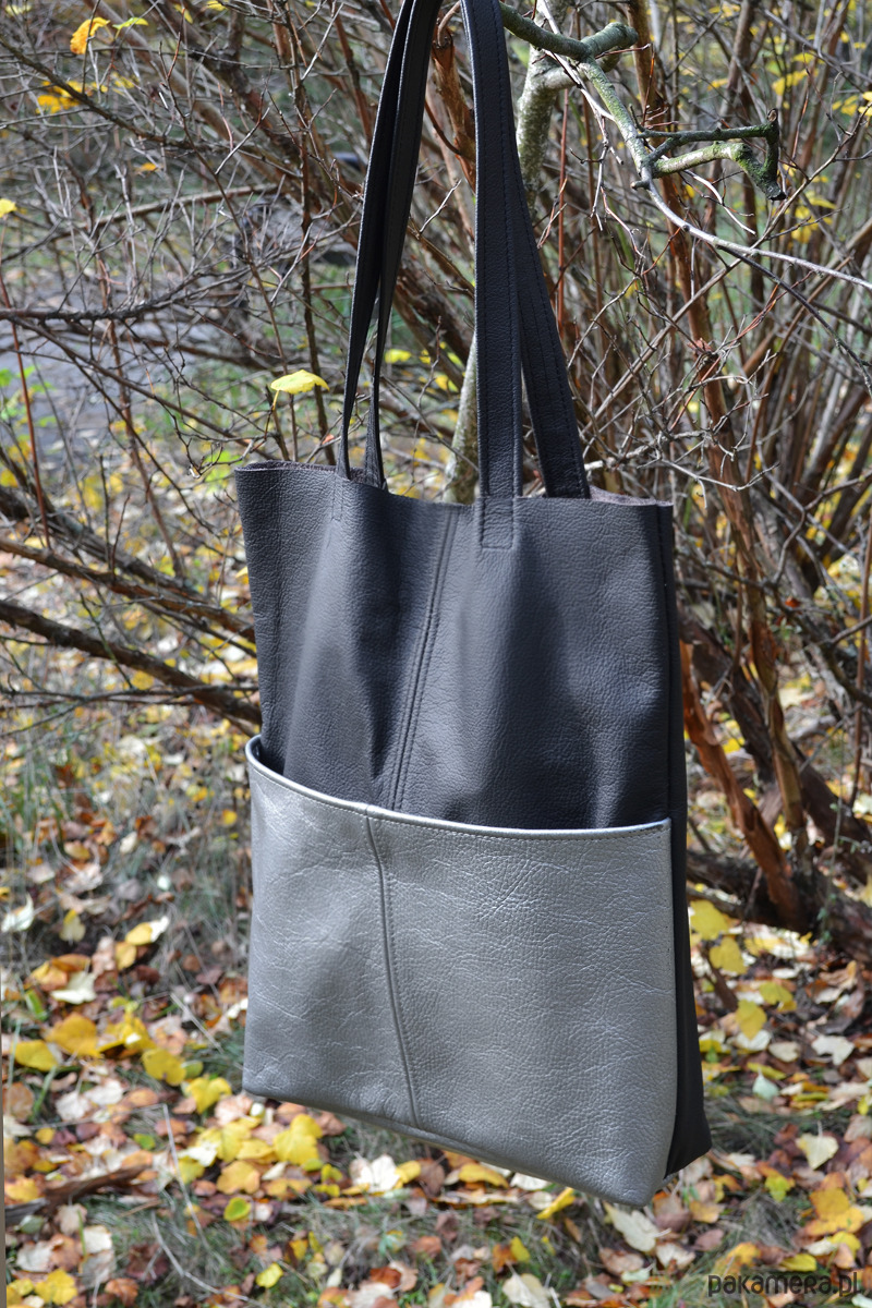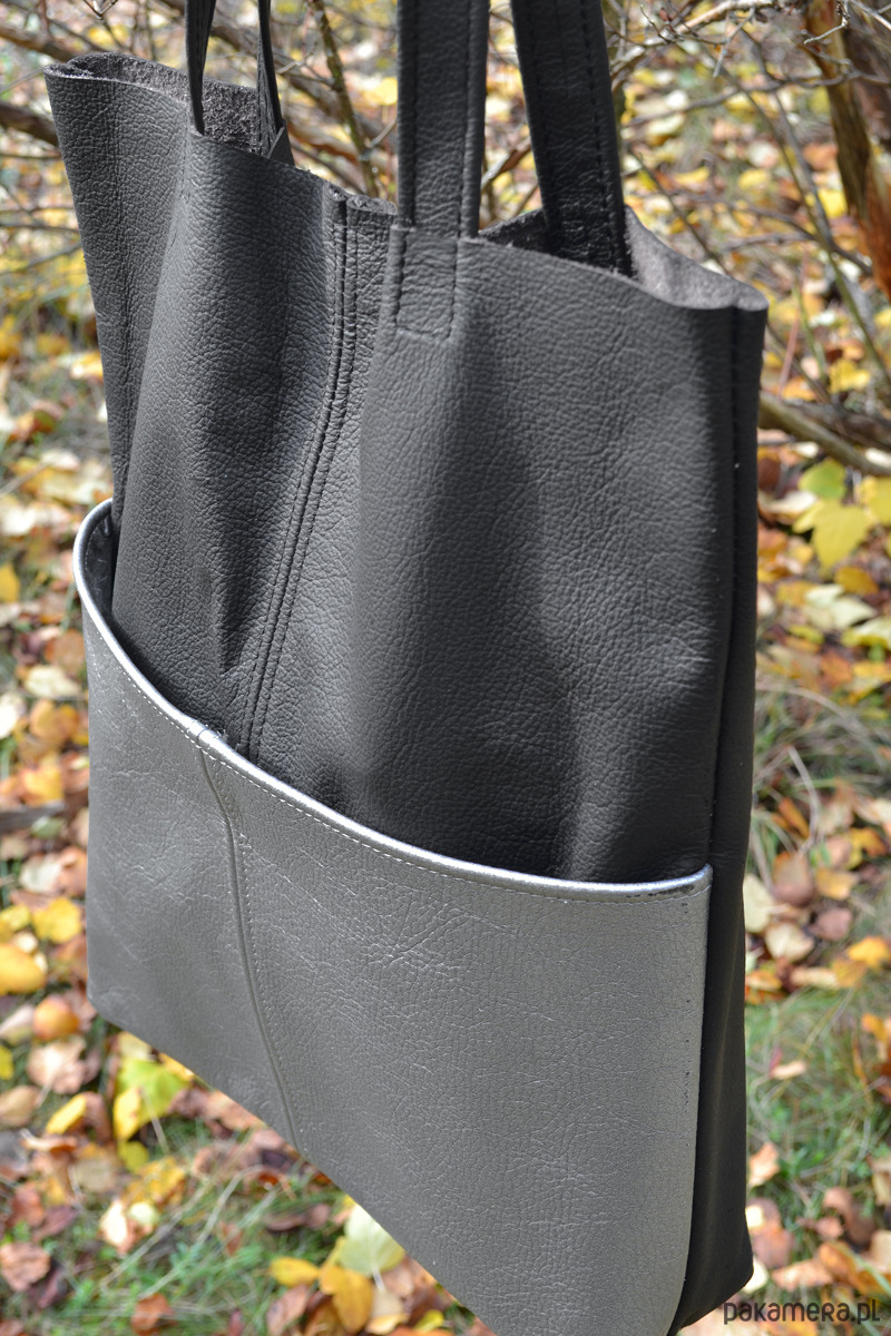 Torebka na ramię wykonana z dwóch kolorów skóry - bazowej czarnej i srebrnej (duża kieszeń na magnes).