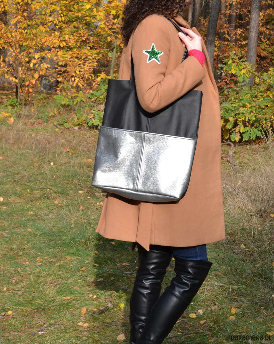 Torebka na ramię wykonana z dwóch kolorów skóry - bazowej czarnej i srebrnej (duża kieszeń na magnes).