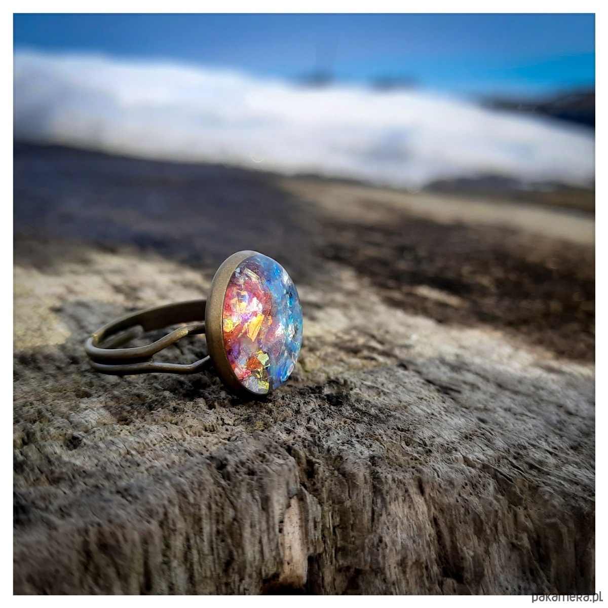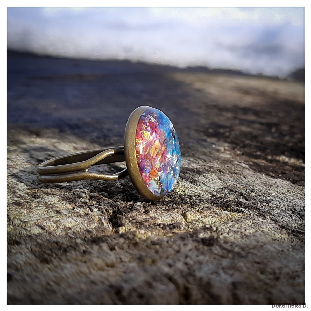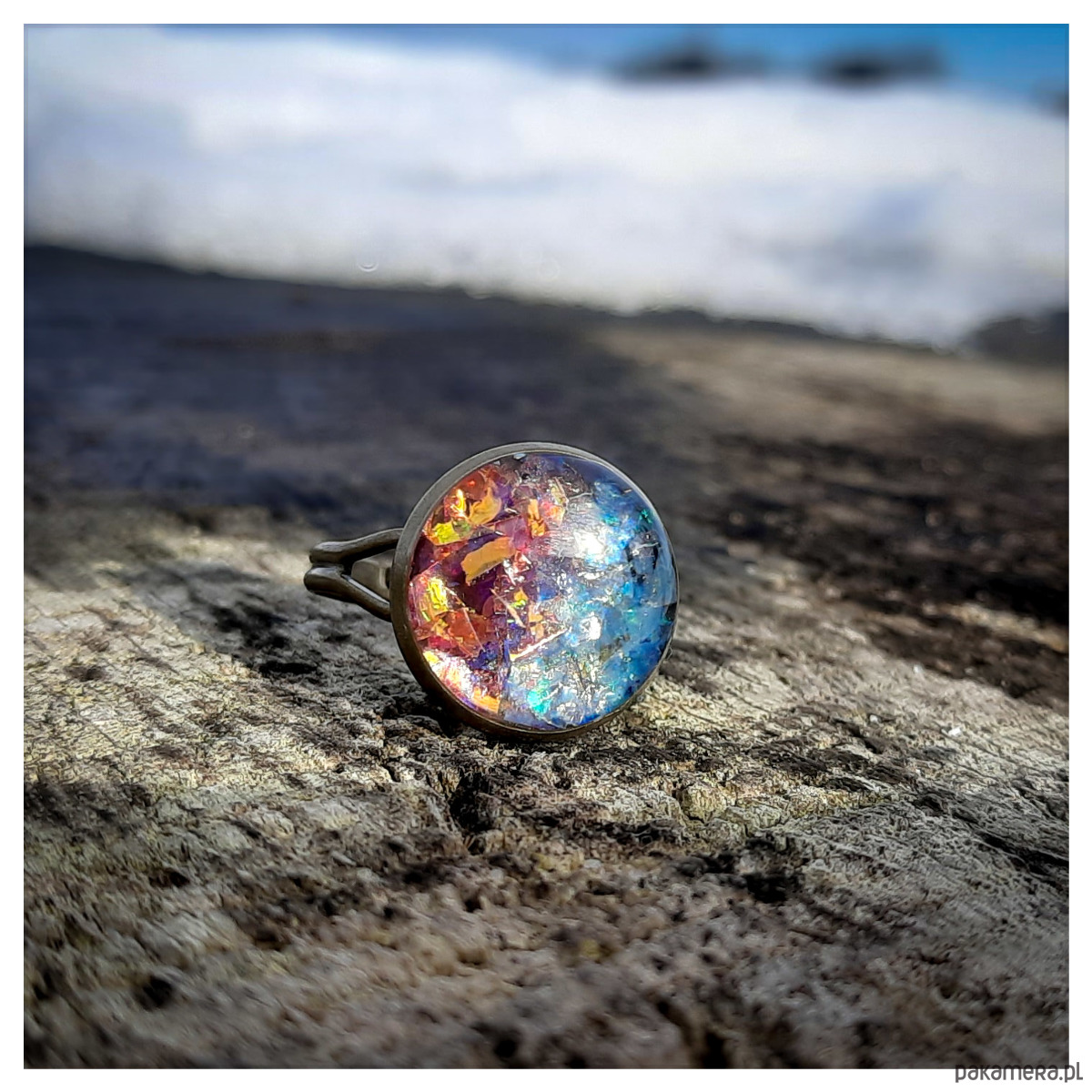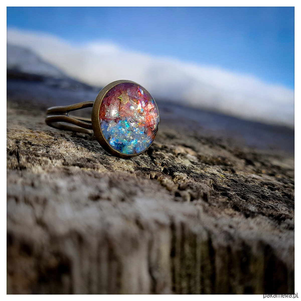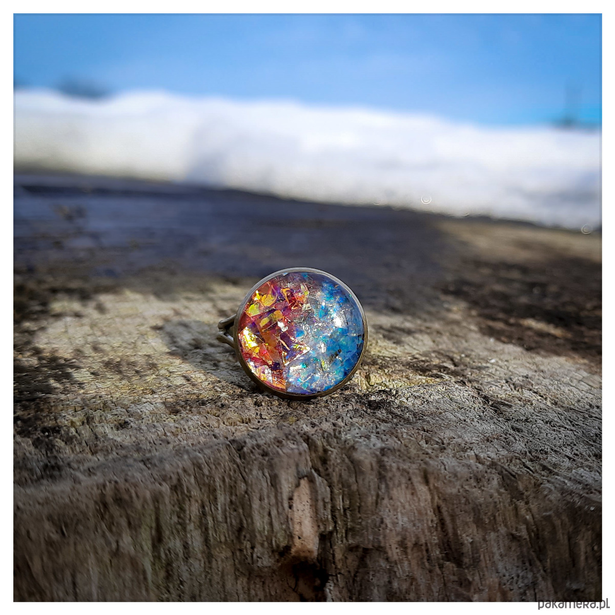 Pierścionek z zatopionymi w żywicy epoksydowej drobinkami brokatu w kolorze niebieskim i czerwonym