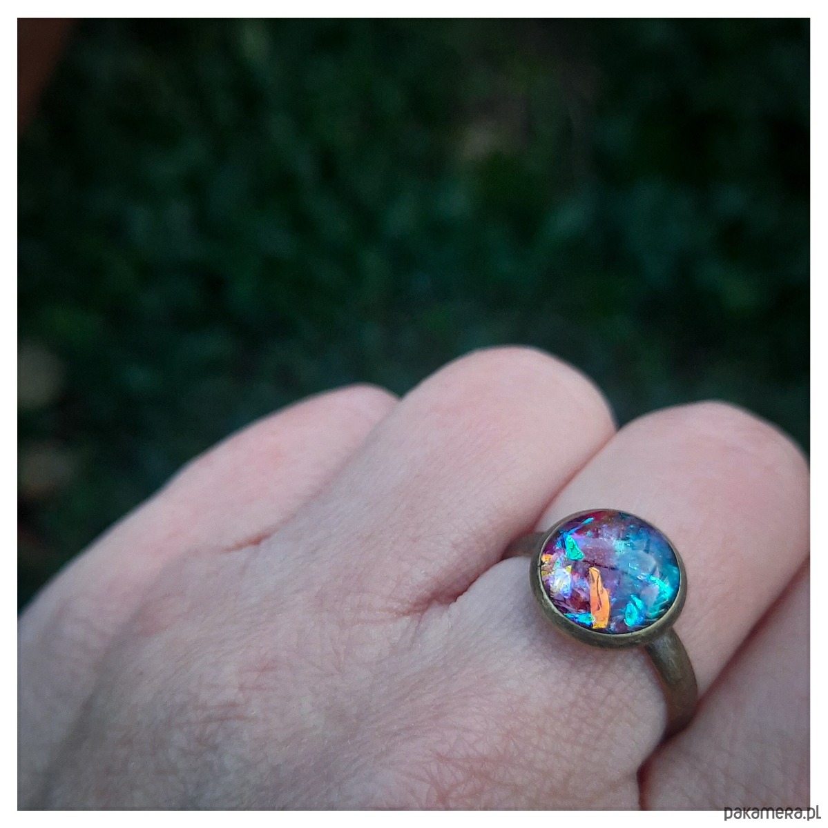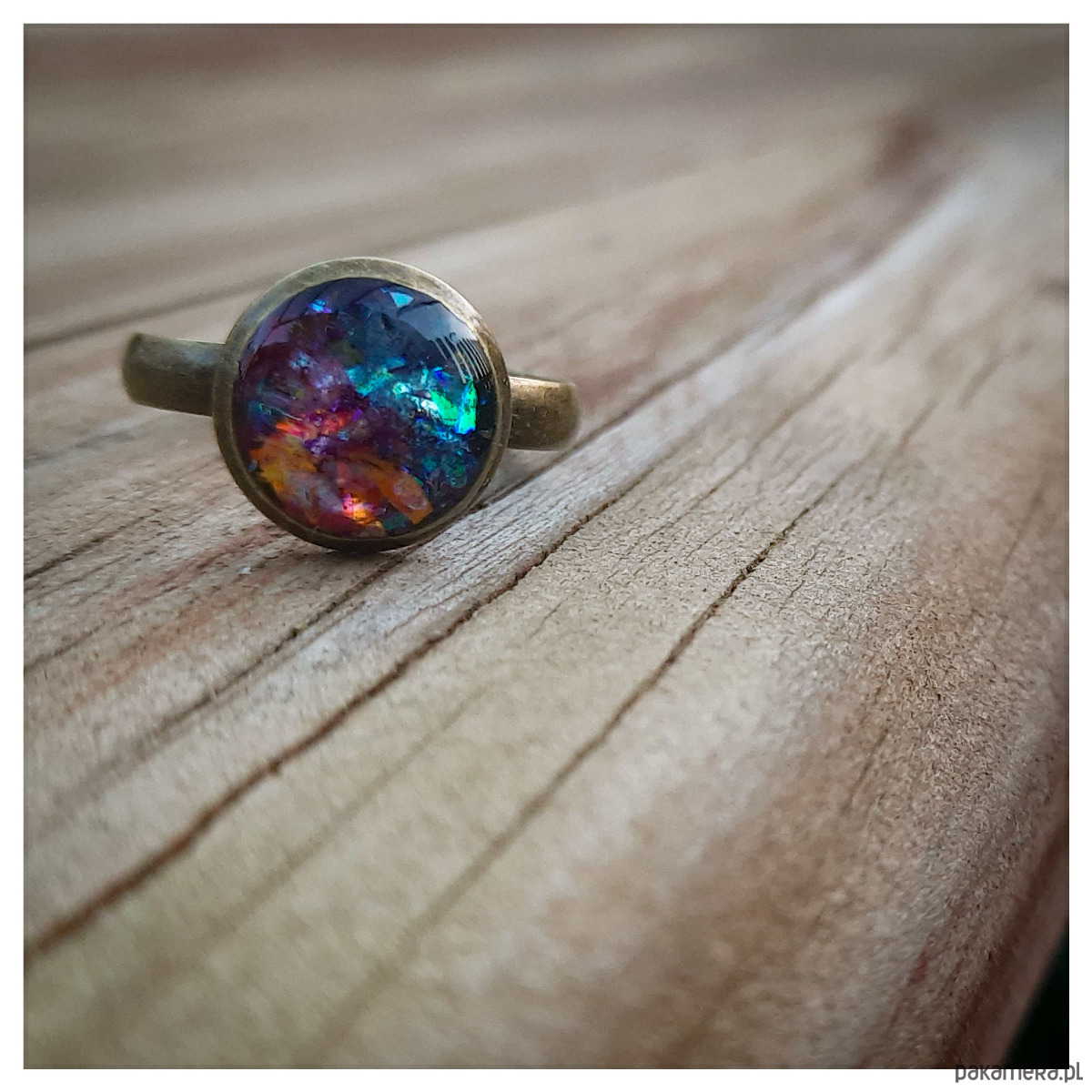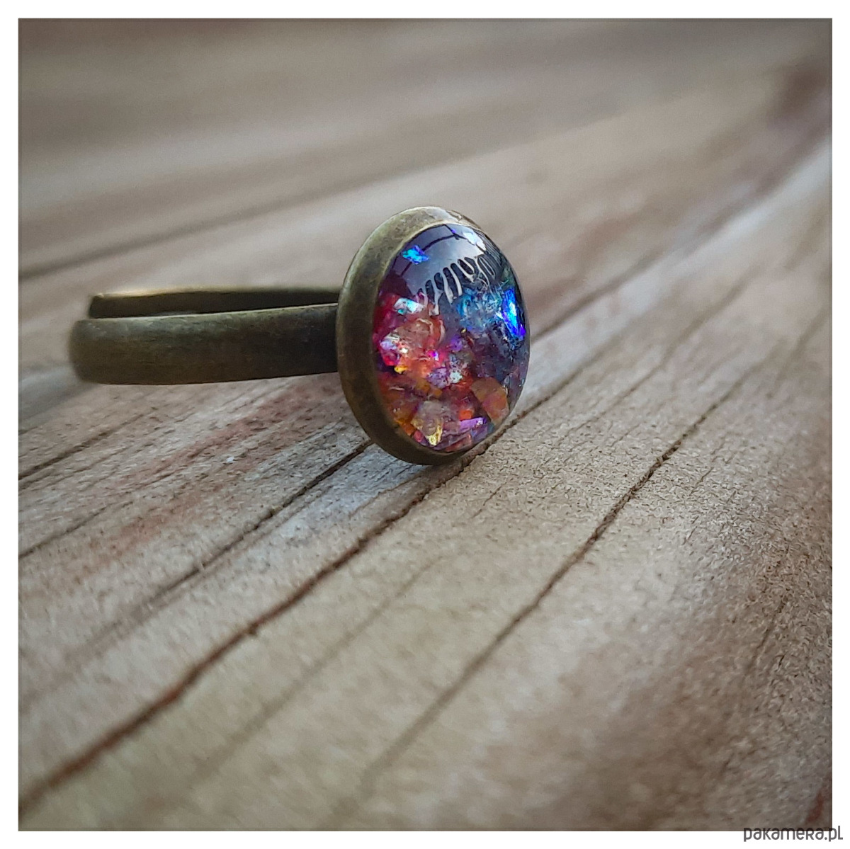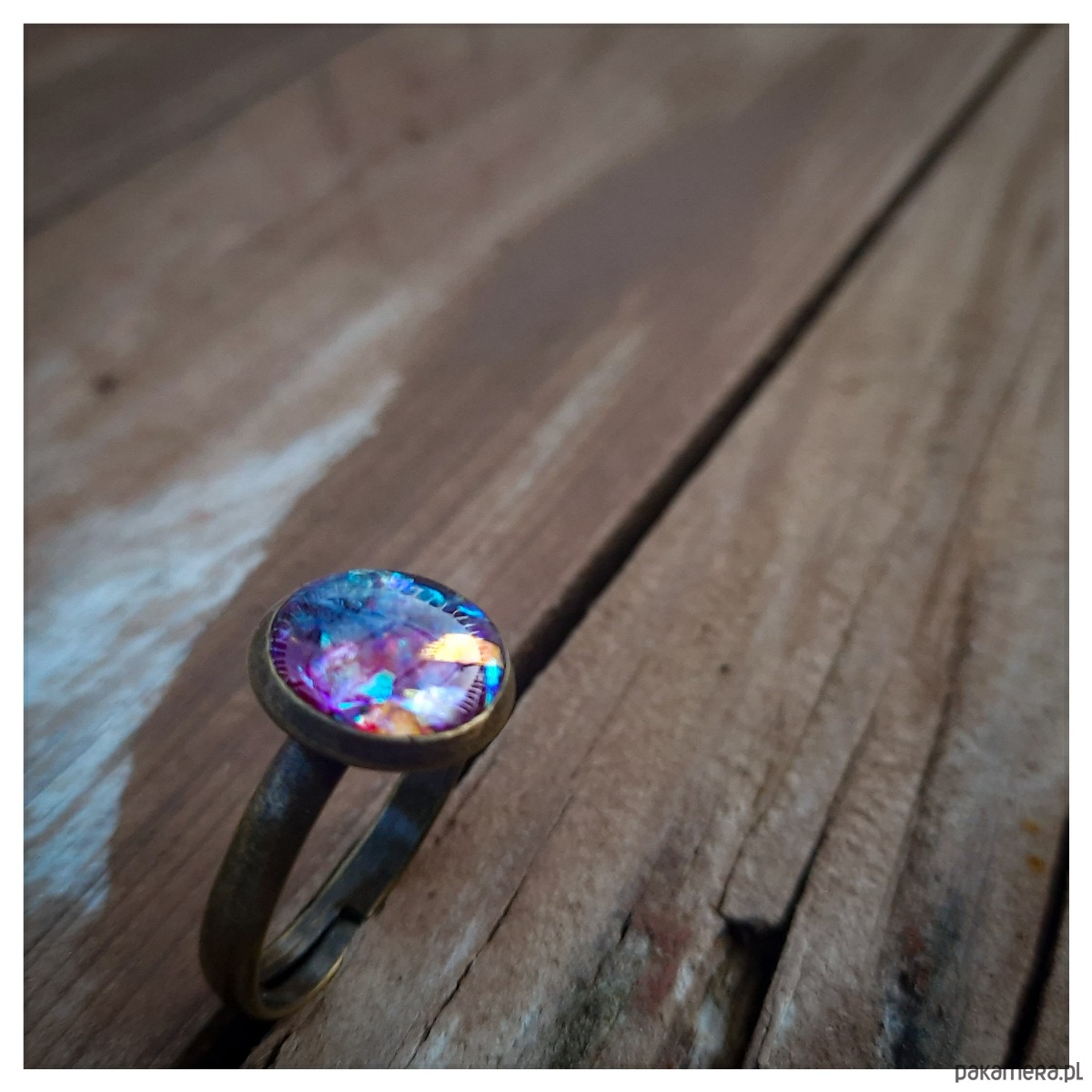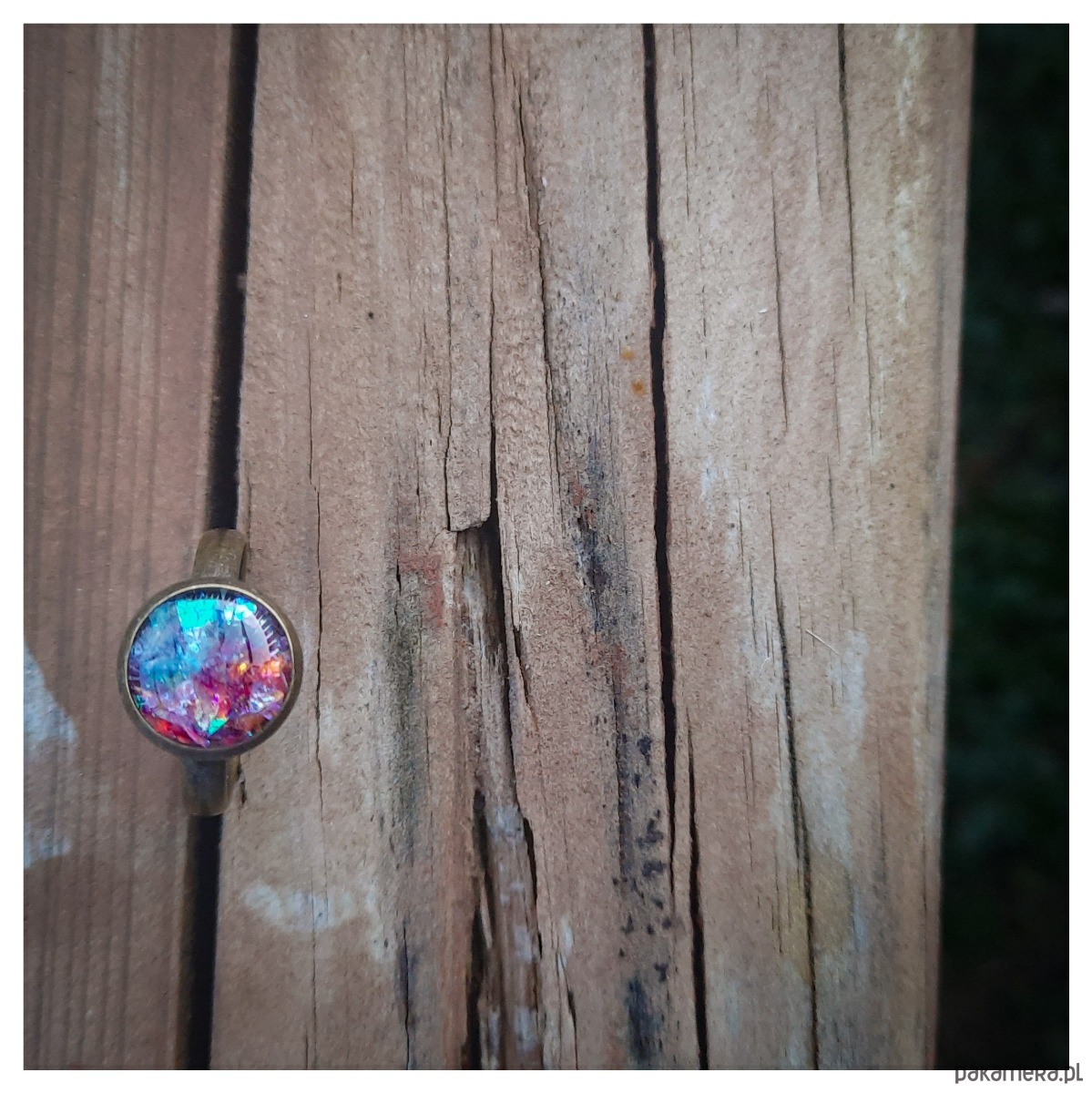Pierścionek z zatopionymi w żywicy epoksydowej drobinkami brokatu w kolorze niebieskim i czerwonym