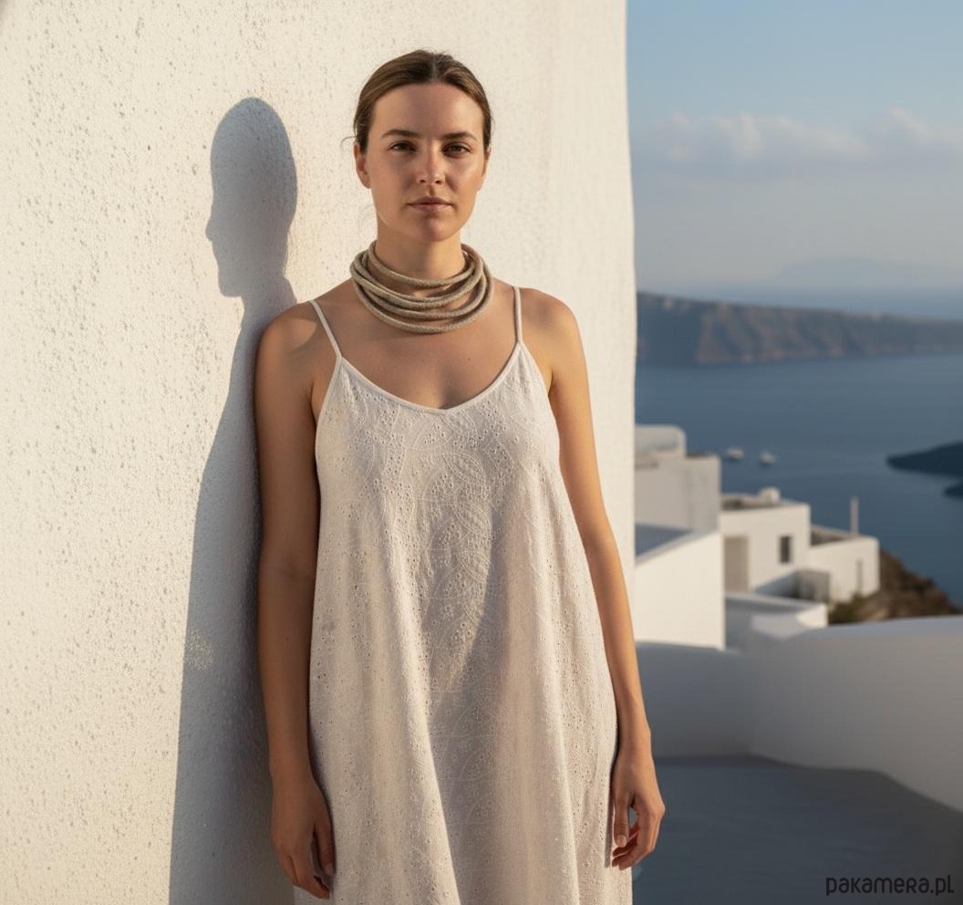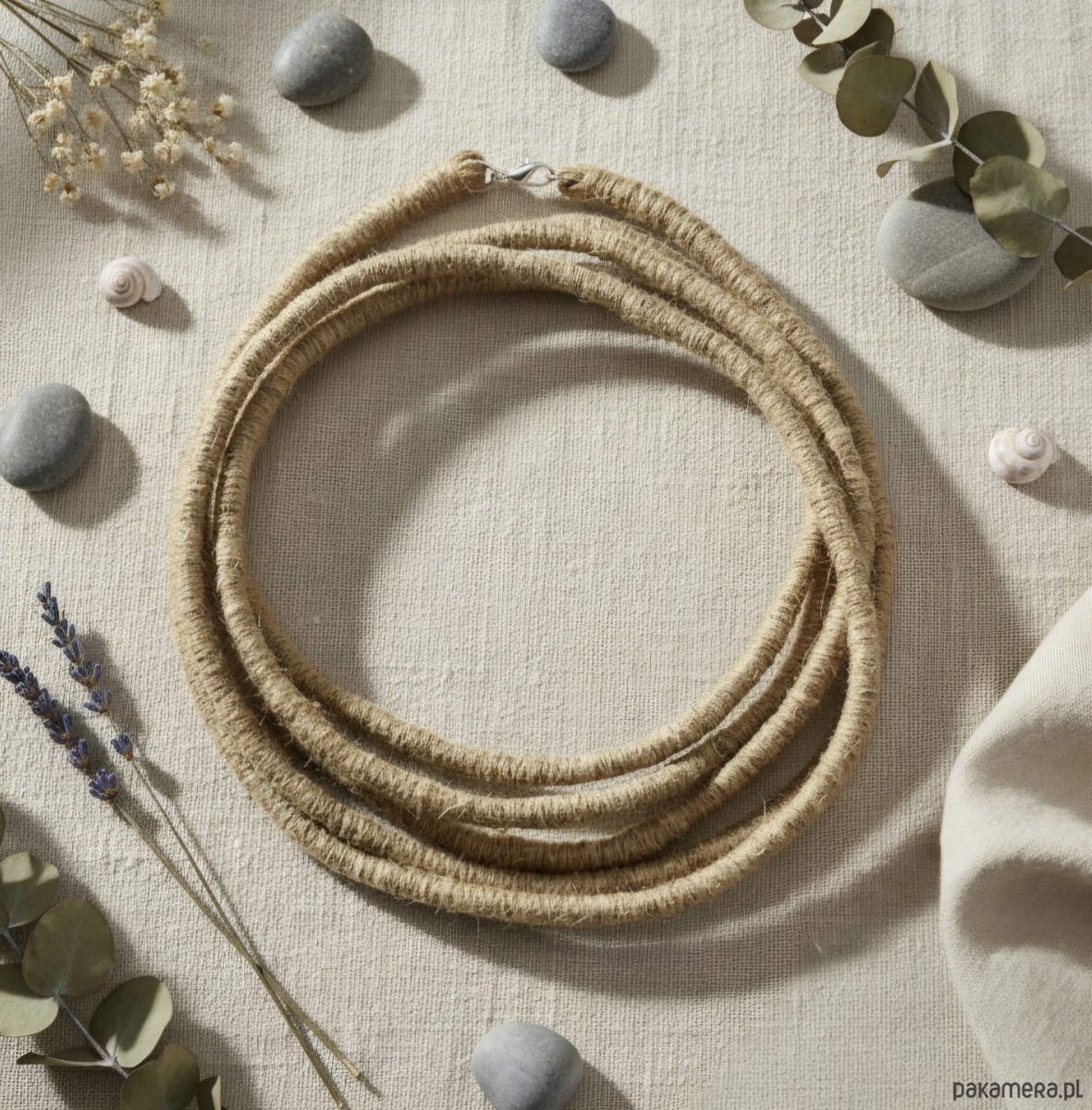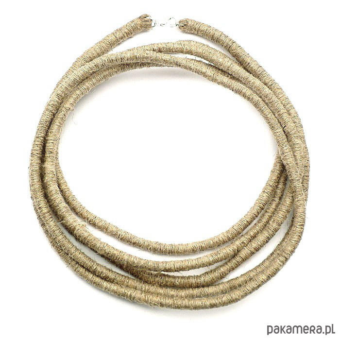 Oryginalny naszyjnik wykonany z naturalnych nitek lnianych. Bardzo długi, ma ponad dwa metry długości, oplata szyję kilkukrotnie