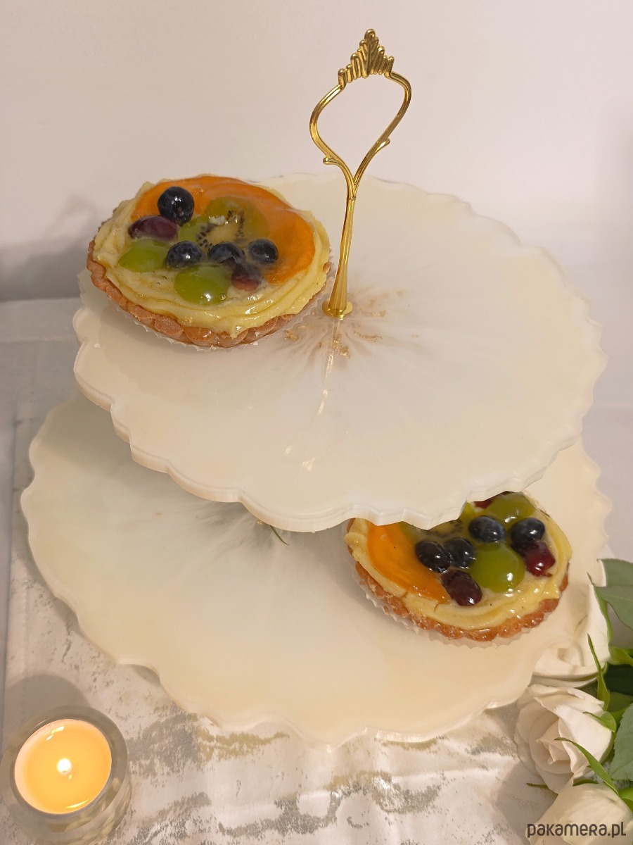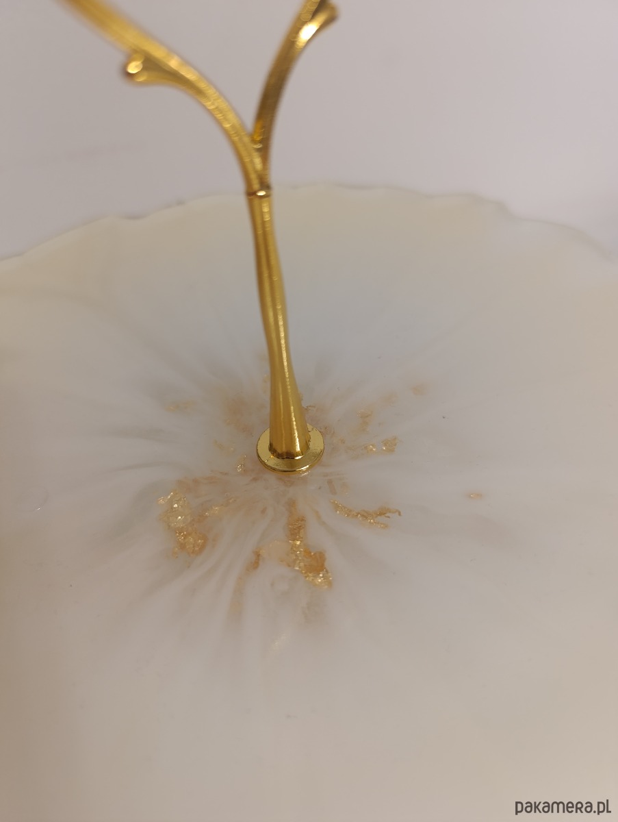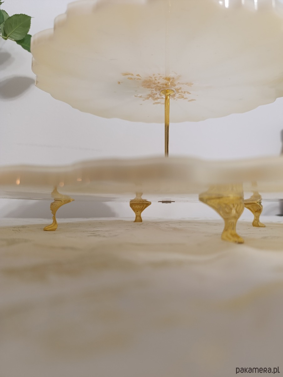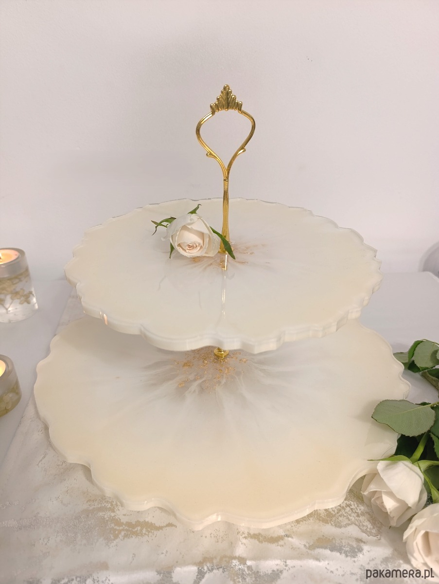 Wyjątkowa, ręcznie wykonana dwupoziomowa patera z wysokiej jakości żywicy epoksydowej w delikatnym odcieniu kości słoniowej. Subtelne, półprzezroczyste przejścia kolorów oraz złote akcenty w centrum tworzą efekt szlachetnego marmuru, a falowany brzeg nadaje całości wyjątkowego uroku. Złote okucia dodają elegancji i sprawiają, że patera staje się luksusowym akcentem świątecznego stołu.