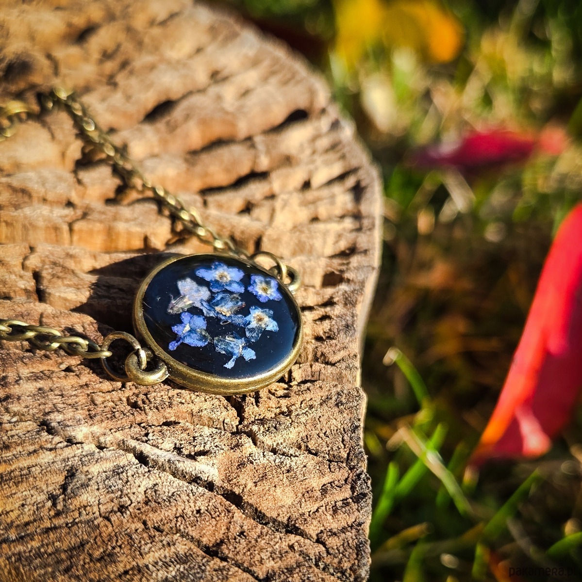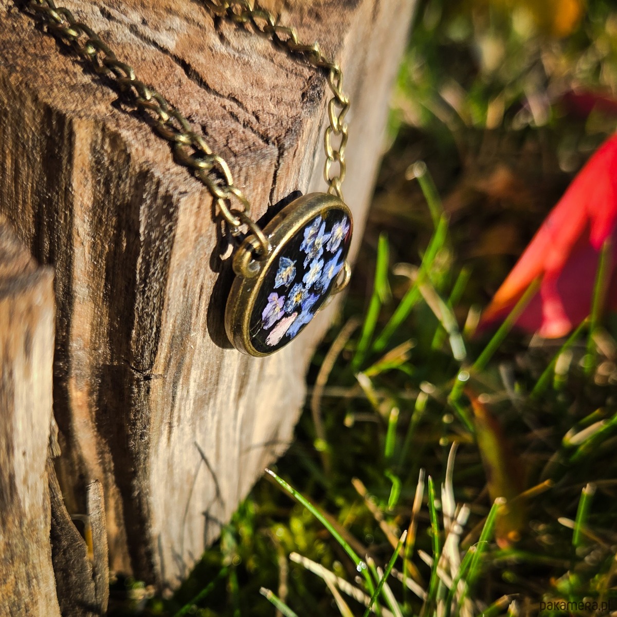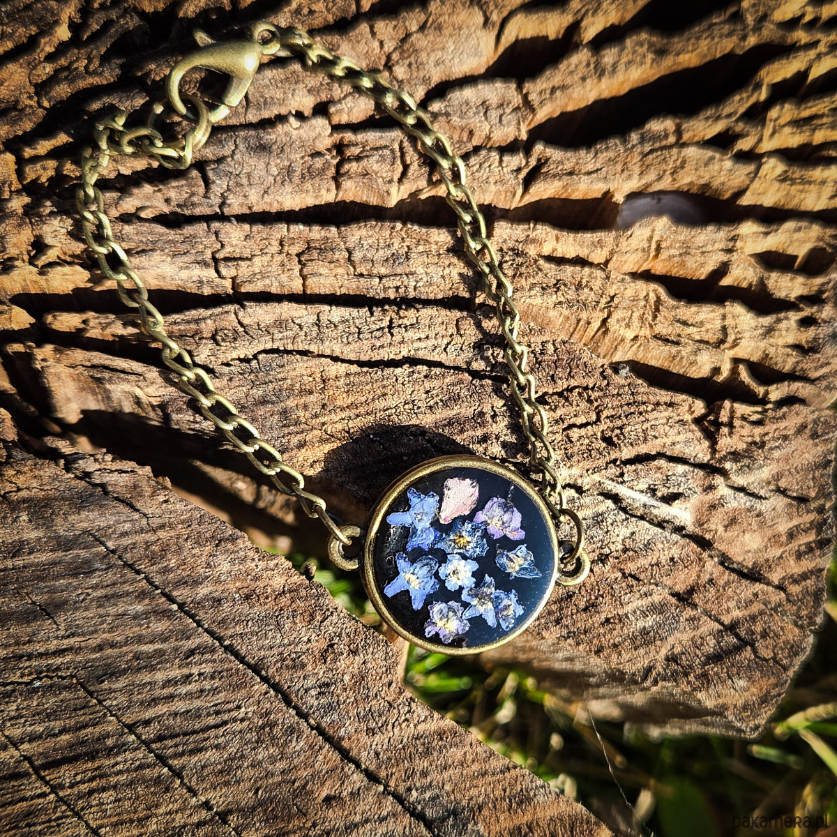 Dwustronna bransoletka z oczkiem z zatopionymi w żywicy epoksydowej niezapominajkami.