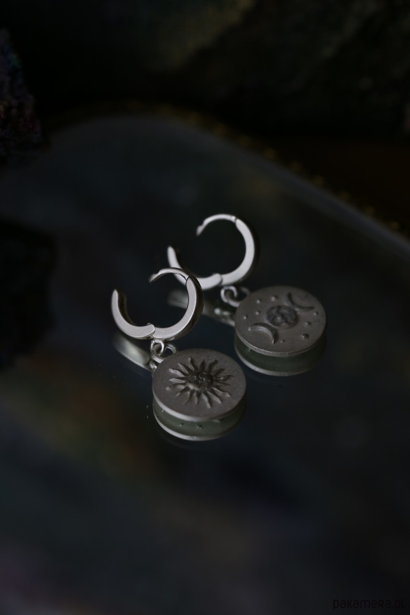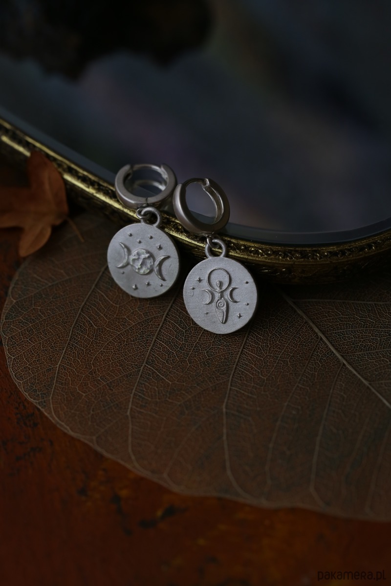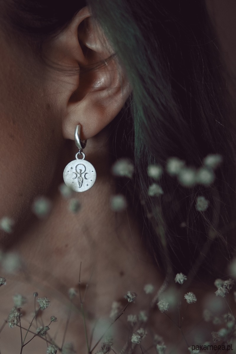 Zawieszki są dwustronne - na jednej jest wizerunek Słońca z twarzą i symbol spiralnej Bogini Płodności. Na drugiej jest sierp Księżyca i symbol Potrójnej Bogini. Kolczyki wykonane z wysokiej próby srebra 925. Srebrne bigle są zamykane, więc nie spadną z uszu w trakcie noszenia i mają kształt okręgów.