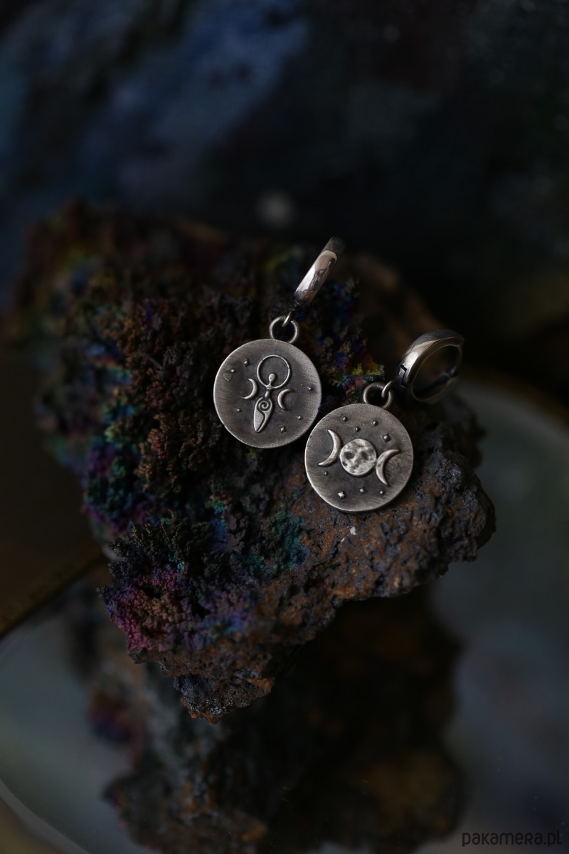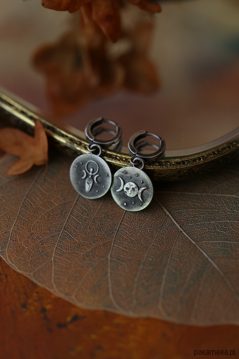 Zawieszki są dwustronne - na jednej jest wizerunek Słońca z twarzą i symbol spiralnej Bogini Płodności. Na drugiej jest sierp Księżyca i symbol Potrójnej Bogini. Kolczyki wykonane z wysokiej próby srebra 925 pokrytego oksydą, która nadała mu stalowoszary odcień. Srebrne bigle są zamykane, więc nie spadną z uszu w trakcie noszenia i mają kształt okręgów.