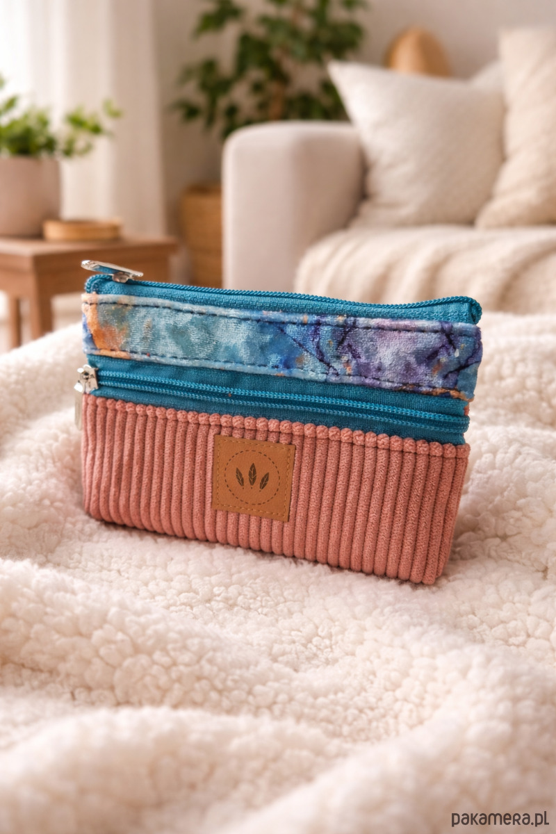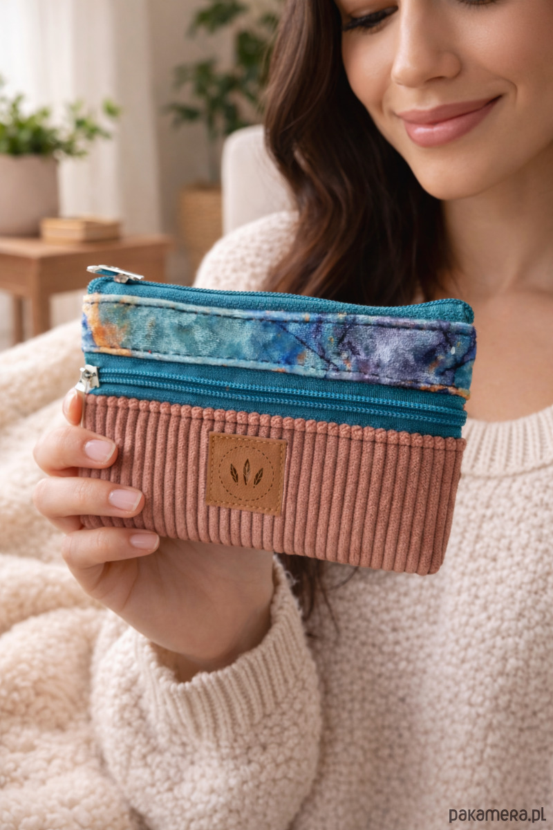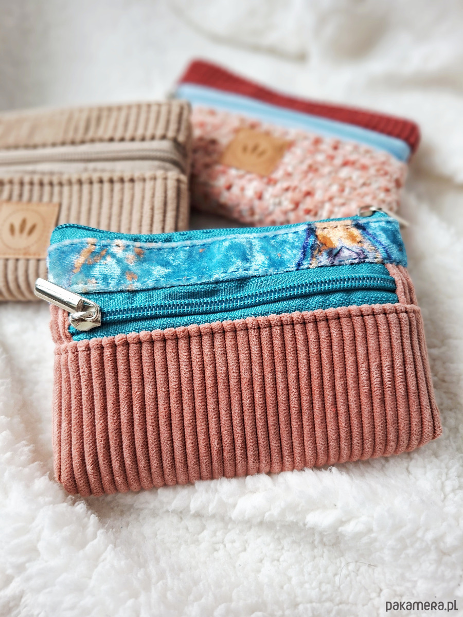 Ręcznie robiony nieduży portfel mieszczący karty, dokumenty i banknoty/drobne. Posiada komorę główną oraz kieszonki na zamek po obu stronach portfela. Idealny w duecie z naszymi nerkami. Nie zajmuje dużo miejsca i jest leciutki. Wodoodporna podszewka zabezpiecza wnętrze przed wilgocią. Zamki w kolorze niebieskim.
