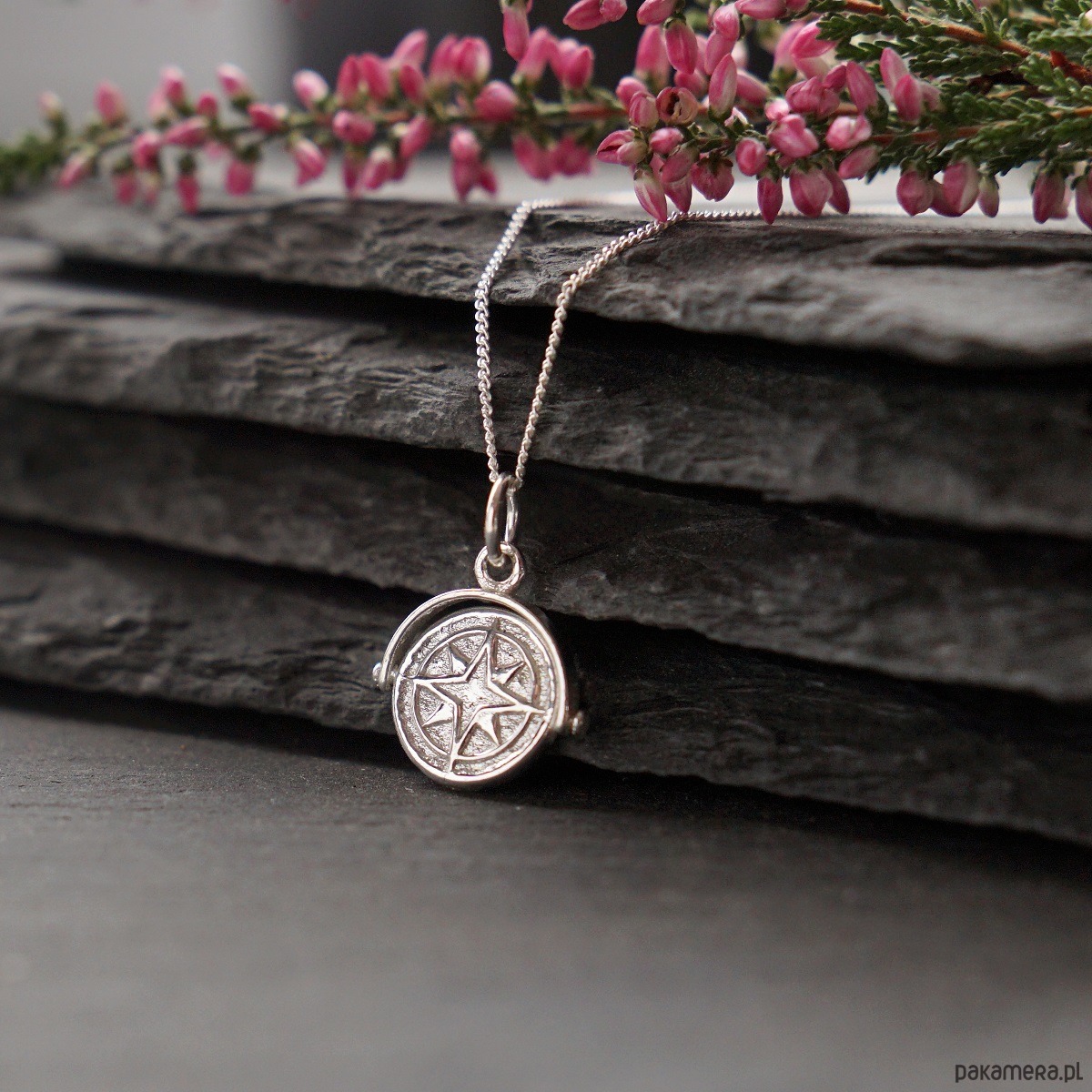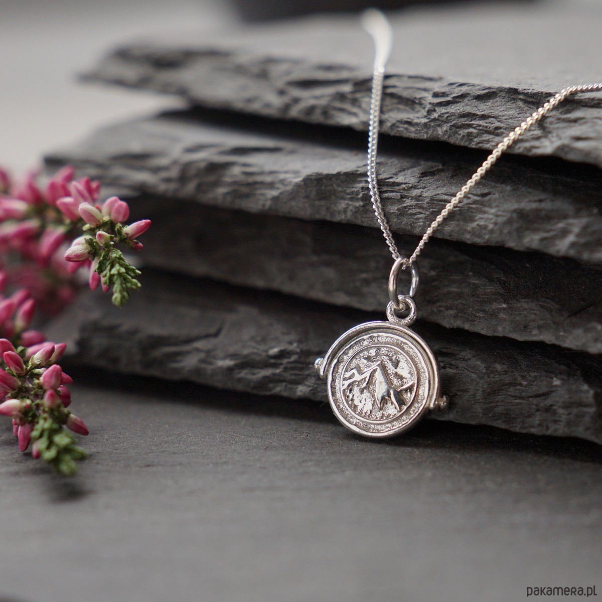 Naszyjnik z obrotową, ruchomą zawieszką z motywem gór i róży wiatrów.