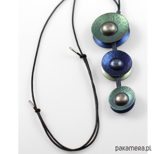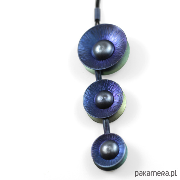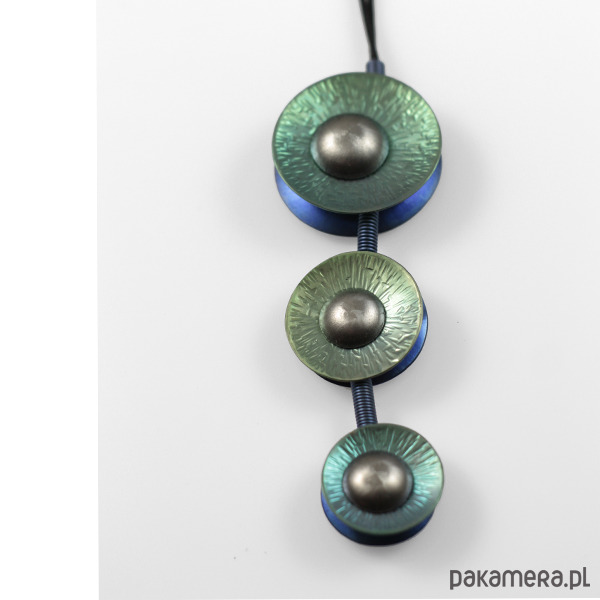 Wisior Tryptyk zrobiłem z tytanu i srebra.Wisior jest obustronny .Zawieszony na regulowanej lince jubilerskiej ,bez zapięcia ,z płynną regulacją długości .Bardzo efektowny,no i dwa w jednym.Na jednym z elementów wygrawerowałem autograf. Elementy są wielkości ;średnice 3,4 cm / 3,0 cm /2,7 cm. Tytan jest niezwykle lekkim i trwałym metalem który nie wywołuje żadnych alergii-jest hipoalergiczny-stosowany w chirurgii i stomatologii. Odporny na działanie chemikaliów. Anodowany pokrywa się tlenkami o intensywnych kolorach które zachowują swą barwę przez wiele lat.