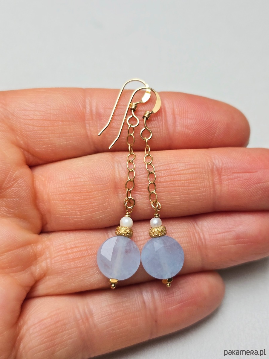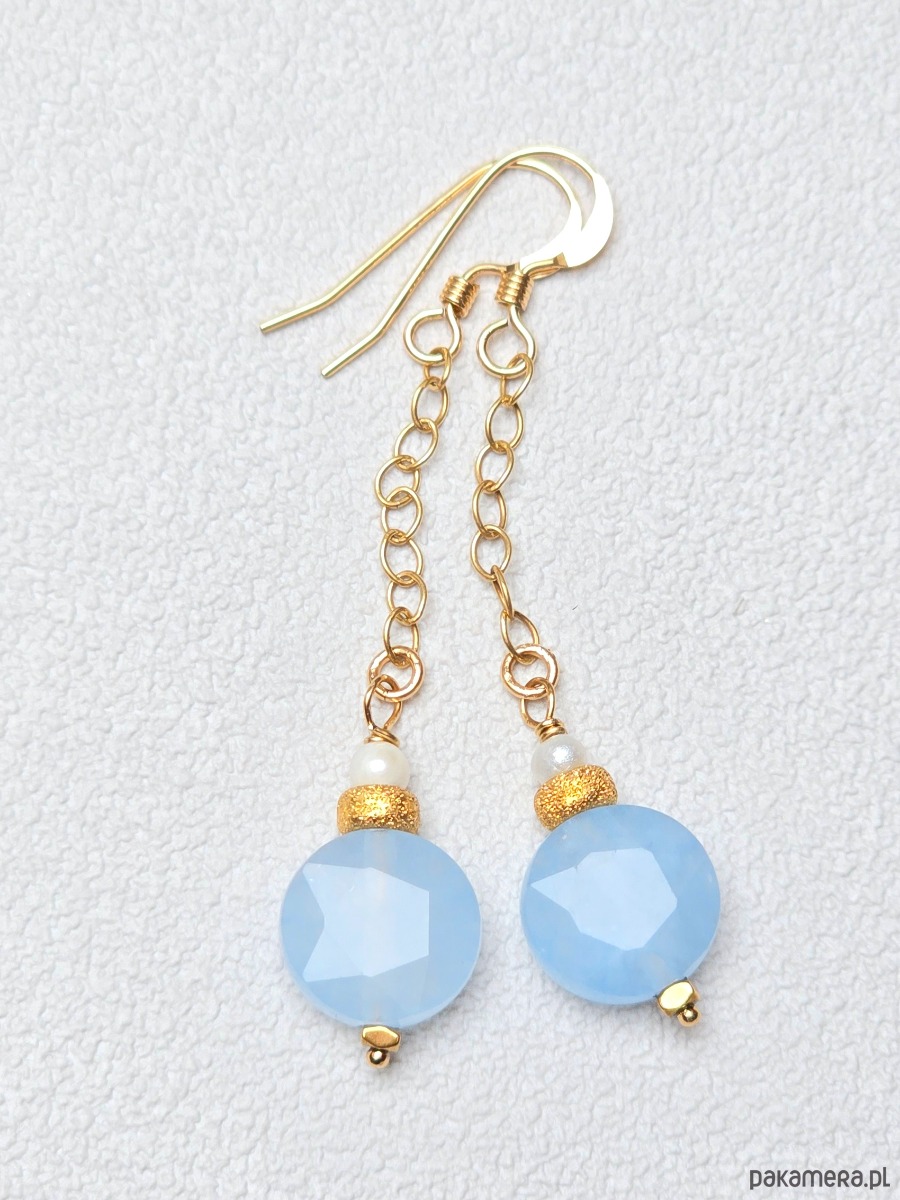 Lekkie kolczyki na biglach otwartych ( do których będą dołączone silikonowe zatyczki). Z zawieszonym na łańcuszku błękitnymi, 10 mm pastylkami akwamarynów w towarzystwie diamentowanych oponek i małych perełek.