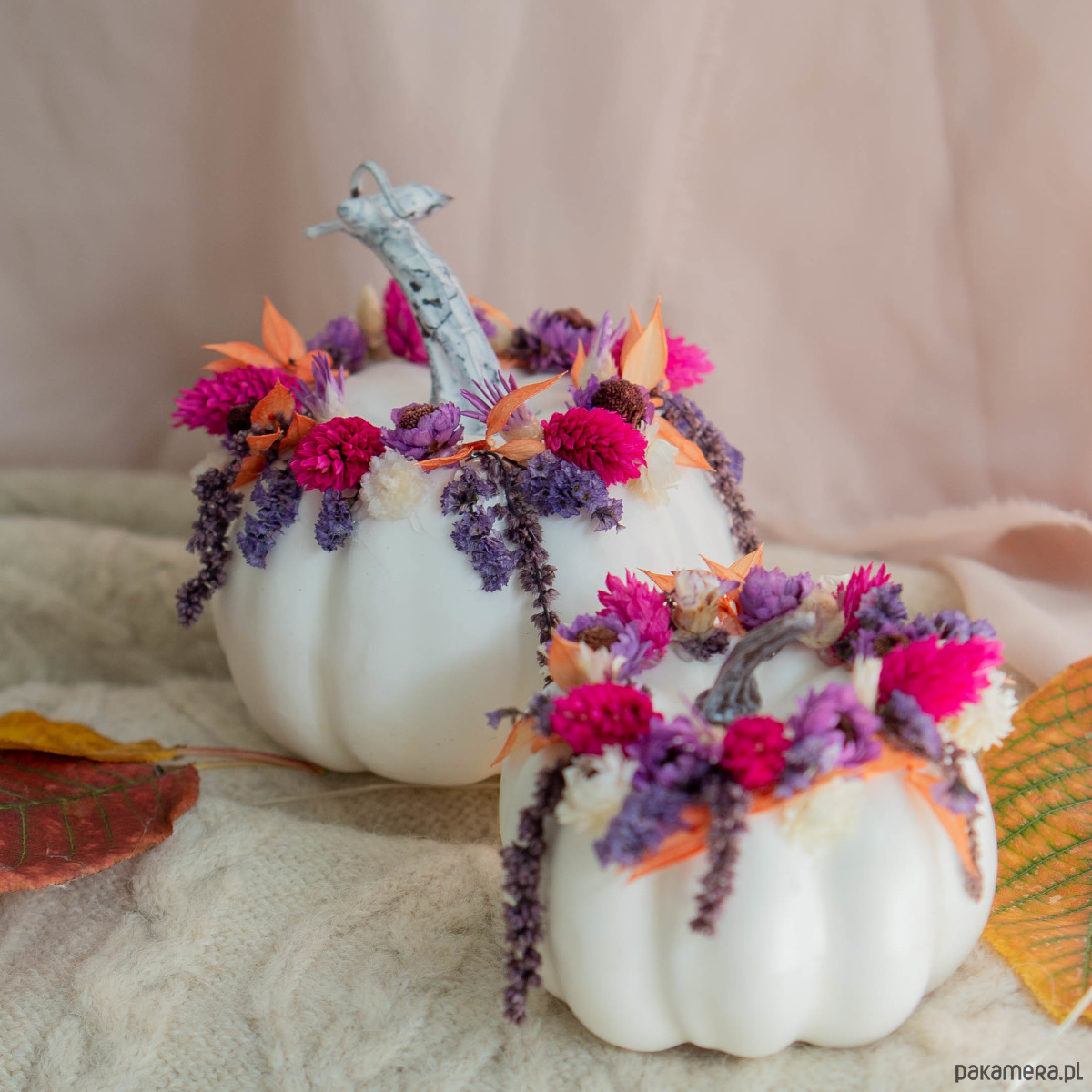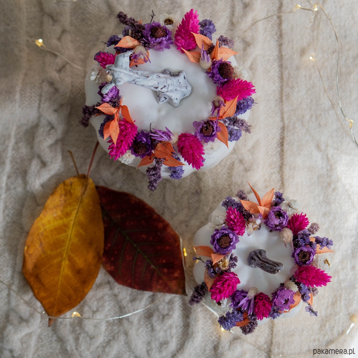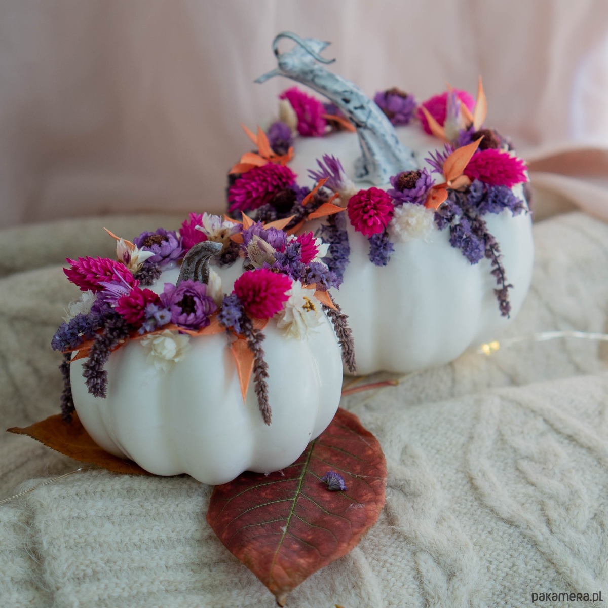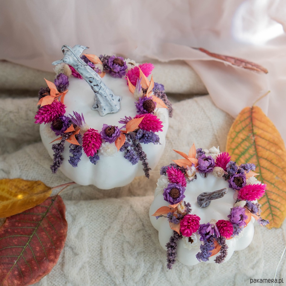 Białe dynie z dekoracją z suszonych kwiatów.