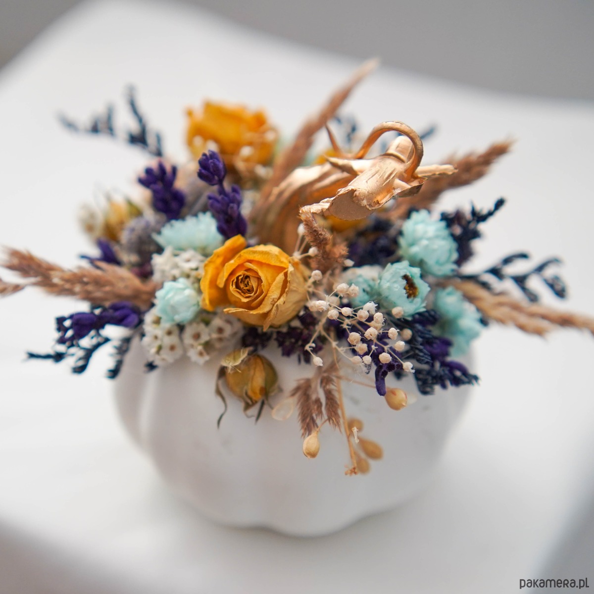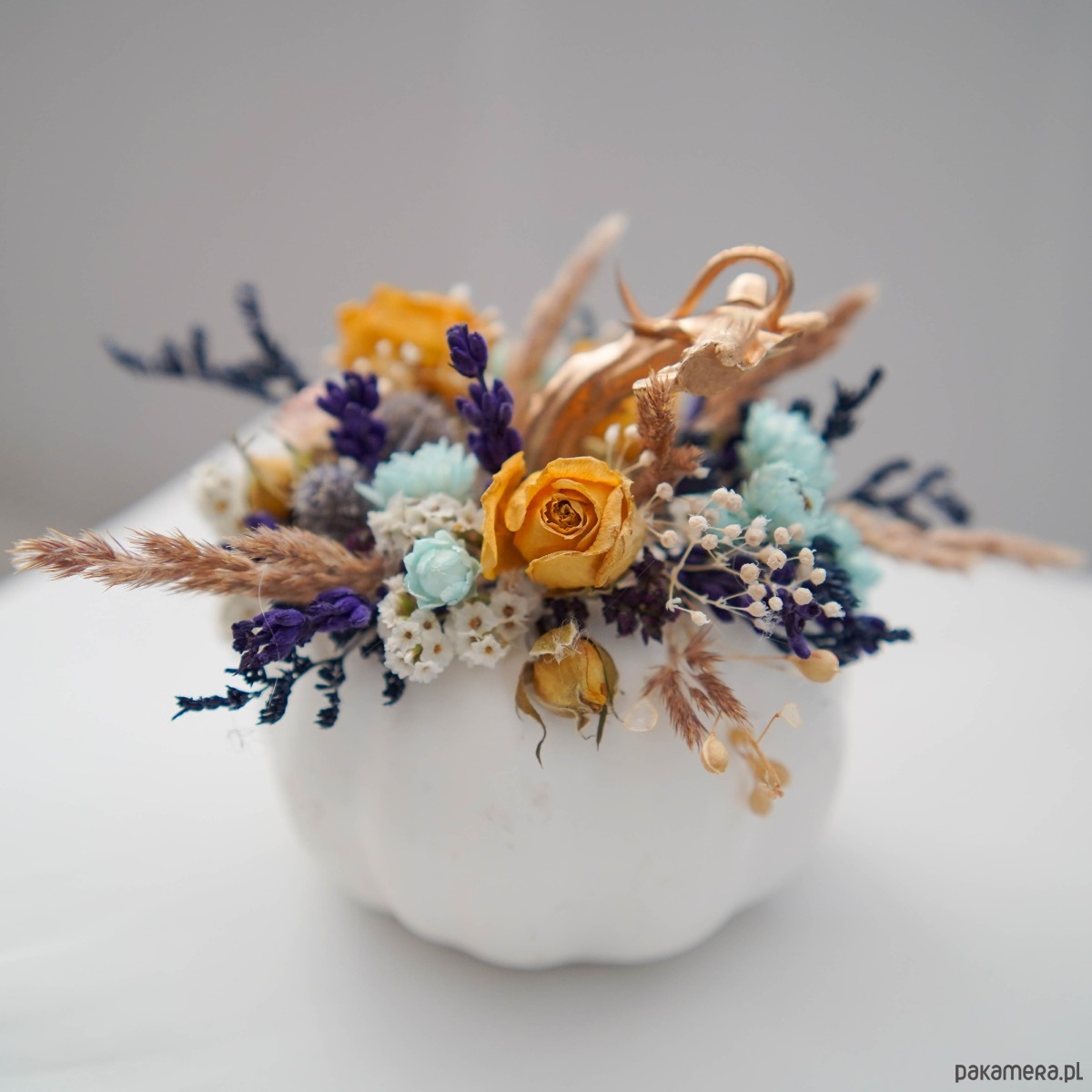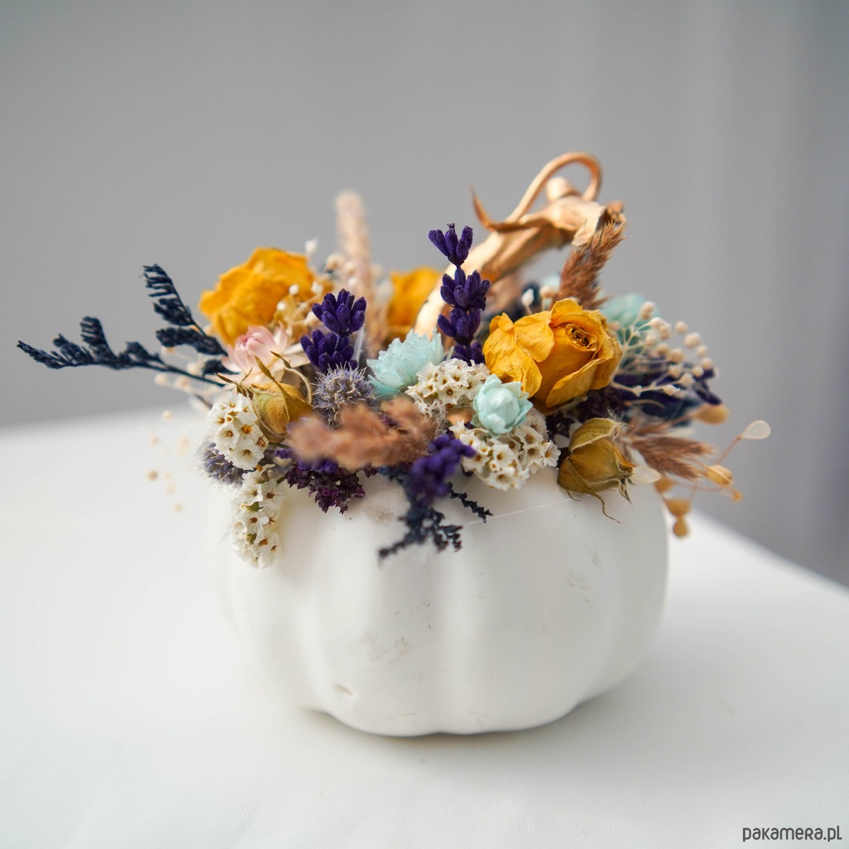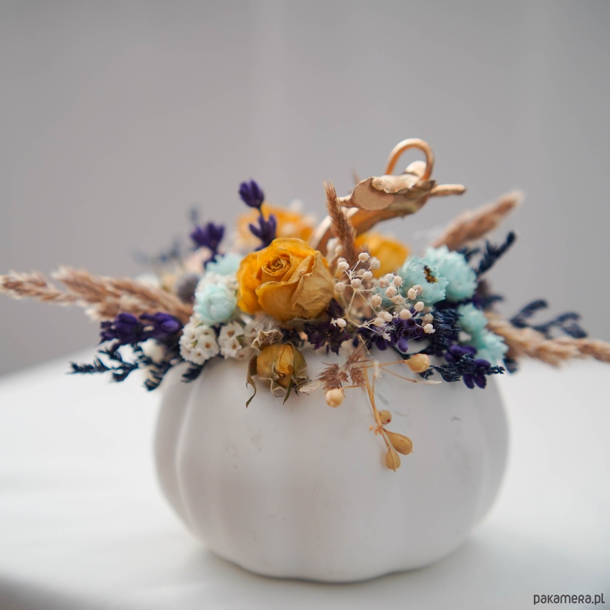 Biała dynia z dekoracją z suszonych kwiatów.