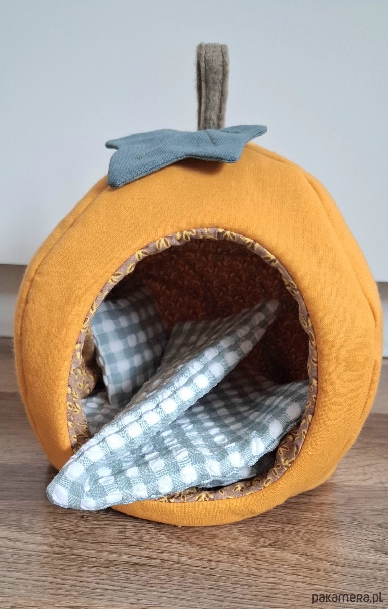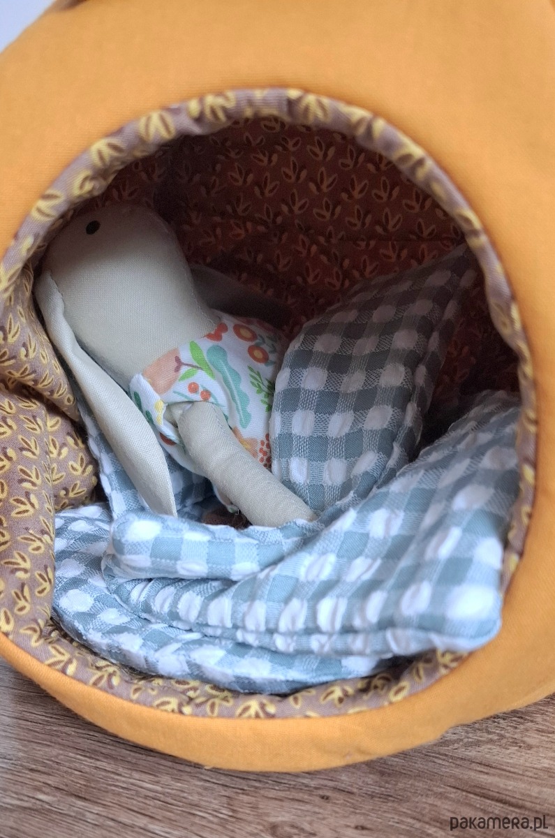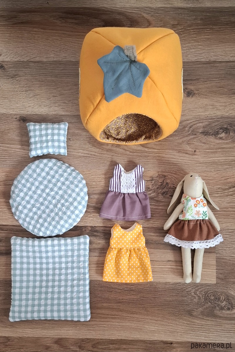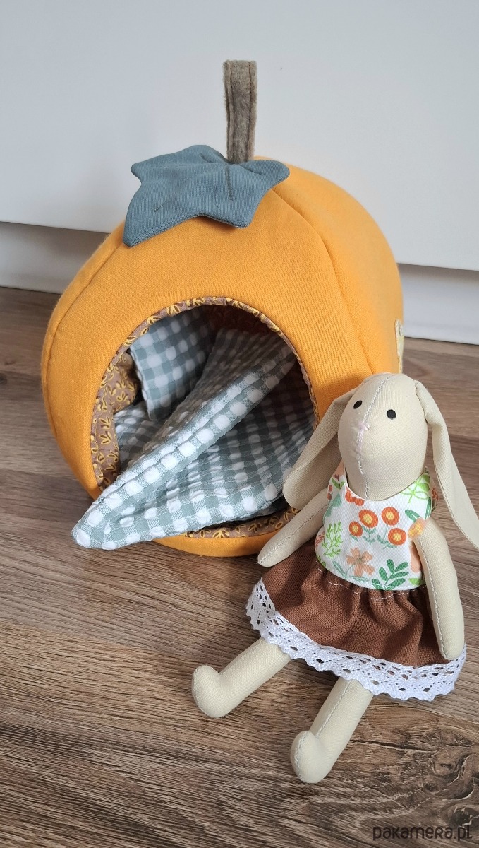 Dlatego w mojej pracowni została uszyta ze 100% bawełny dynia, wraz z kompletem pościeli. W domku tym mieszka malutki 15 cm króliczek, który ma do przebierania trzy urocze ubranka.