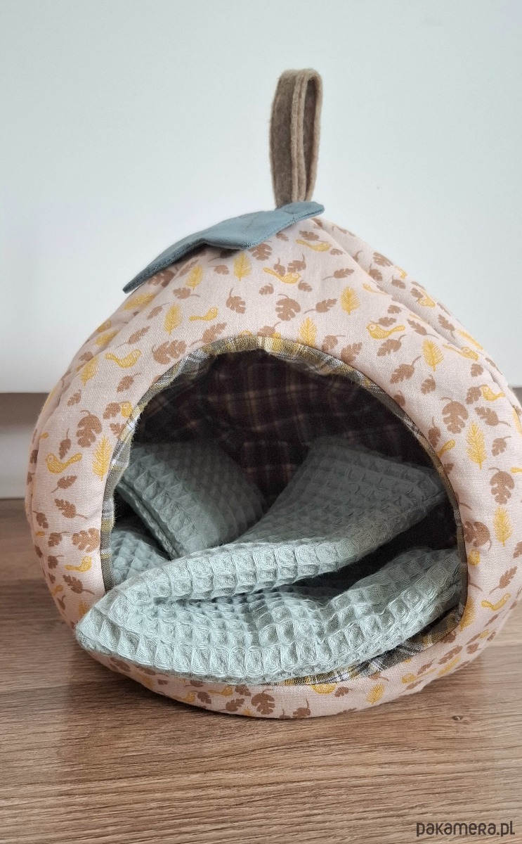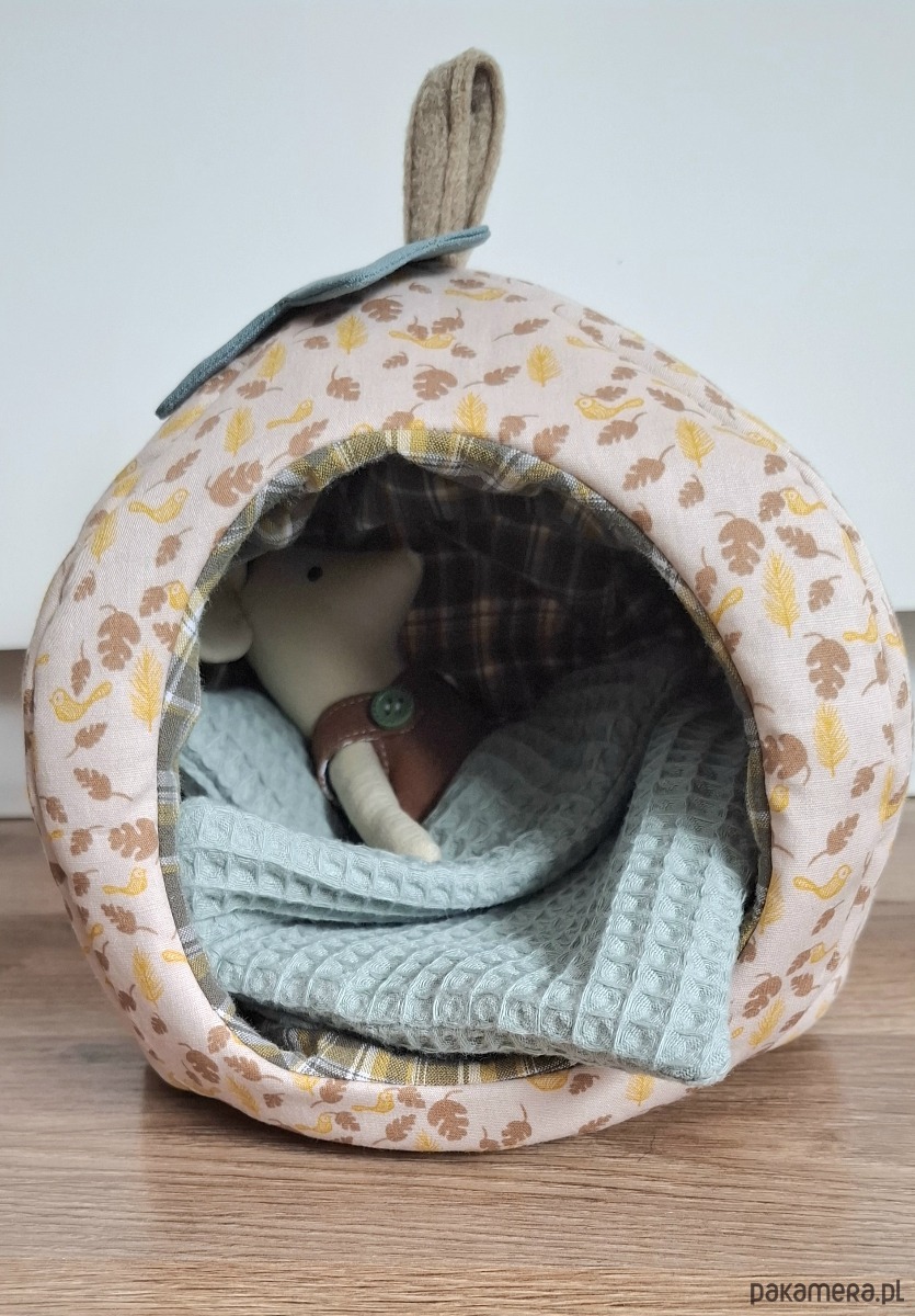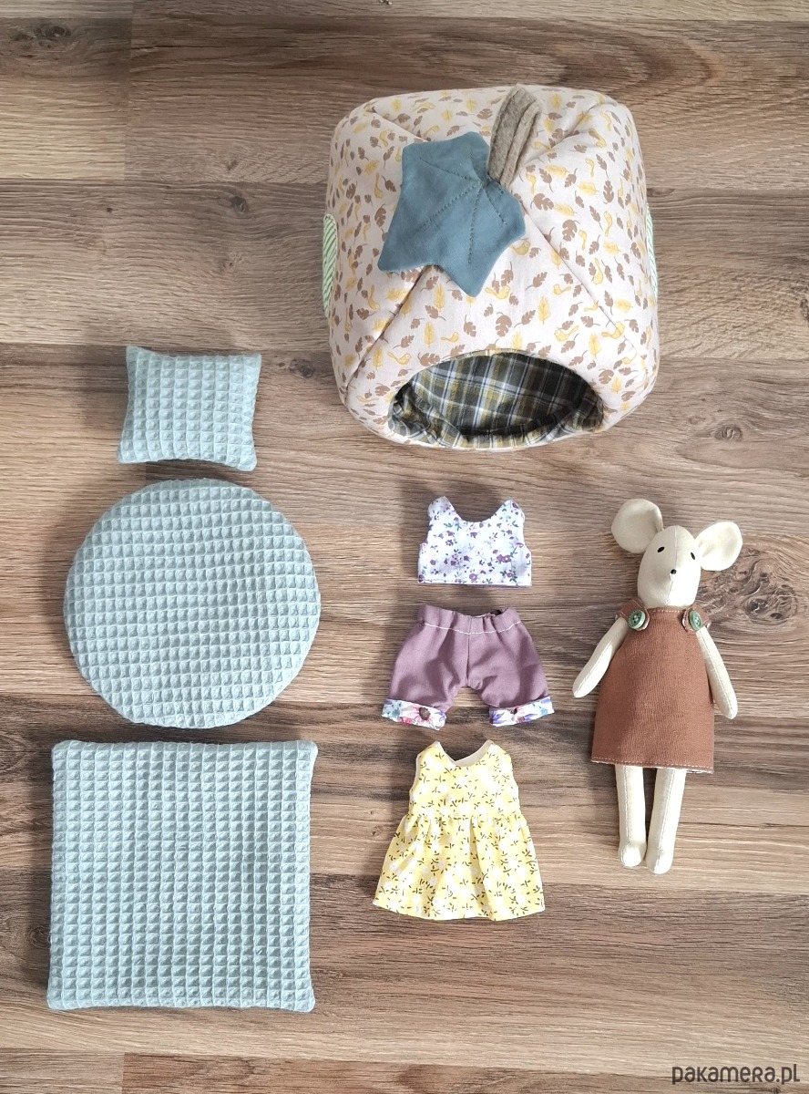 Dlatego w mojej pracowni została uszyta ze 100% bawełny dynia, wraz z kompletem pościeli. W domku tym mieszka malutka 15 cm myszka, która ma do przebierania trzy urocze ubranka.