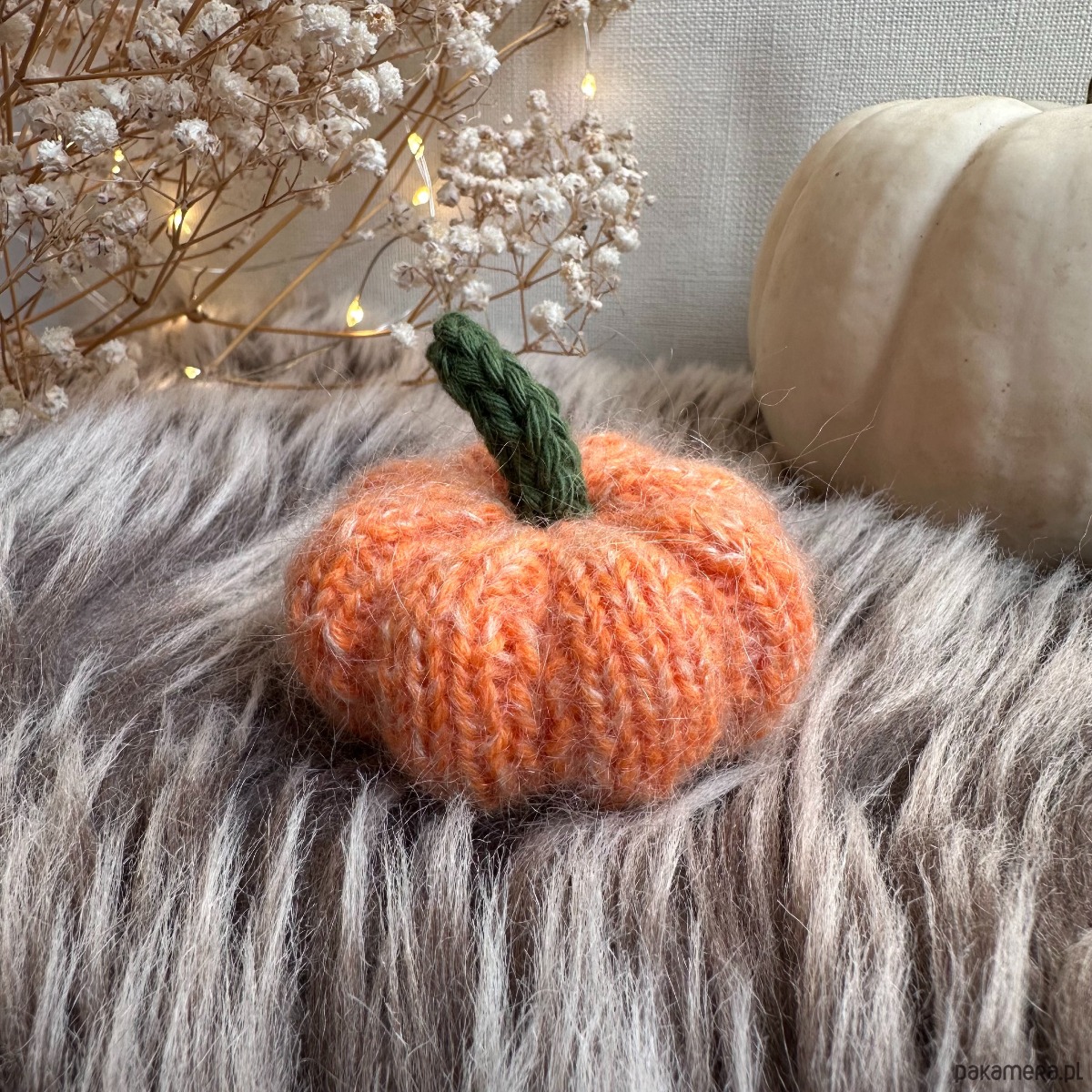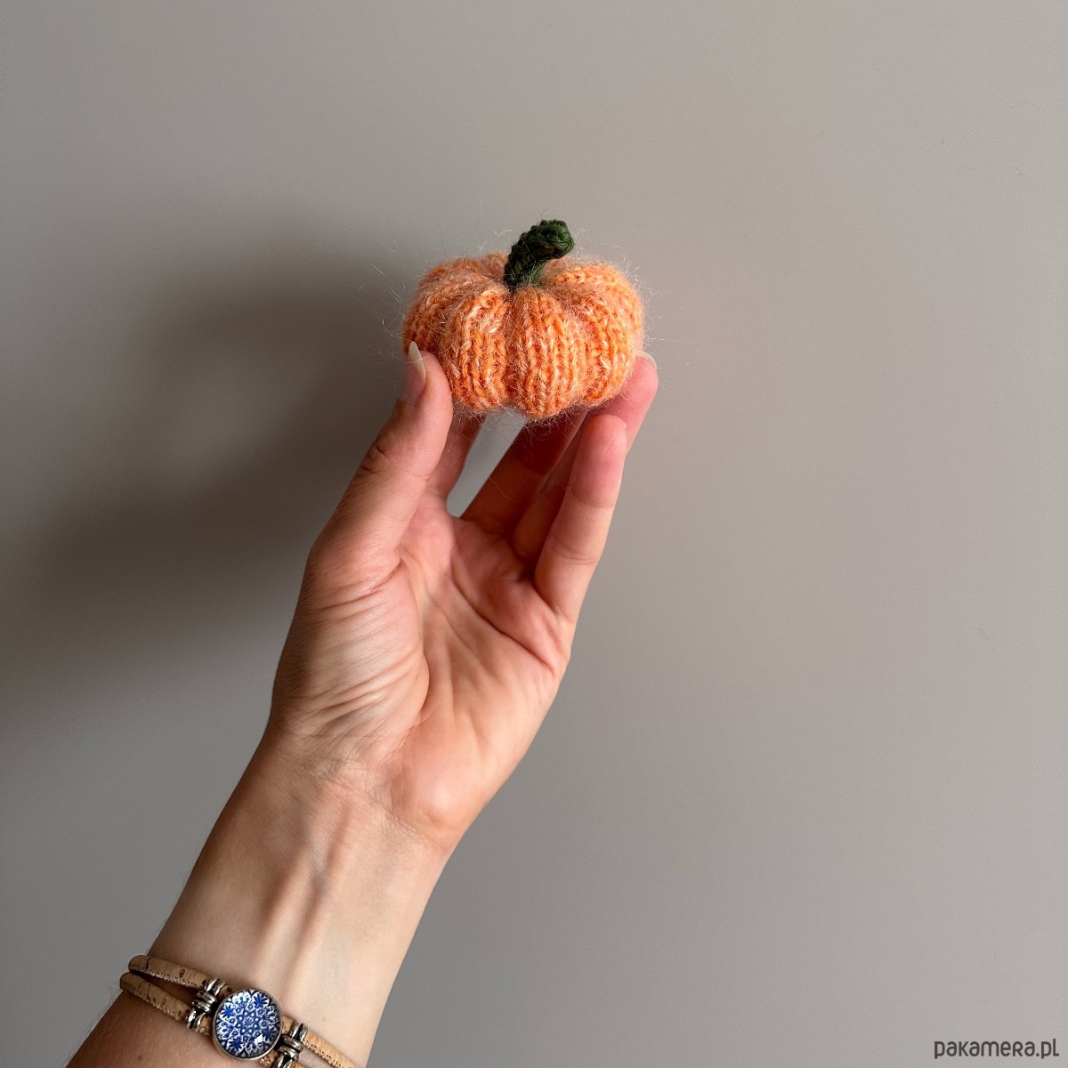 Mini dynia wykonana ręcznie na drutach w pięknym pomarańczowym kolorze.
