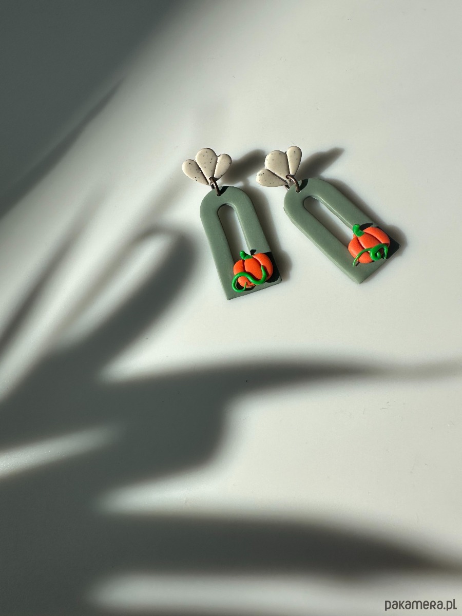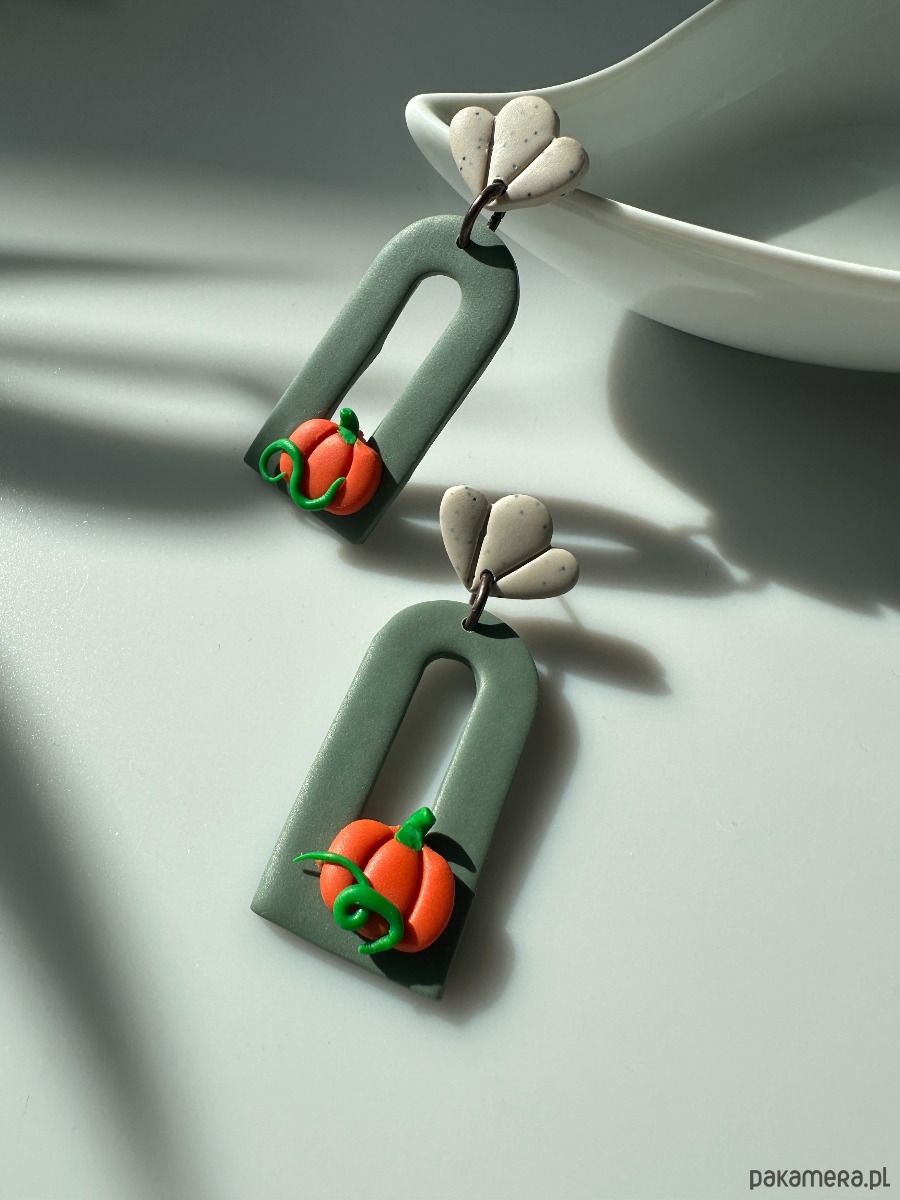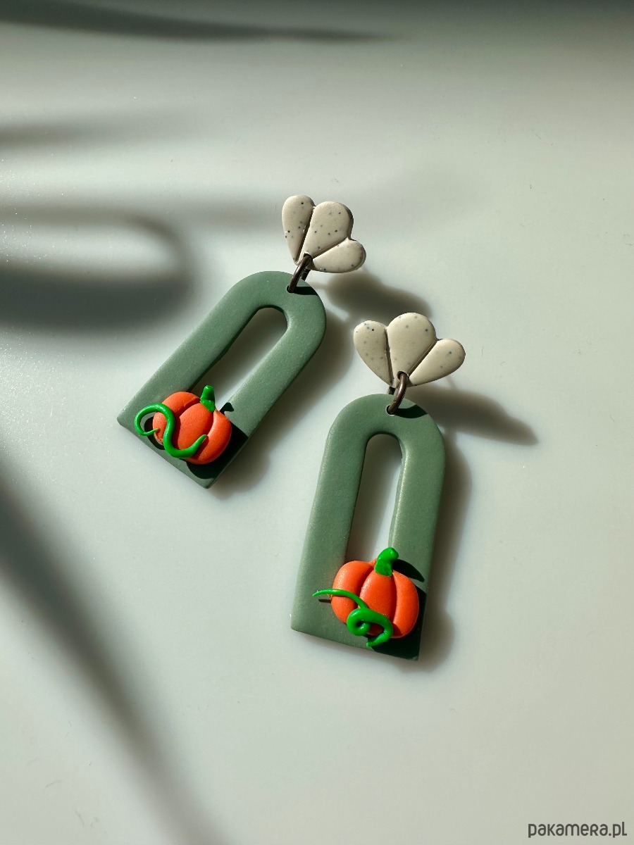Dyniowe okna to klasyczne połączenie beżu i szałwiowej zieleni, ozdobione jesiennym motywem dyni. Kochasz jesień? Podkreśl to jesiennymi kolczykami.