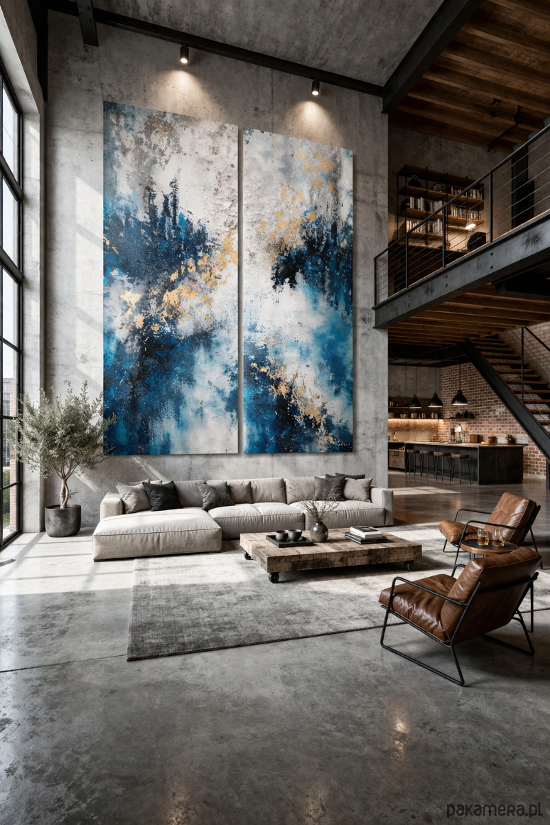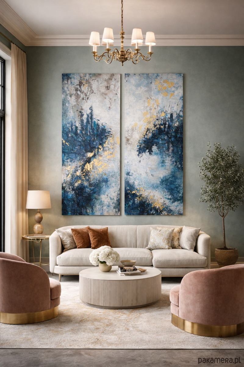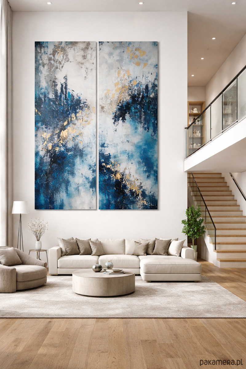 Ten wyjątkowy dyptyk to propozycja dla wnętrz, które potrzebują mocnego, ale jednocześnie wyrafinowanego akcentu. Kompozycja oparta na głębokich odcieniach granatu, błękitu, beżu i brązu została przełamana subtelnymi, złotymi akcentami, które pięknie odbijają światło i nadają całości luksusowego charakteru.