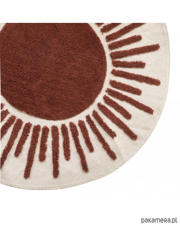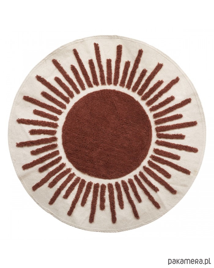 Piękny, okrągły dywan wykonany z bawełny, o średnicy 90 cm. W kolorze biało-brązowym, z wzorem promienistego słońca. Ociepli surowe wnętrze i sprawi, że pomieszczenie stanie się bardziej przytulne. Dywan sprawdzi się w salonie, jadalni, kuchni i przedpokoju.