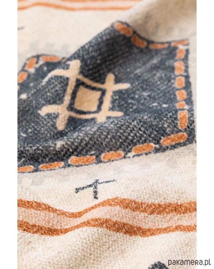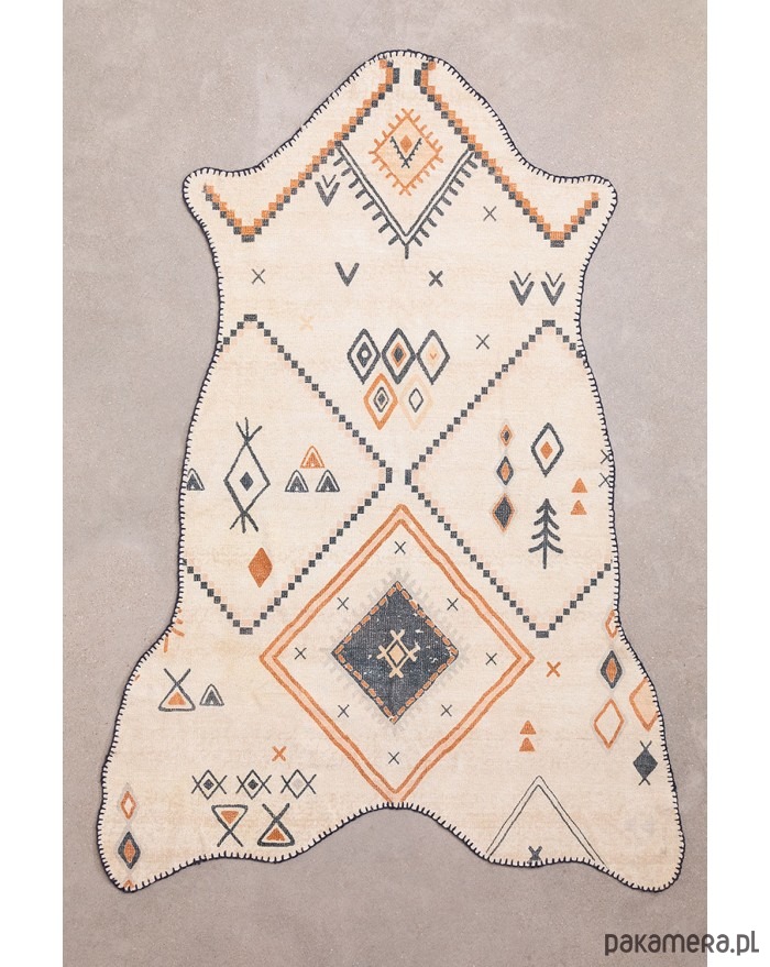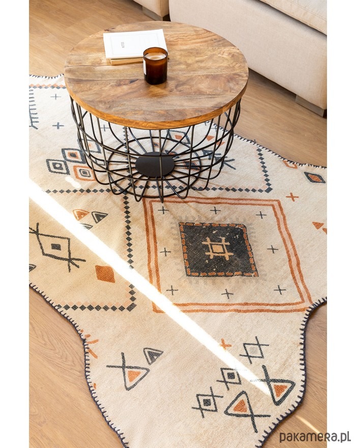 Bardzo ciekawy dywan w stylu etnicznym o nieregularnym kształcie. Tkany ręcznie na tradycyjnych krosnach ze 100% bawełny.