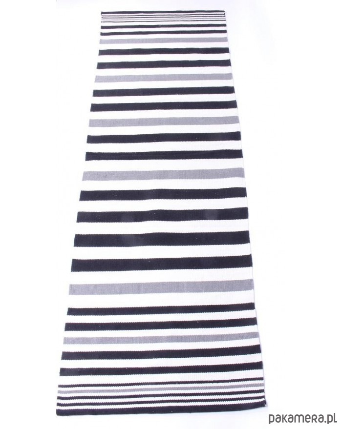 Dywan w pasy biało-szaro-granatowe. Udekoruje salon, sypialnię i pokój dziecięcy. Wykonany z grubo tkanej bawełny przypominającej marynarskie sploty.