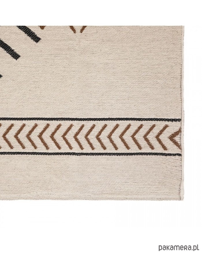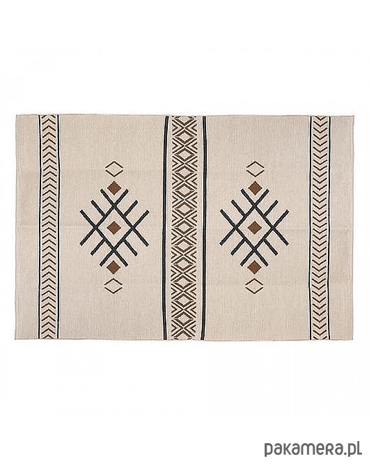 Dywan bawełniany ozdobiony wzorem geometrycznym na jasnym beżowym tle. Sprawdzi się w każdym wnętrzu.