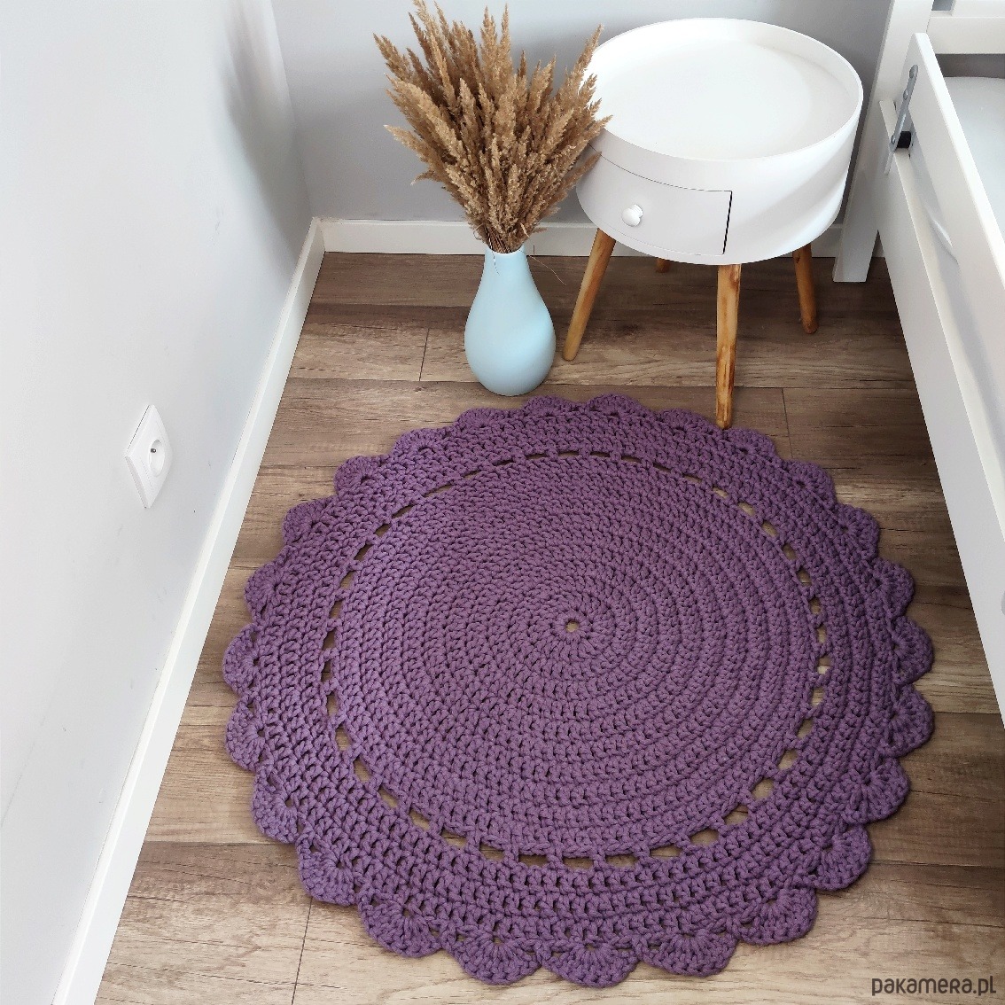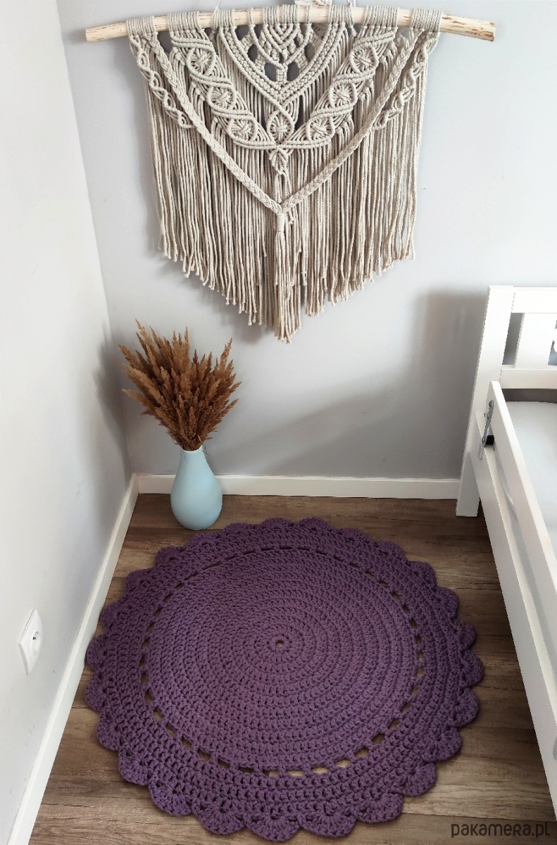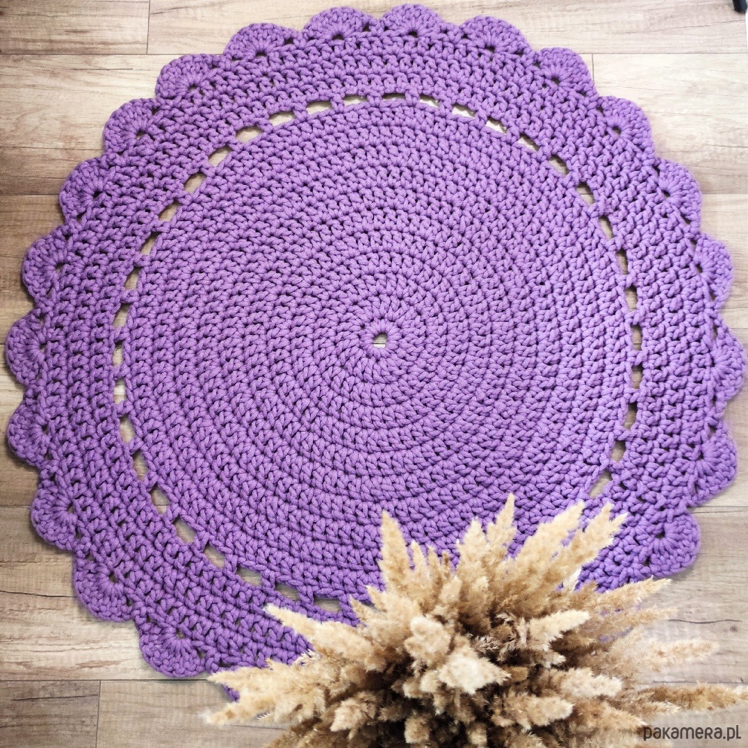 Kolor dywanu ze zdjęć: wrzos, rozmiar 80cm. Wzór "serwetowy", prosty.