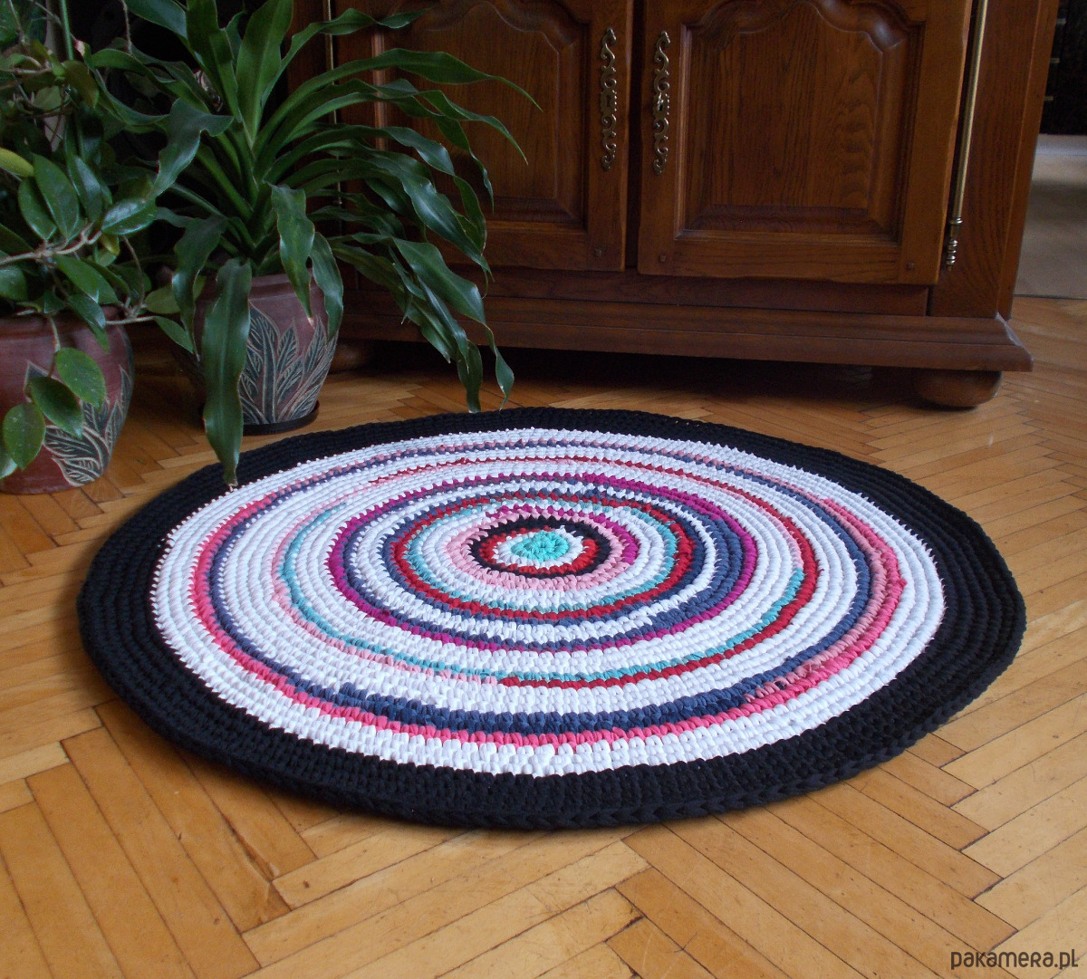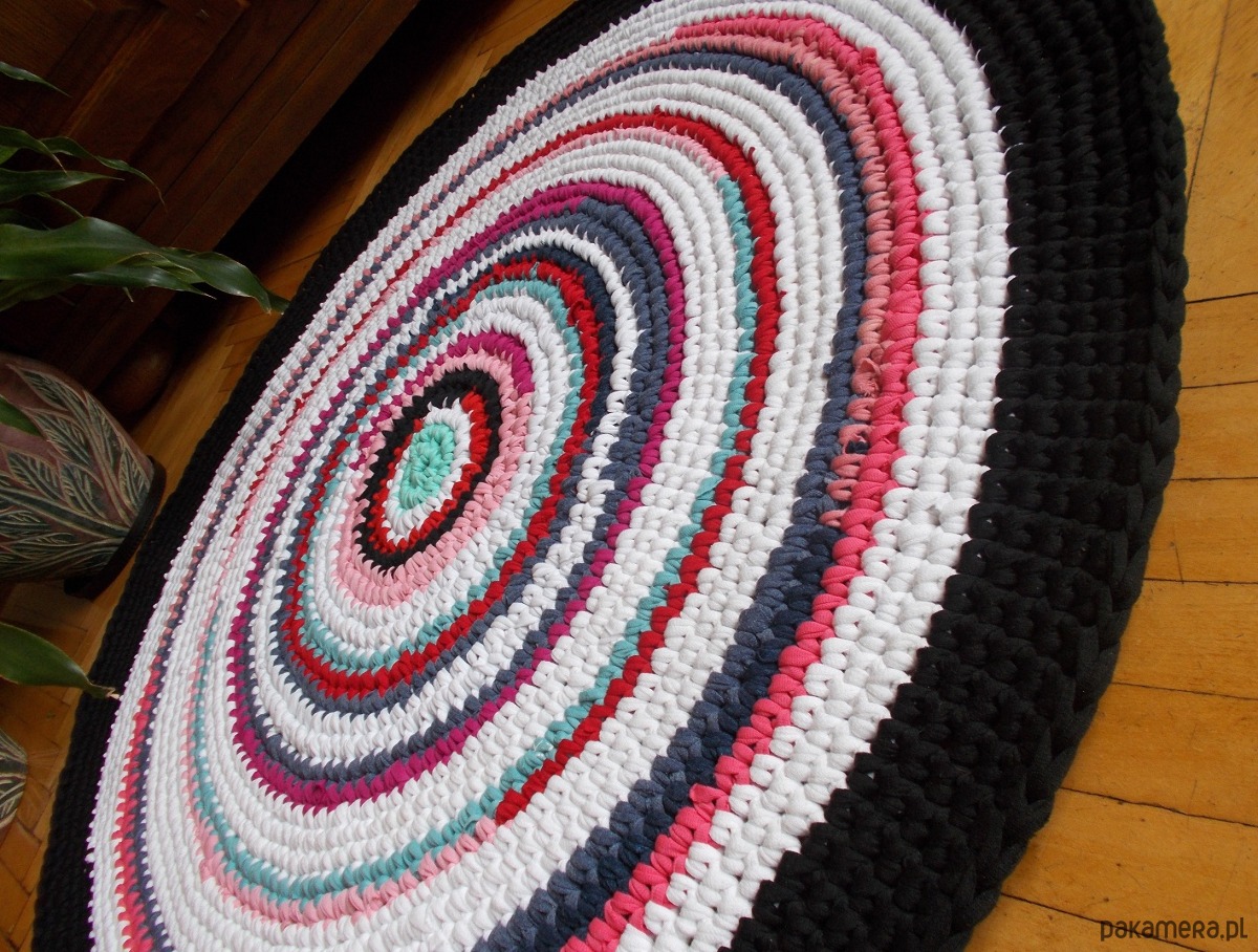 Dywan Eco-Etno Zero Waste, wykonany ręcznie z pociętych w paski T-shirtów (prawie nowych, w związku z czym kolory są intensywne a materiał bardzo dobrej jakości). Powstał w ramach twórczego recyklingu - jest egzemplarzem unikatowym. Będzie wyjątkową i w 100 % ekologiczną ozdobą mieszkania, nada mu kolorem energii i ożywi wnętrze.