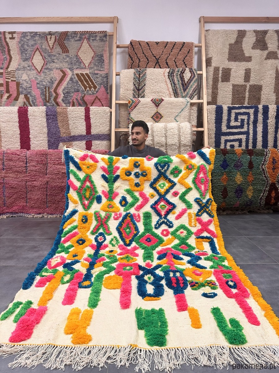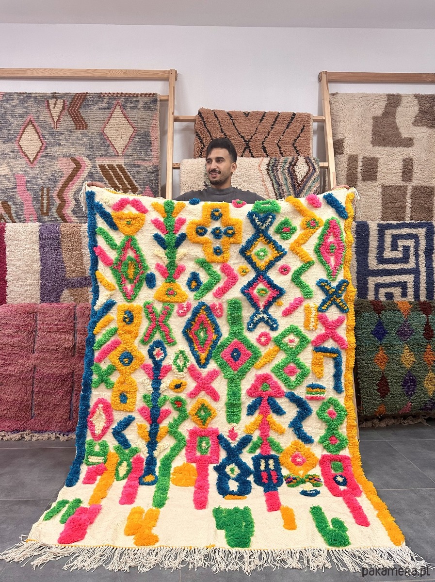 To dywan Maroko, który przyciąga wzrok od pierwszej chwili. Geometryczne symbole, nieregularne linie i odważna paleta barw nie są przypadkowe – każdy znak ma swoje znaczenie i opowiada historię. Tak właśnie wyglądają prawdziwe skarby Maroka: autentyczne, niepowtarzalne i tworzone z sercem.