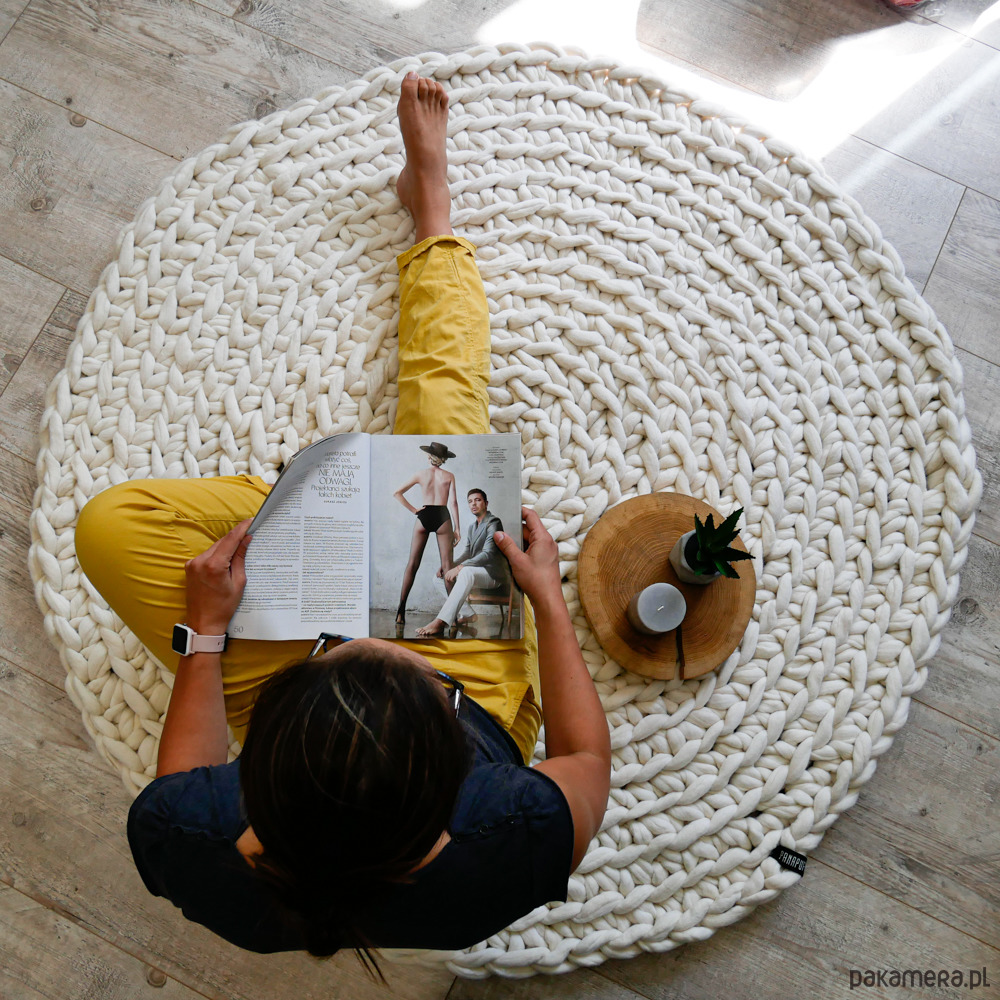 Jedyny w swoim rodzaju, miękki, okrągły dywan wykonany została przez nas ręcznie z filcowanej wełny.
