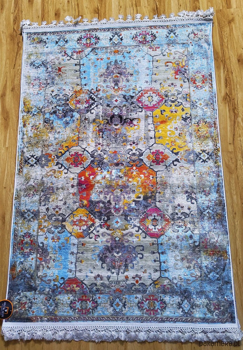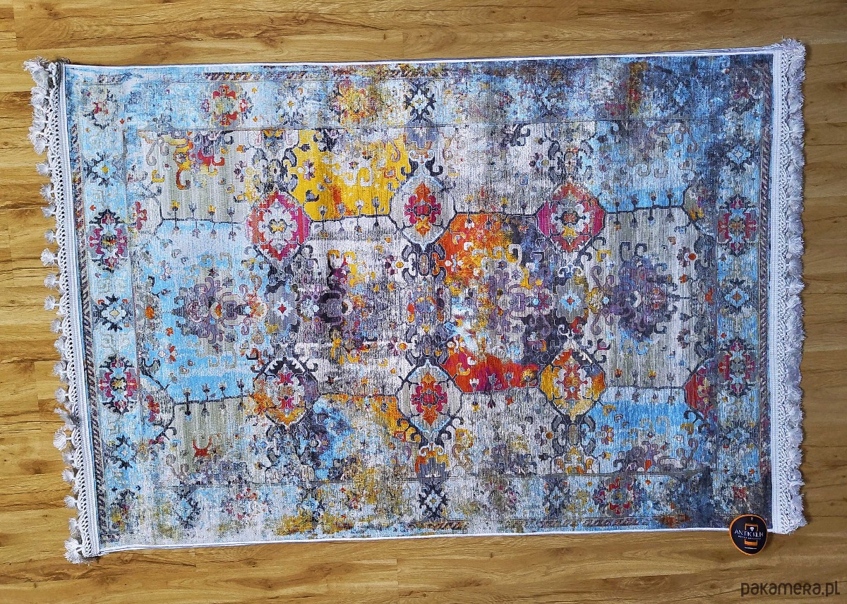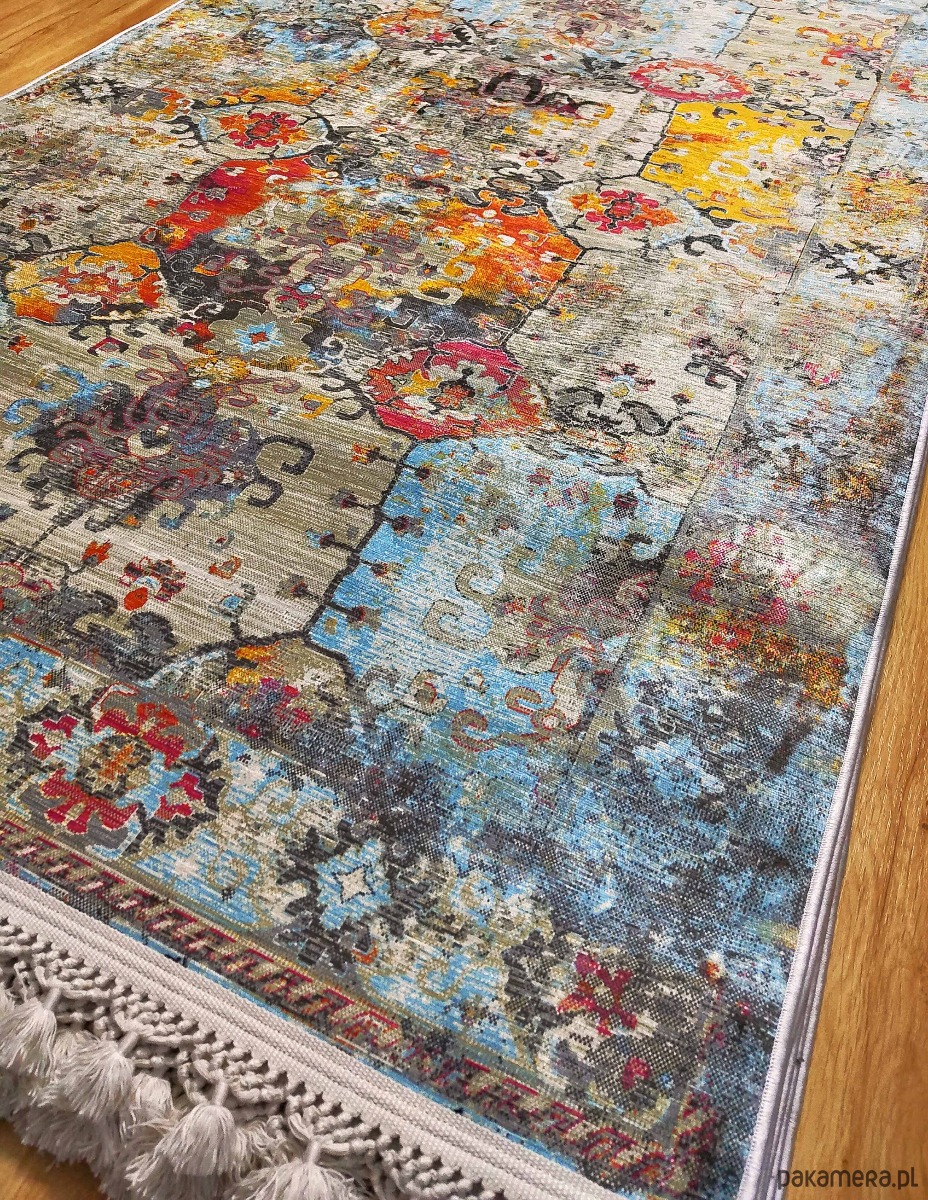 Dywan o wymiarach 120x180 cm i grubości 1 cm został wykonany w 80% z wysokiej jakości bawełny, co zapewnia miękkość, trwałość oraz naturalny wygląd. Kolorowa, orientalna kompozycja z odcieniami pomarańczu, niebieskiego i beżu doskonale uzupełni nowoczesne, klasyczne i boho aranżacje.