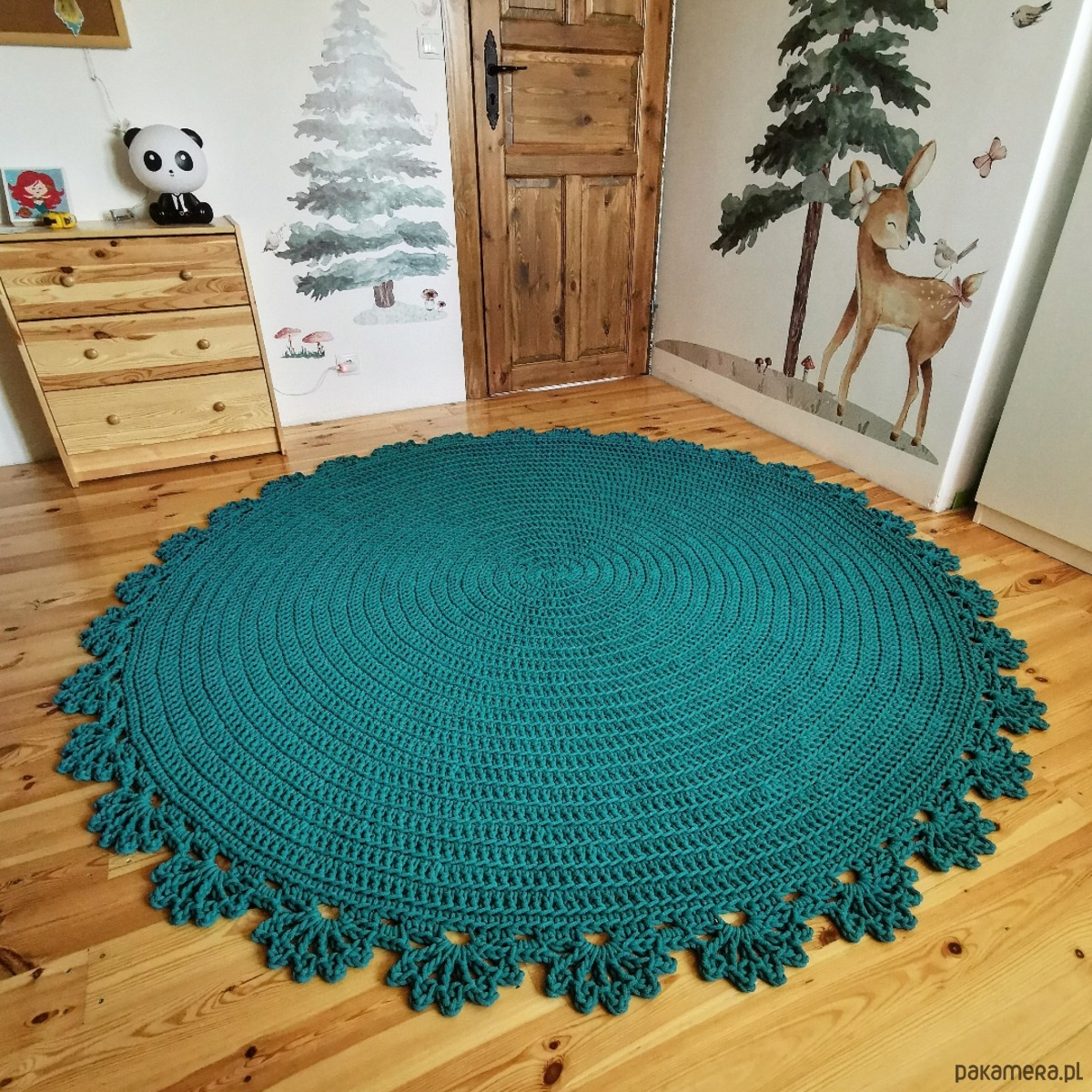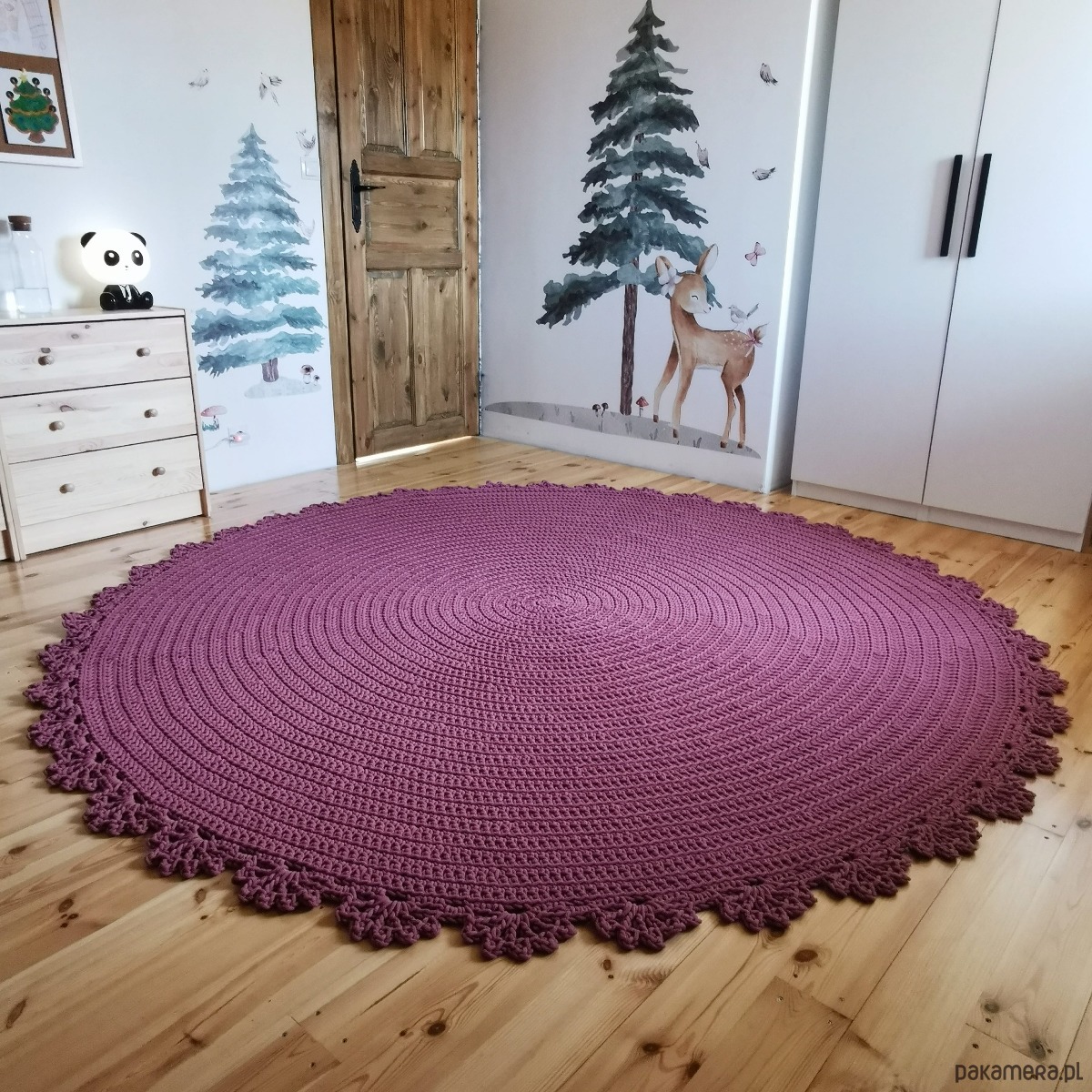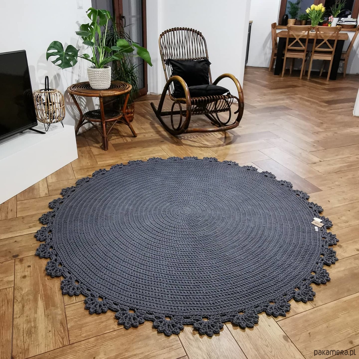 Ręcznie wykonany okrągły dywan z grubego sznurka bawełnianego o średnicy 5mm wykończony efektowna koronką.
