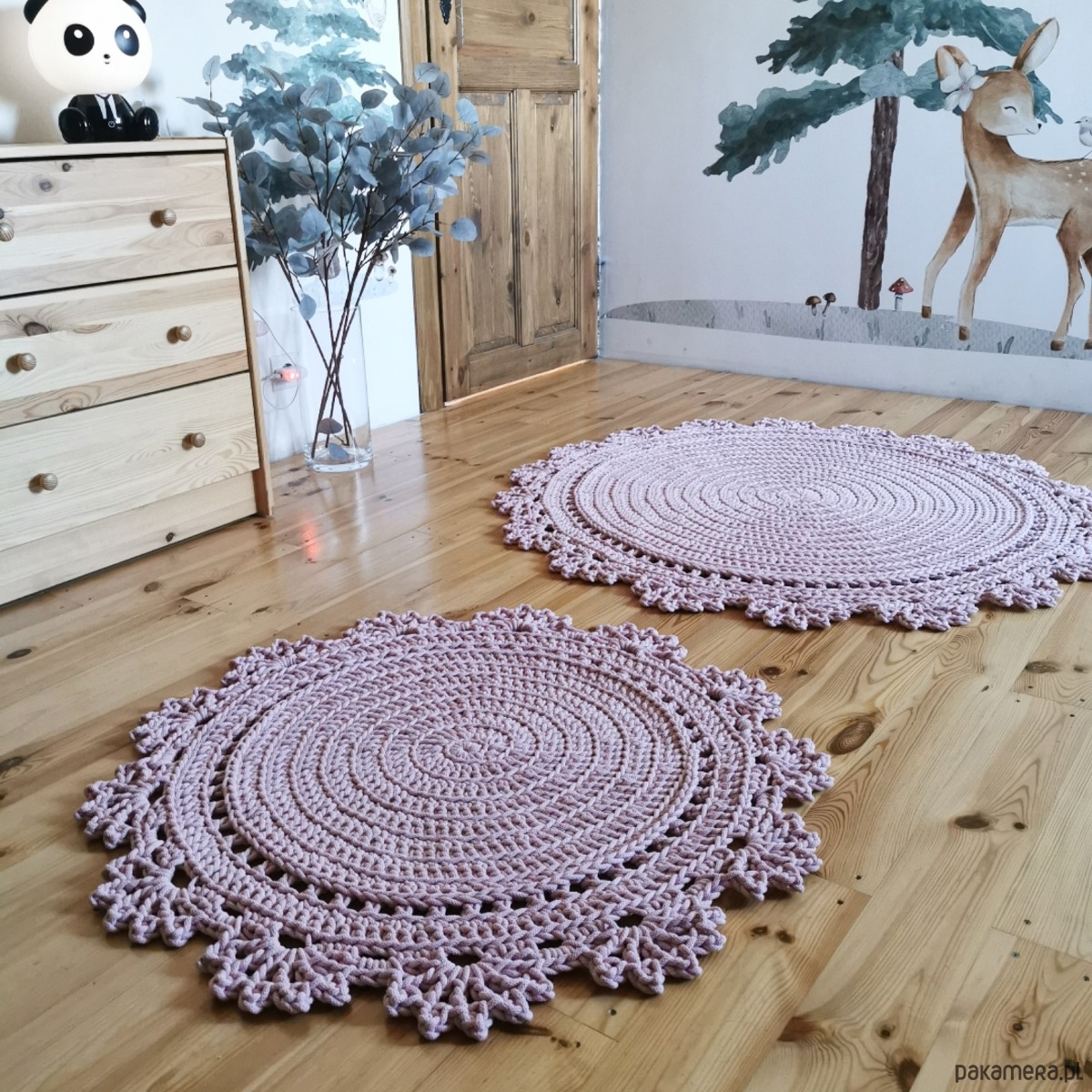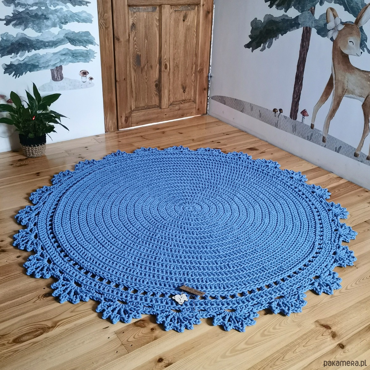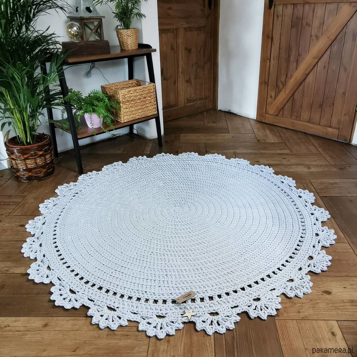 Ręcznie wykonany okrągły dywan z grubego sznurka bawełnianego o średnicy 5mm wykończony efektowna koronką.
