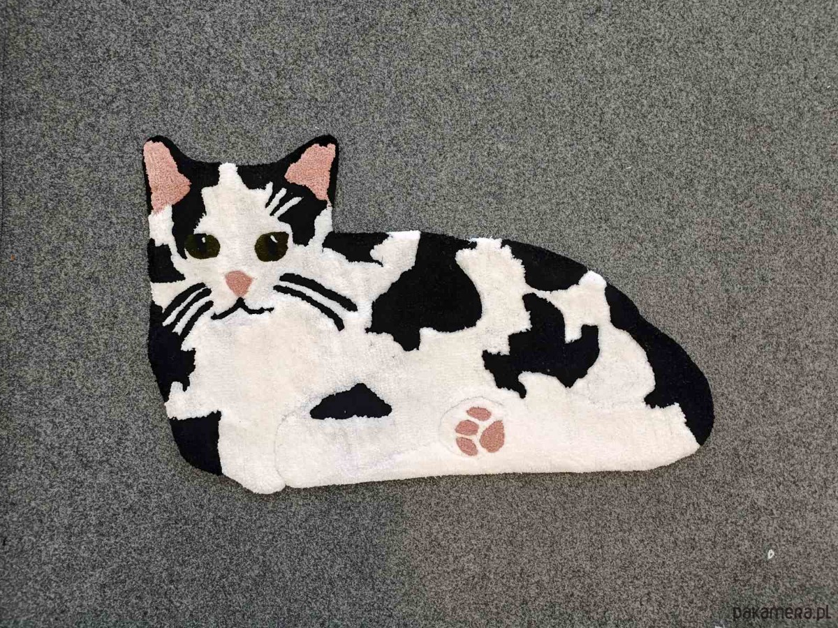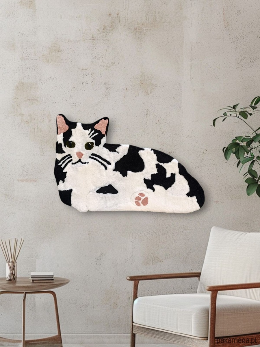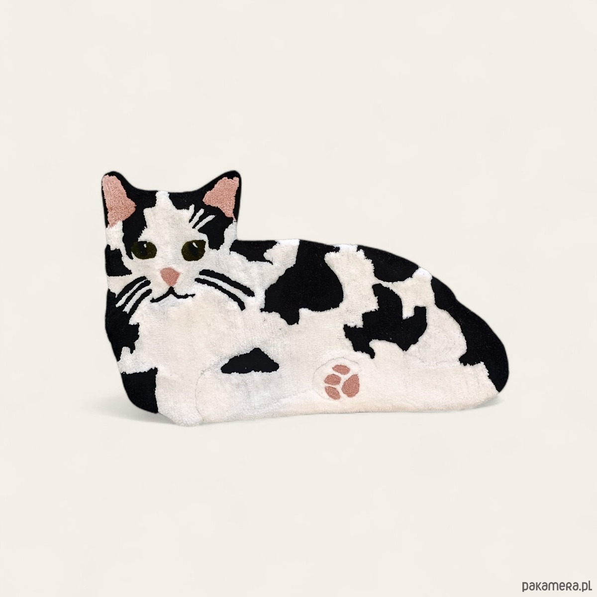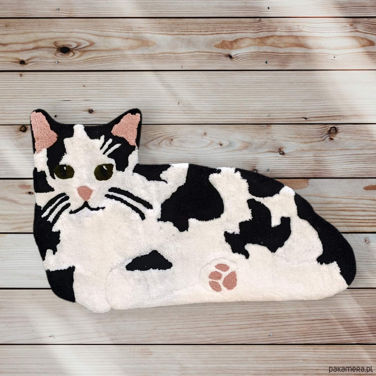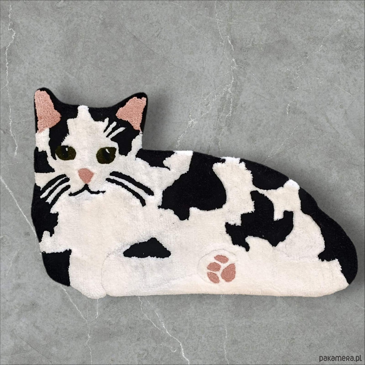 Ten śliczny dywanik to prawdopodobnie najsłodszy kotek w sklepie! Koty czasami leżą w pozycji bochenka chleba, moje często tak odpoczywają. I te słodkie kocie łapki. Dywan jest miękki i przyjemny w dotyku, dzięki grubemu włosiu i miękkiej przędzy akrylowej. Ten dywanik będzie ładną ozdobą pokoju, z pewnością zachwyci Twoich gości.