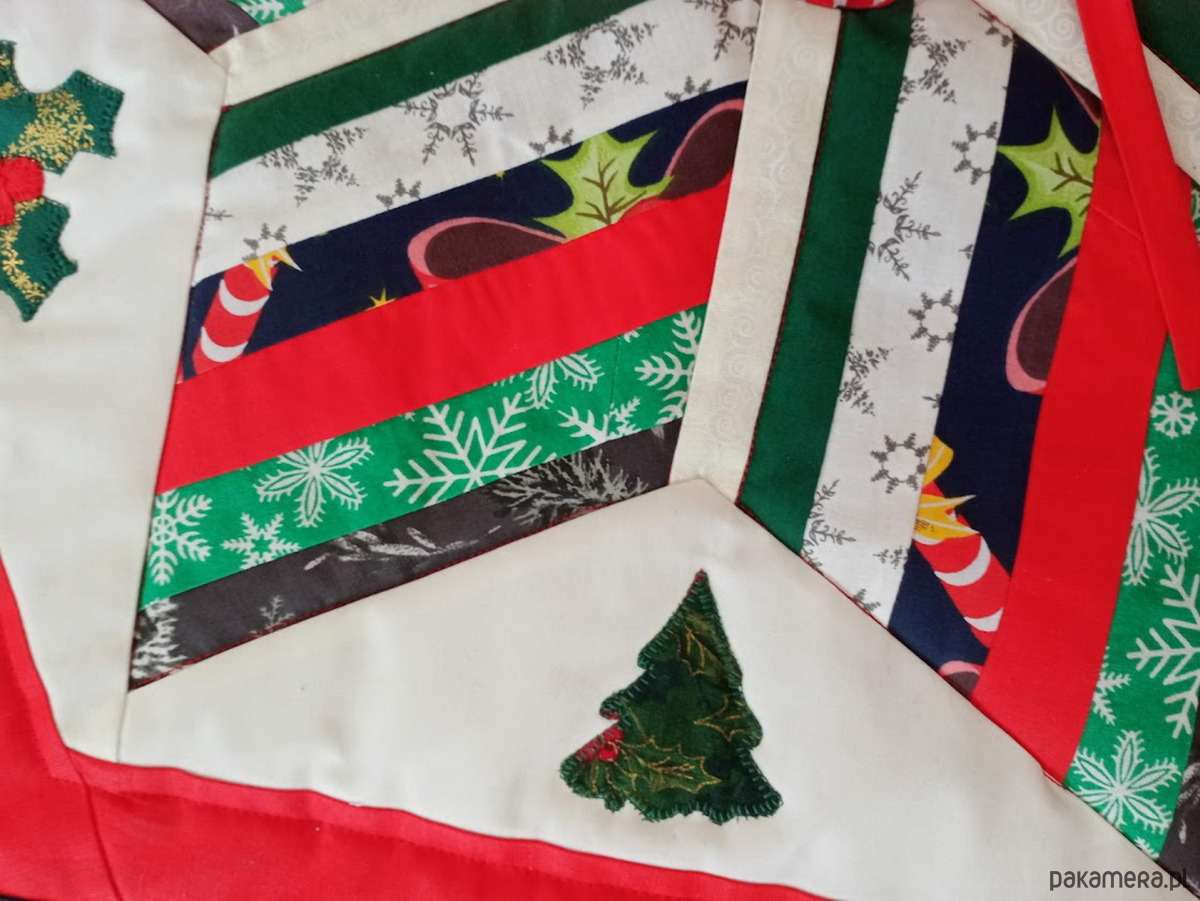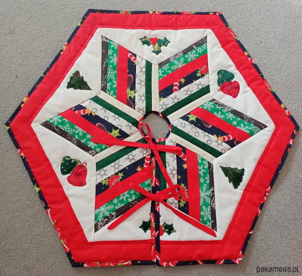 Dywanik , wykonany metodą patchwork , wypełniony cienką ociepliną i podszewką przez co jest stabilny, nie ściąga się. Dywanik posiada rozcięcie pozwalając na ukrycie podstawy choinki,. wykończone kokardą i do wiązania. Można ją również użyć jako zwykły dywanik pod choinkę, na którym się ją stawia . Ma średnicę ok.85 cm, a więc pomieści dużo prezentów :))
