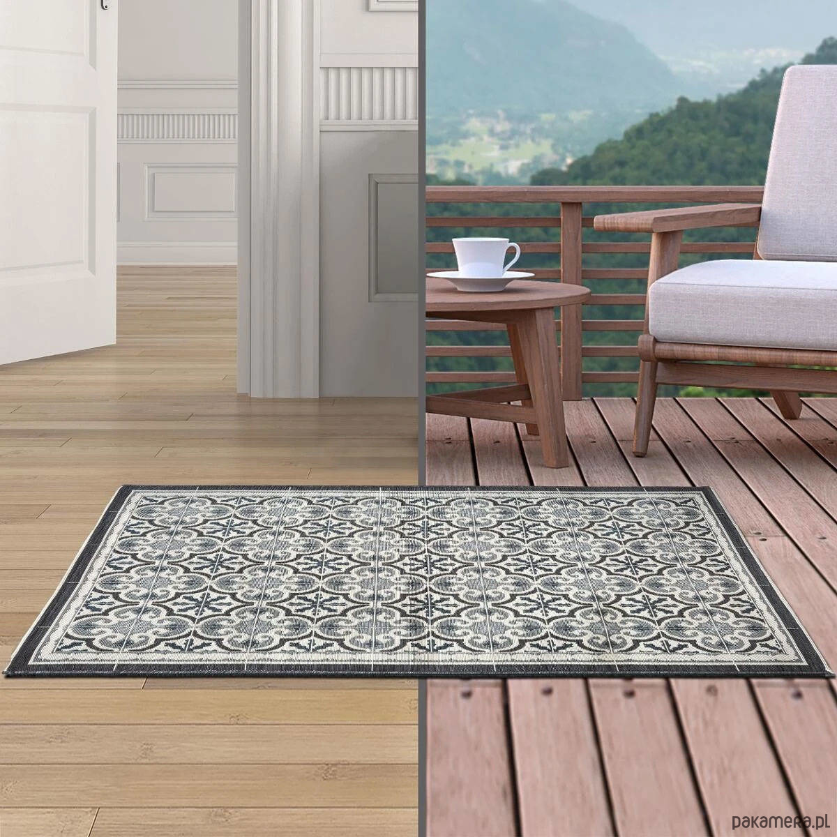 Dywan dekoracyjny w szarych odcieniach, wykonany z wysokiej jakości tworzywa sztucznego. Odporny na czynniki zewnętrzne. Idealny na taras czy balkon.