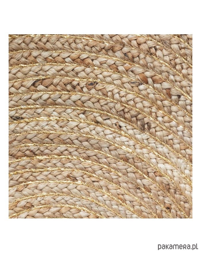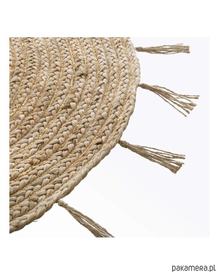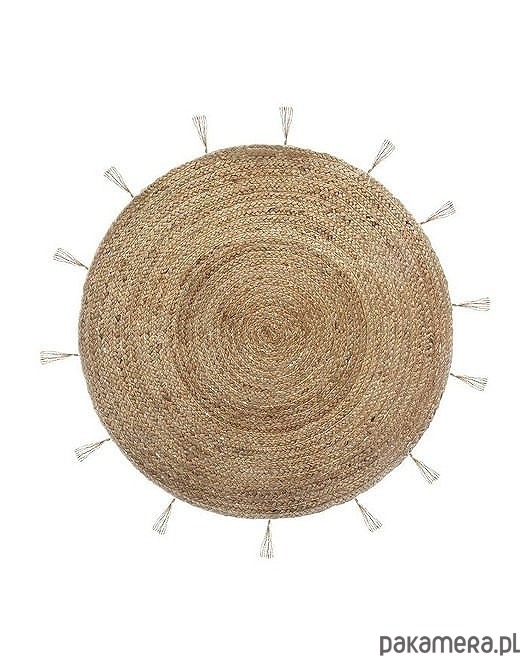 Dywan okrągły o średnicy 80 cm, wykonany z plecionej juty. W kolorze naturalnego brązu. Posiada ozdoby w postaci frędzli przymocowanych dookoła dywanu.