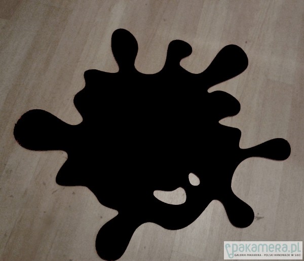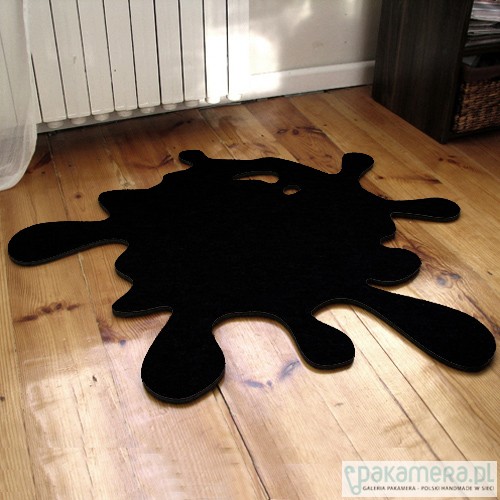 Niesamowicie oryginalny dywanik w kształcie rozlanej plamy. Wycięty laserowo i sklejony z dwóch warstw czarnego filcu grubości 4mm( cały dywan grubości 7,5mm). Dywanik kleks jest świetnym elementem zaskakującym we wnętrzu. wielkość: 80cm x 85cm z odpryskami, 60cm x 57cm (środek, gładka powierzchnia bez odprysków).