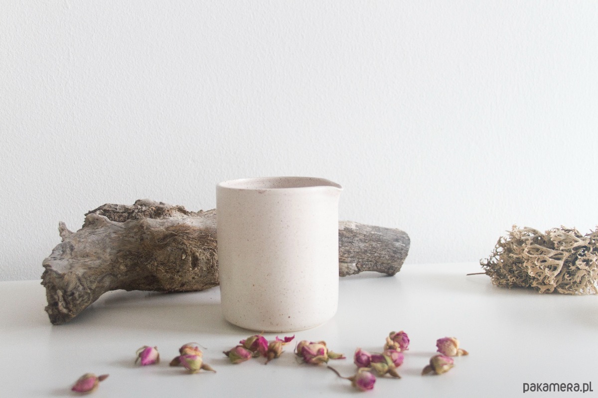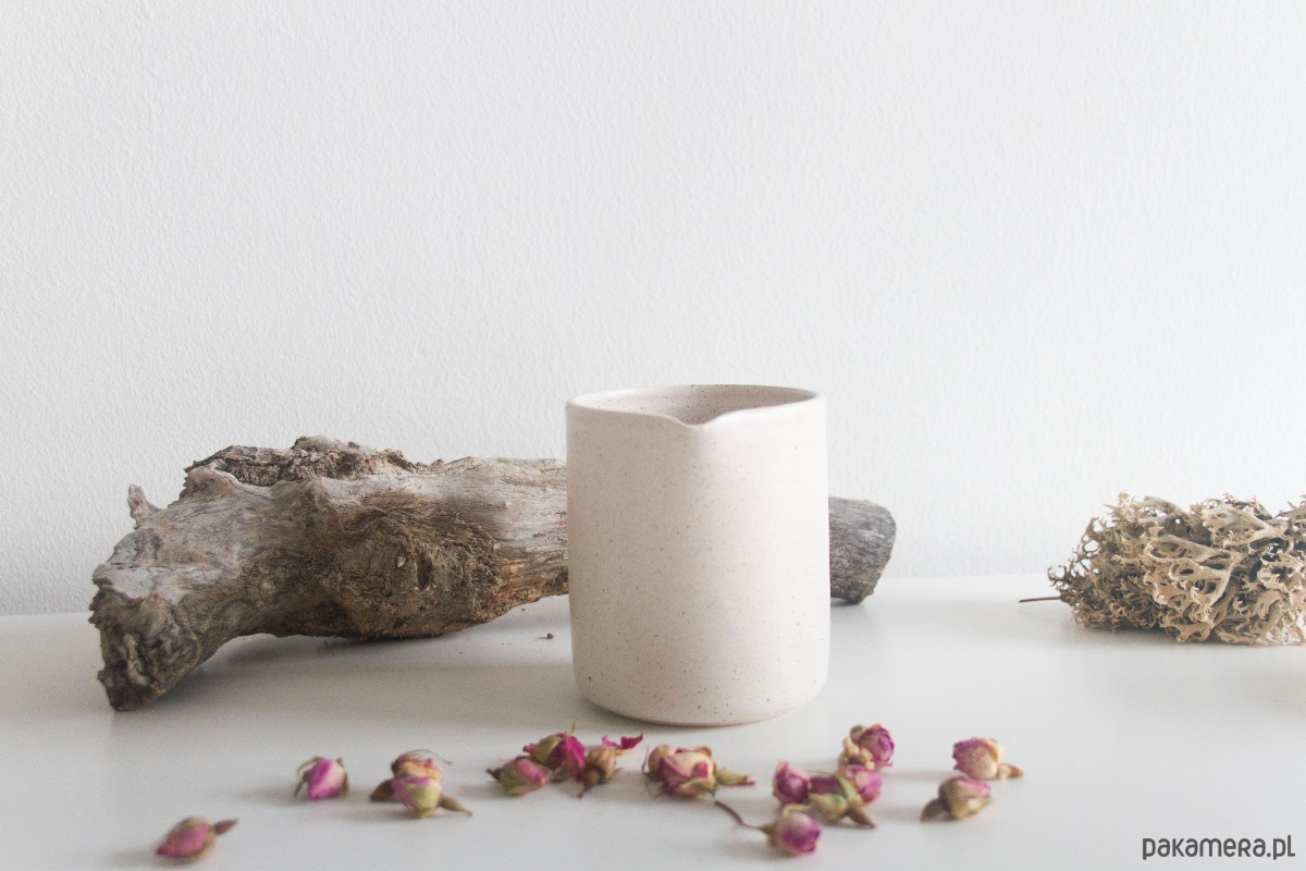 Ceramiczny dzbanek bez ucha, jasnobeżowy w subtelne kropeczki. Idealnie nada się i do kawy z drippera, i do mleka, i do wielu innych rzeczy w kuchni i jadalni.