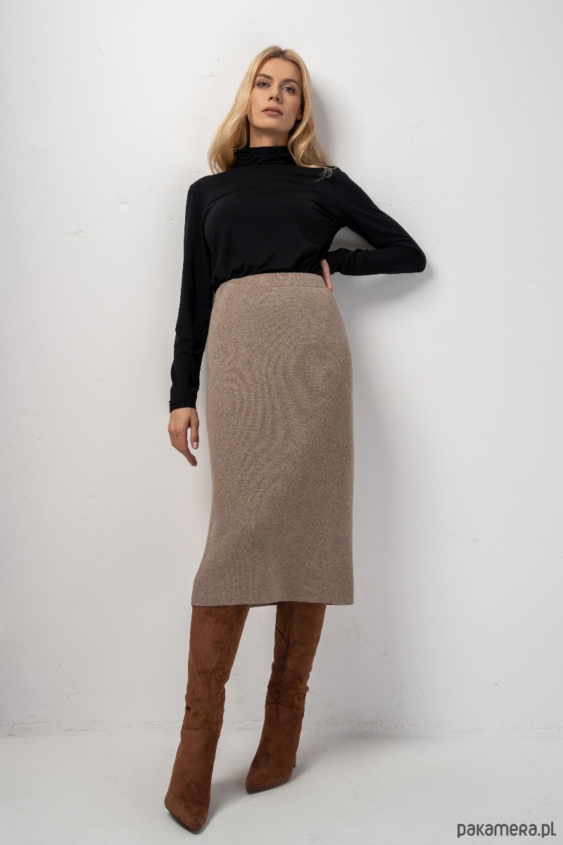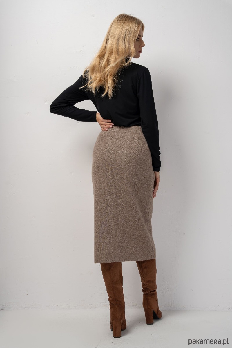 Spódnica dzianinowa z wiskozy z dodatkiem wełny i kaszmiru. Długość midi - do połowy łydki, o ołówkowym fasonie. W pasie wszyta szeroka guma. Dodatek kaszmiru sprawia, że materiał jest miękki i przyjazny dla skóry, oraz nie gryzie. Spódnicę zestawić można ze swetrem z tej samej linii, tworząc komplet ze swetrowej dzianiny.