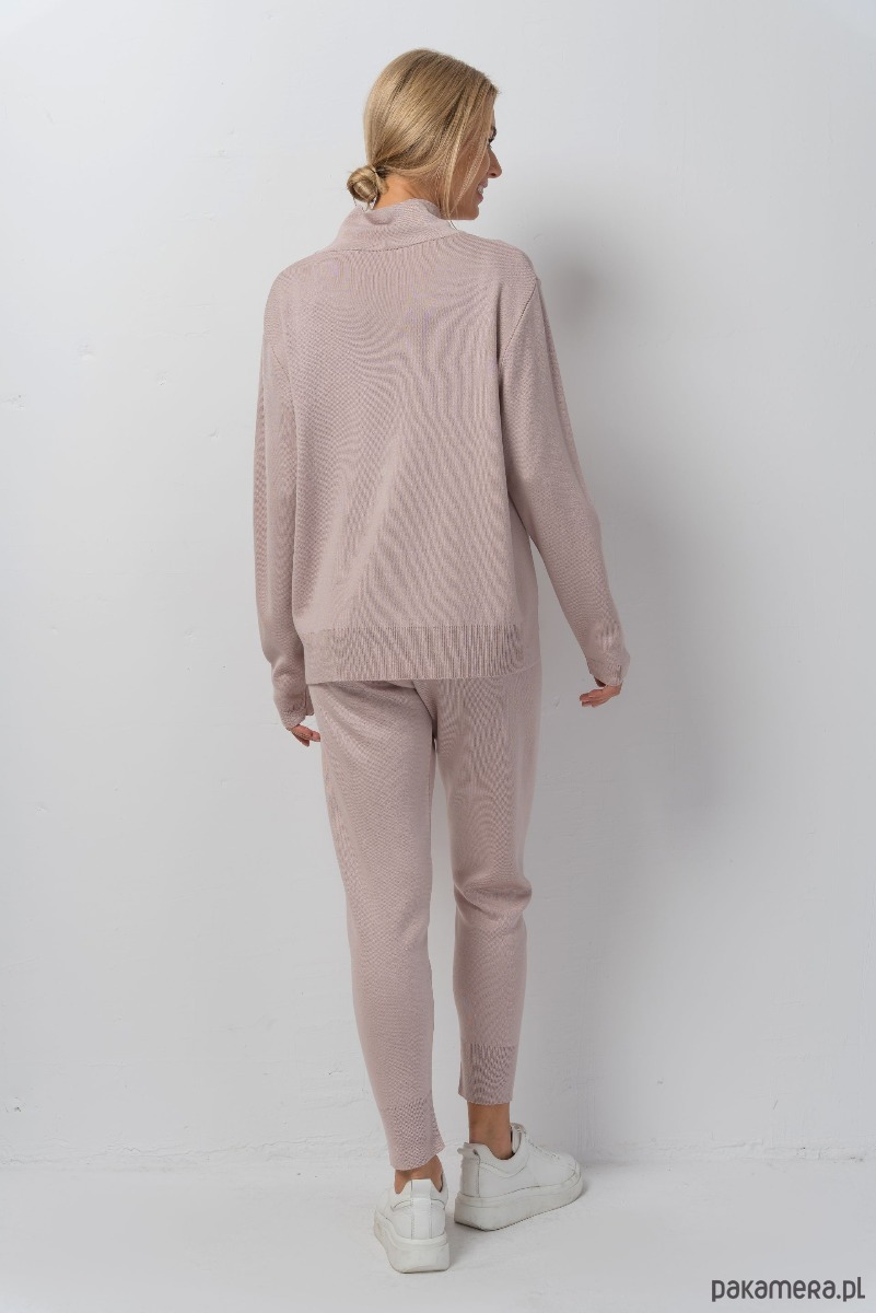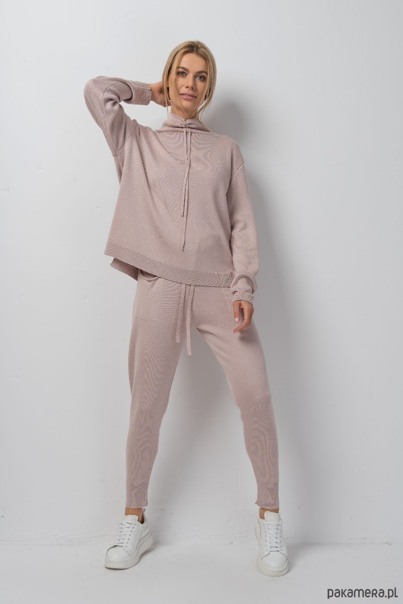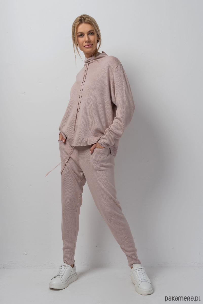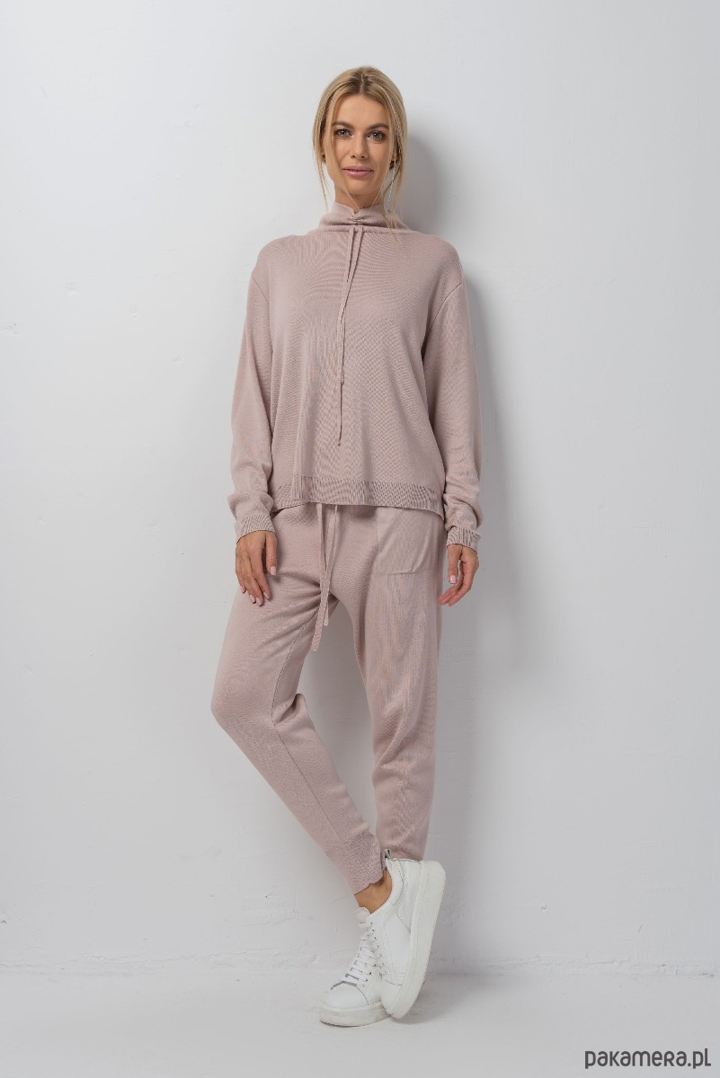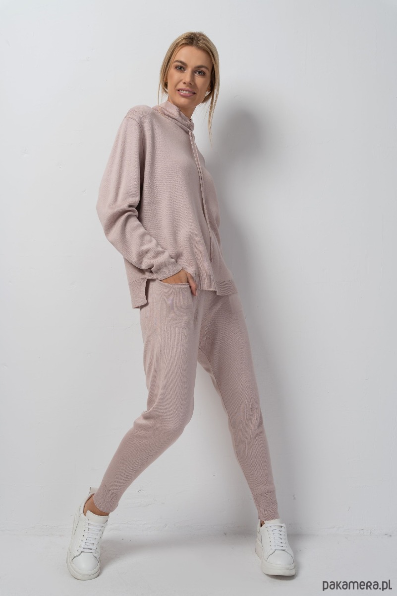 Spodnie casualowe, uszyte ze swetrowej dzianiny. W pasie wszyta szeroka guma, oraz wpuszczony w tunelu wiązany sznurek. Na przodzie dwie kieszonki otwarte od góry. Przy kostce wysoki ściągacz. Joggery zestawić można z pasującą bluzą tworząc spójny komplet.