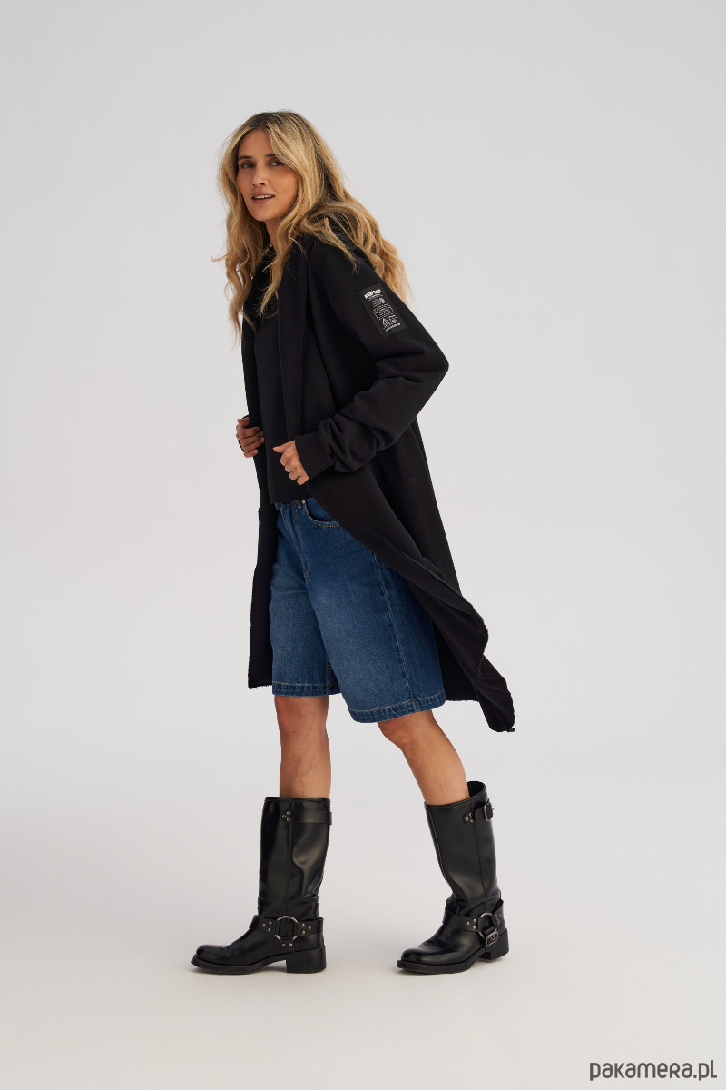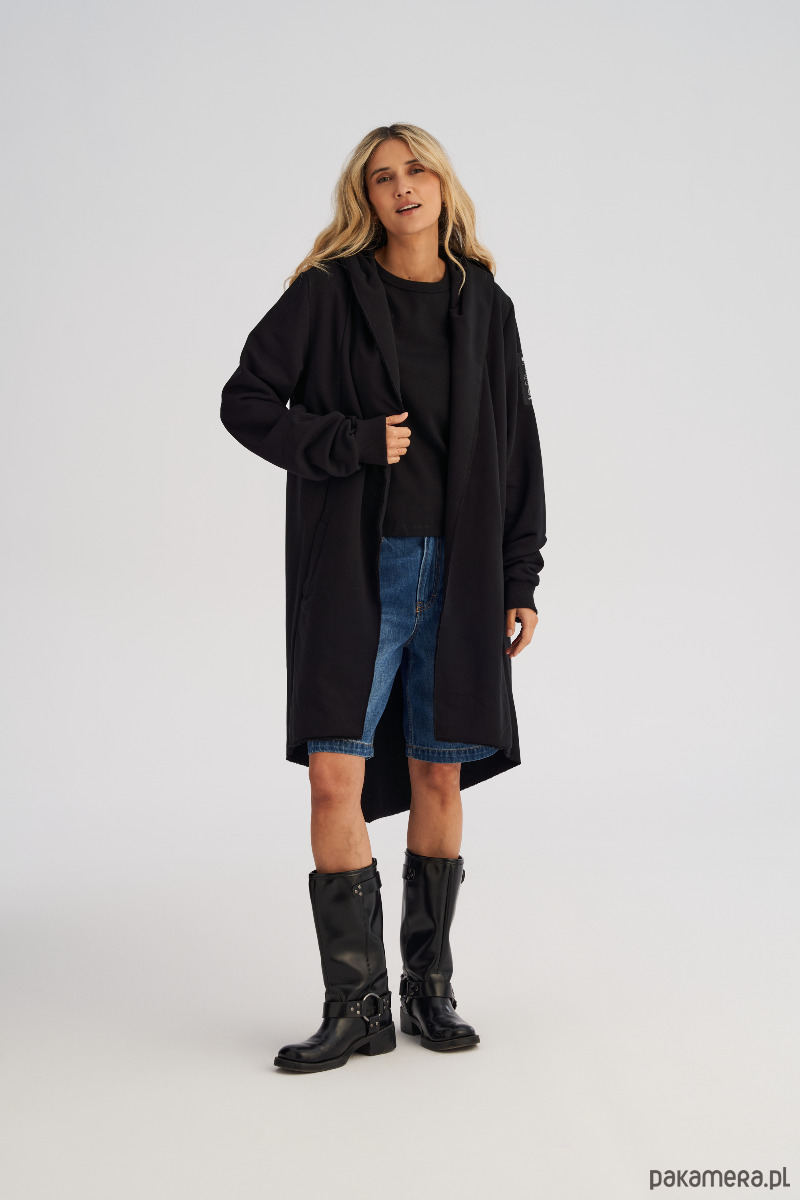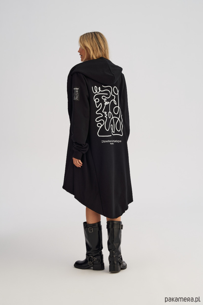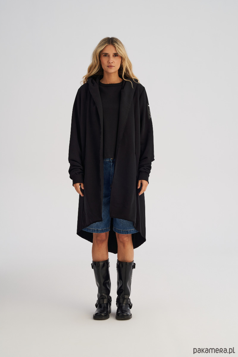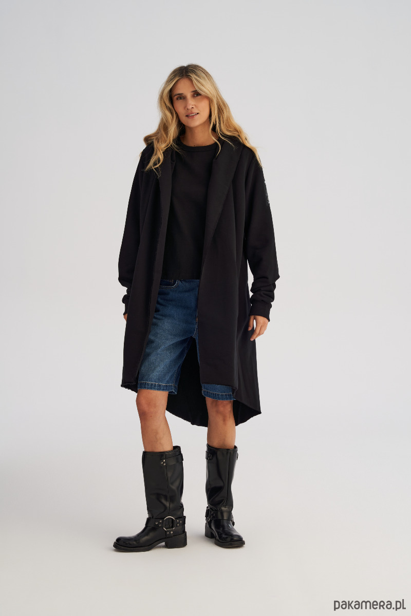 Dzianinowy płaszcz to jeden z tych elementów garderoby, w których nie da się przejść niezauważonym. Awangardowy i wyrazisty, a jednocześnie zaskakująco uniwersalny - idealny zarówno jako warstwa wierzchnia, jak i efektowna alternatywa dla bluzy. Charakterystyczny, obszerny i asymetryczny krój z krótszym przodem i mocno wydłużonym tyłem nadaje mu niepowtarzalnego charakteru. Ciężkie przednie klapy można nosić na sobie lub puścić luźno rozłożone, dzięki czemu sylwetka zyskuje nowy, dynamiczny kształt. Płaszcz posiada kaptur, rękawy zakończone ściągaczem i wpuszczane kieszenie boczne, które dodają funkcjonalności.