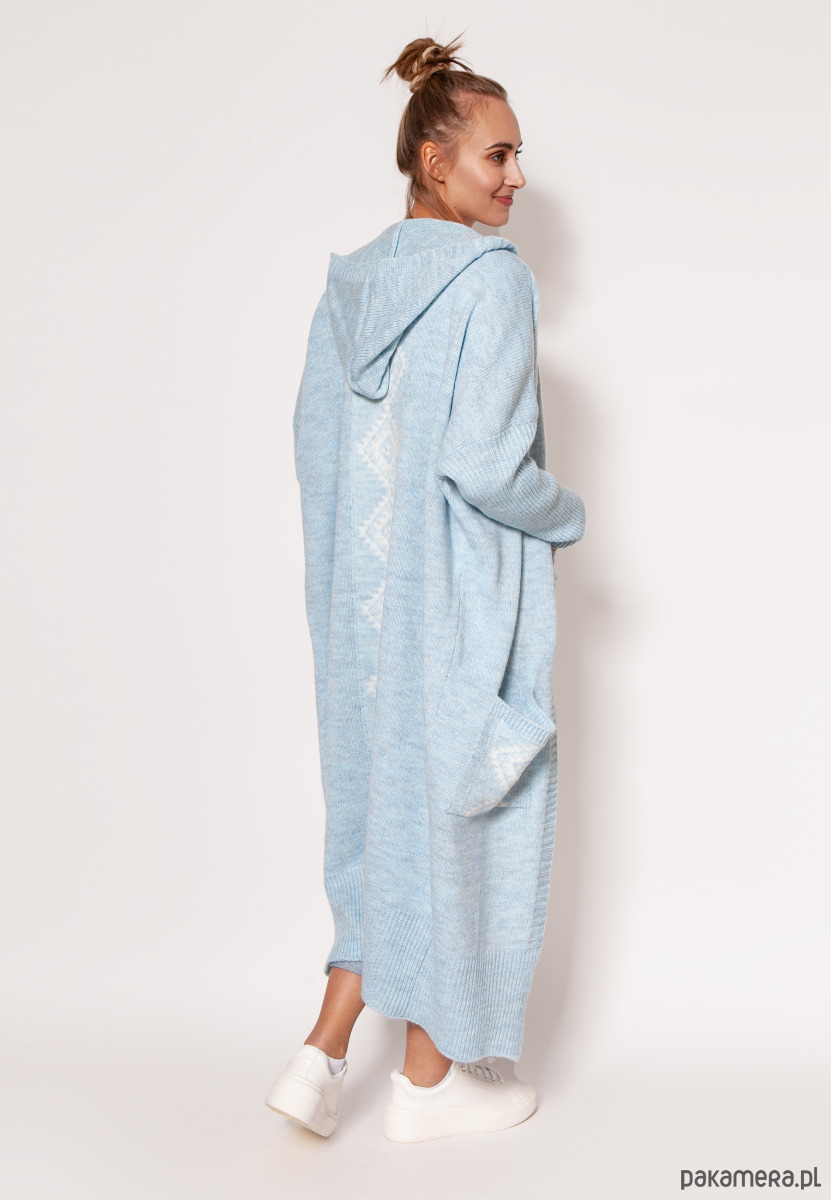 Dzianinowy płaszcz z kapturem, obok którego nie sposób przejść obojętnie. Kieszenie i tył ozdobione są interesującym motywem w stylu etno, a rękawy i dół swetra - spektakularnym, szerokim ściągaczem. Najwyższej jakości przędza gwarantuje miękkość i otulenie.